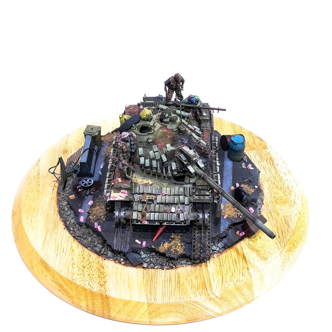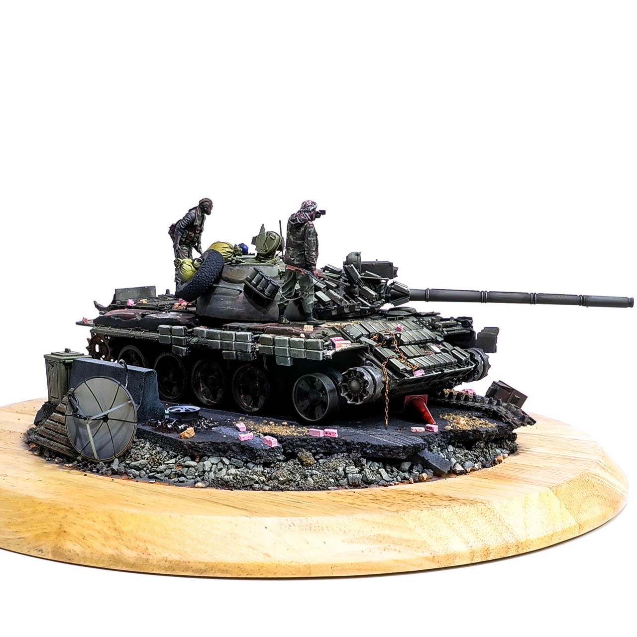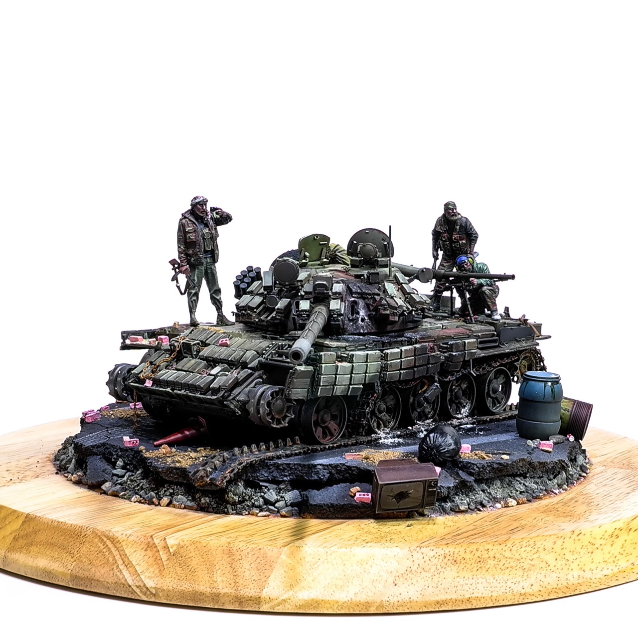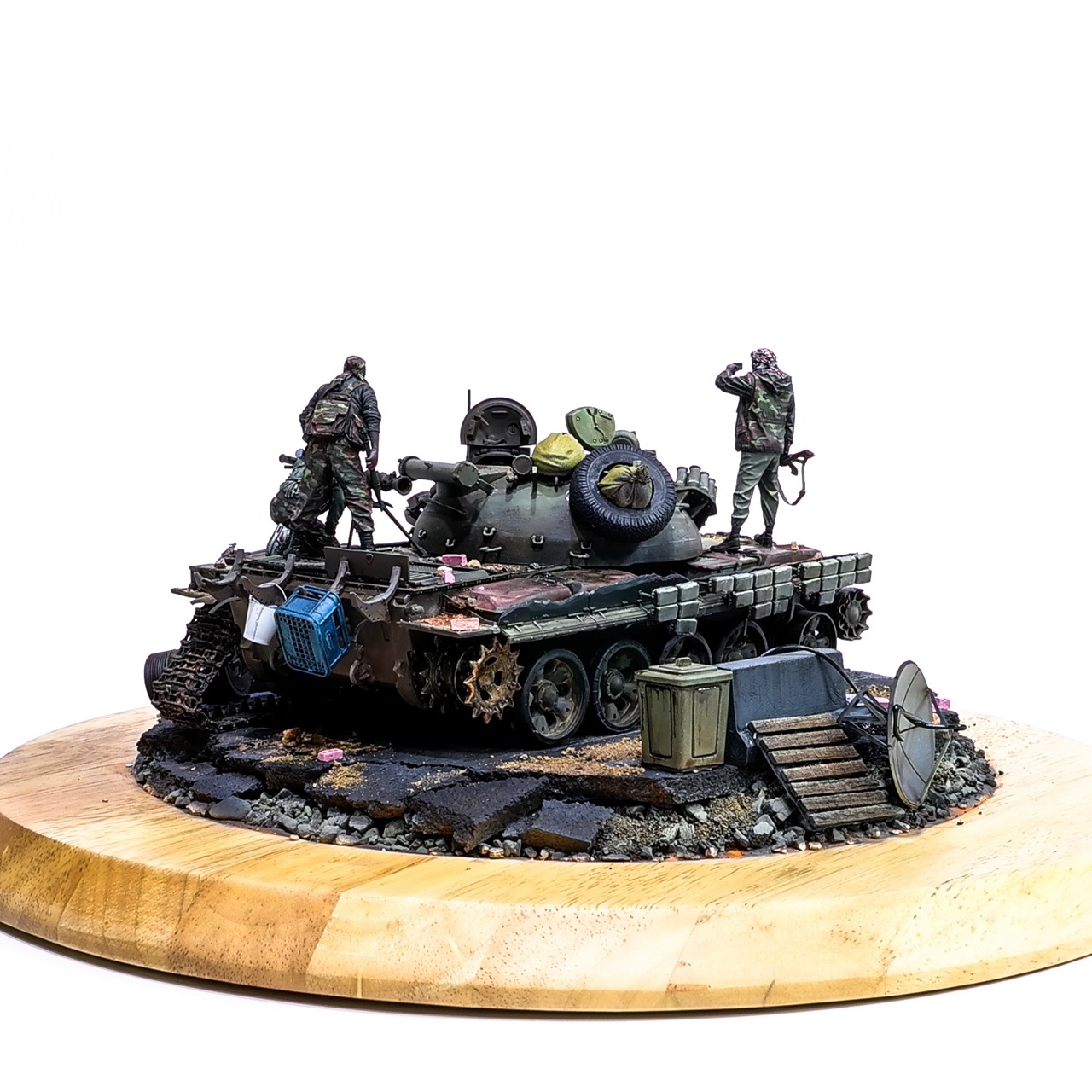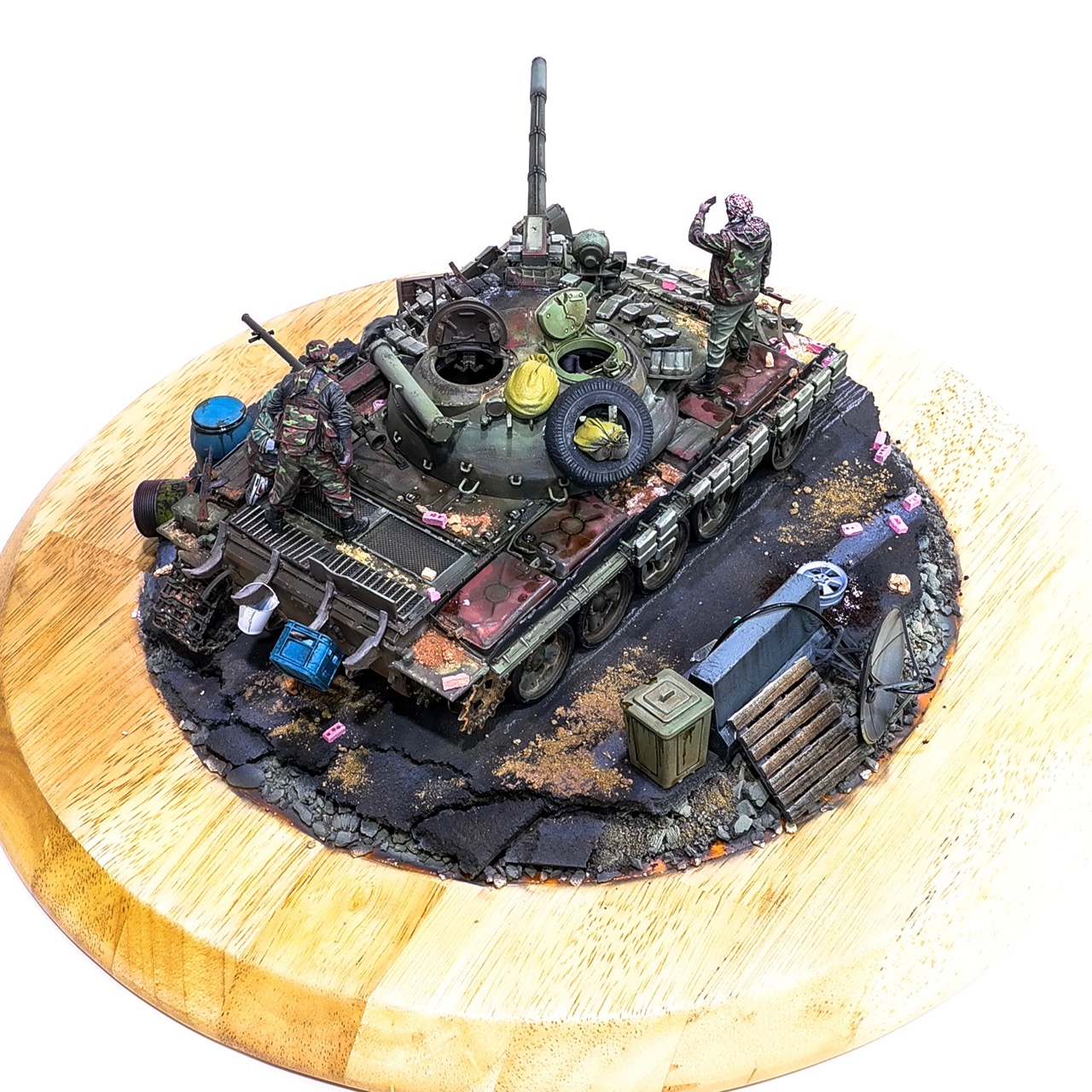 예전에 좀 썰렁하게 마무리 하기도 했고, 불에 탄 부분이 전체 색감을 잡아먹어서 마음에 들지 않던 작업이었는데 올해 다시 작업을 하였습니다. 전체 필터링, 하이라이트 작업을 다시하고 악세사리들도 추가하여 완성하였습니다..Takom사의 T-55, 인형들은 evolution사의 인형들. 시리아를 배경으로 작업하였습니다.