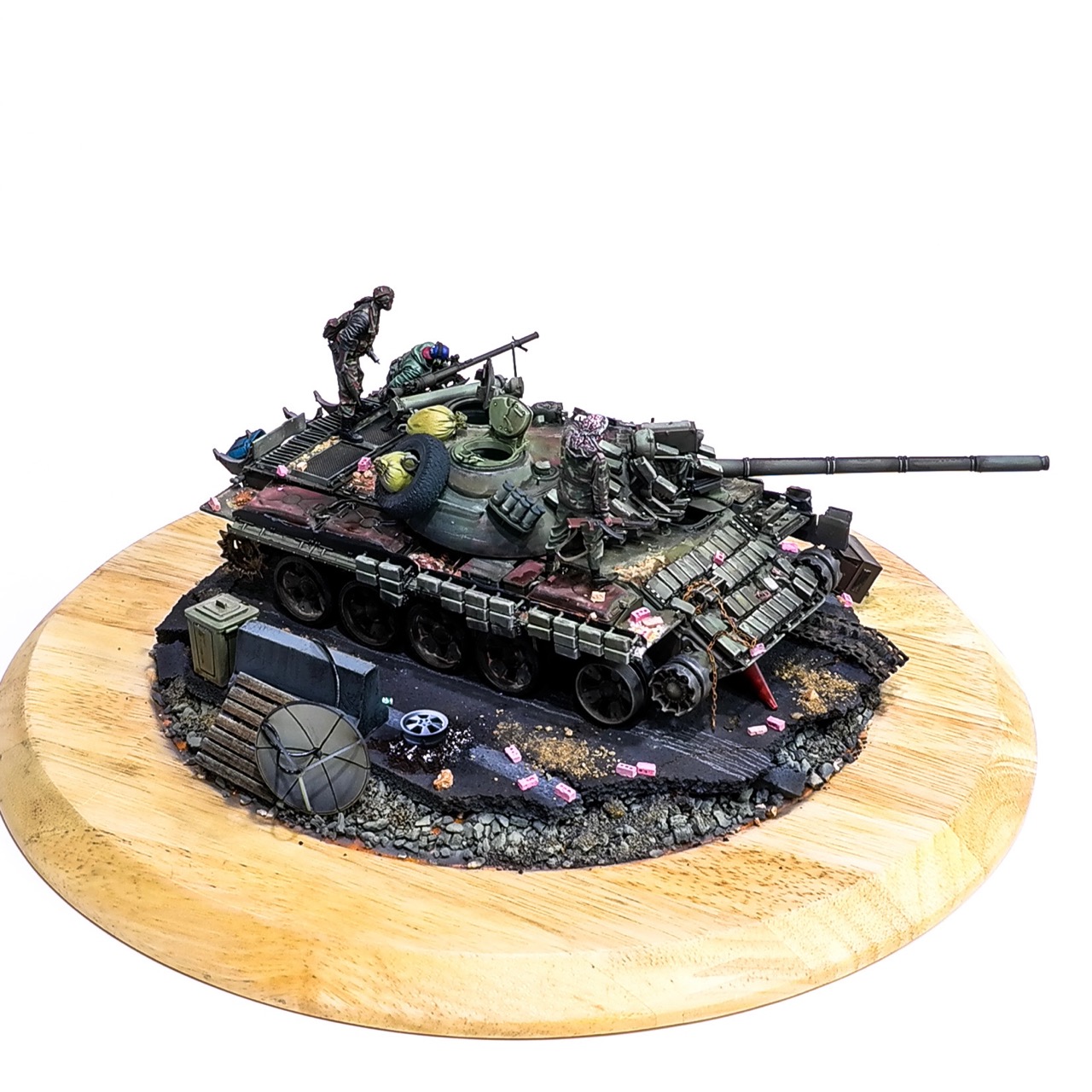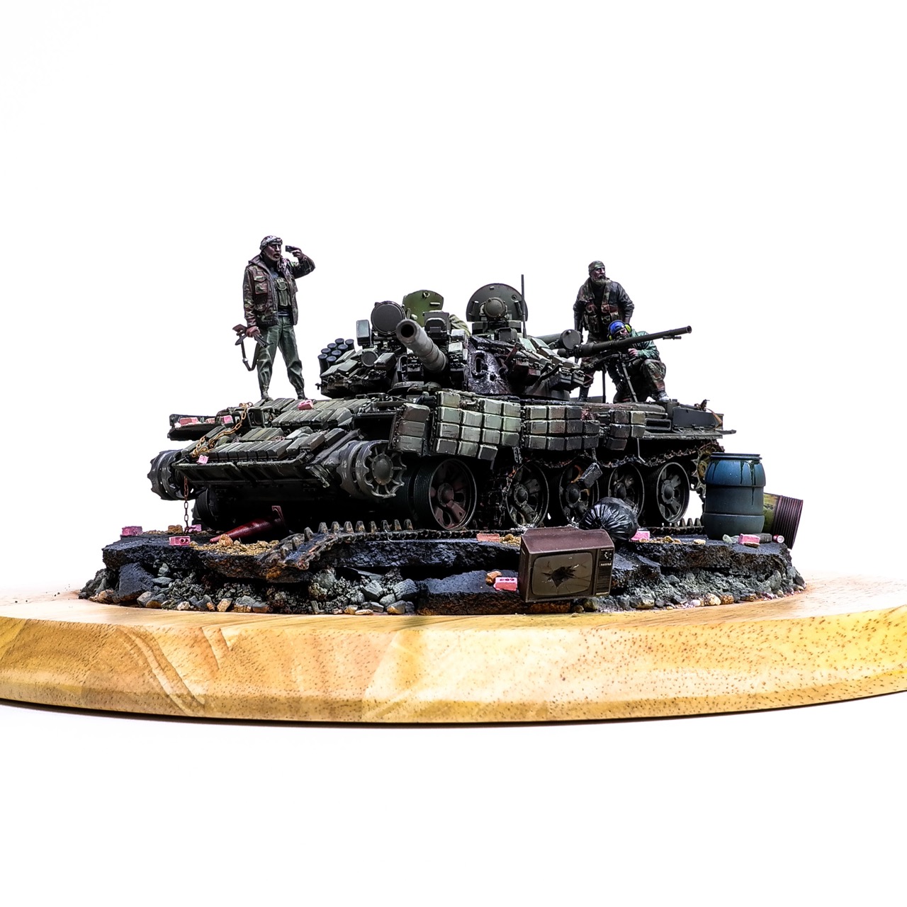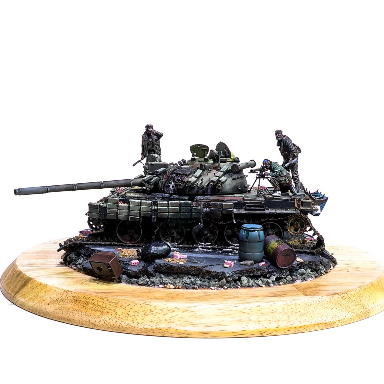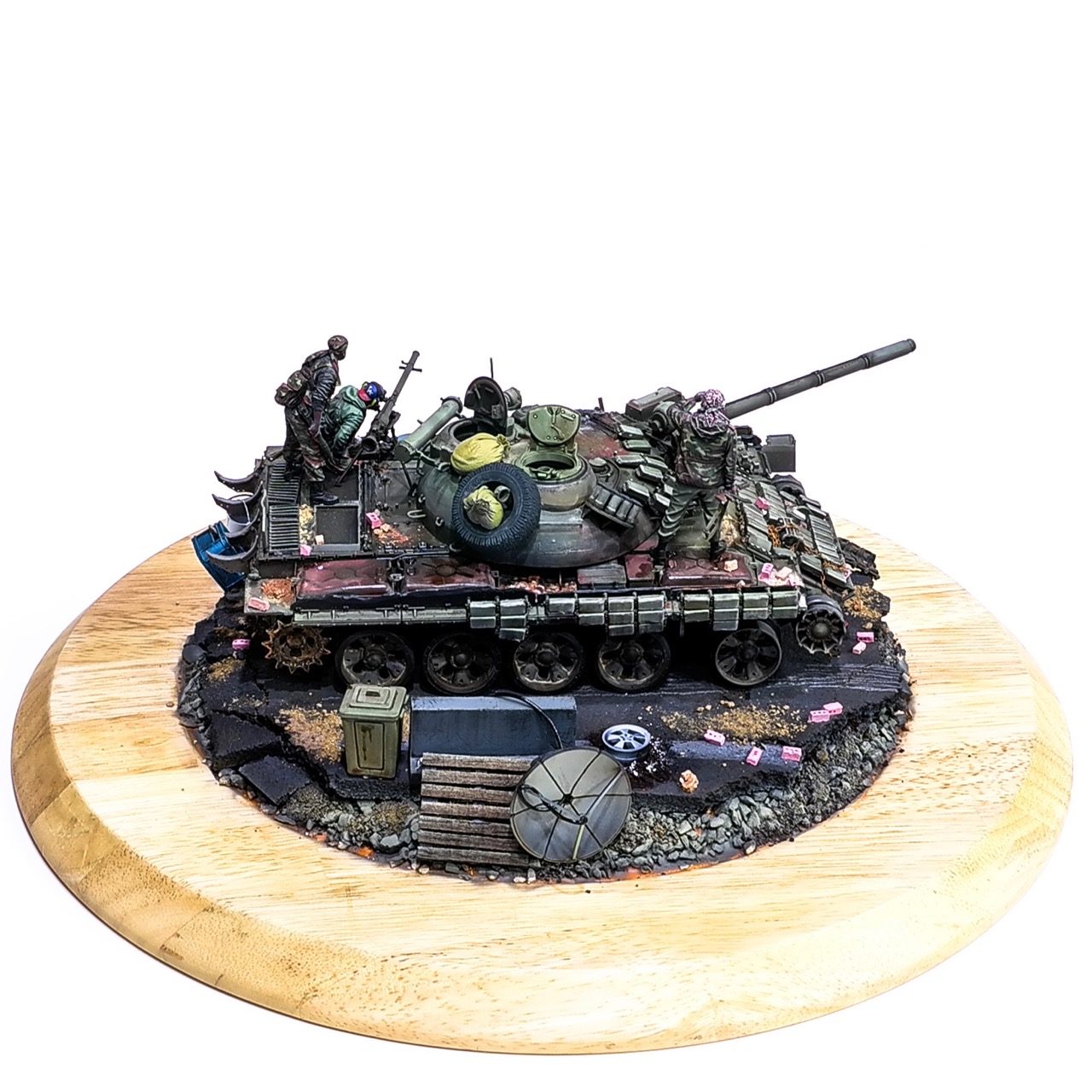 예전에 좀 썰렁하게 마무리 하기도 했고, 불에 탄 부분이 전체 색감을 잡아먹어서 마음에 들지 않던 작업이었는데 올해 다시 작업을 하였습니다. 전체 필터링, 하이라이트 작업을 다시하고 악세사리들도 추가하여 완성하였습니다..Takom사의 T-55, 인형들은 evolution사의 인형들. 시리아를 배경으로 작업하였습니다.