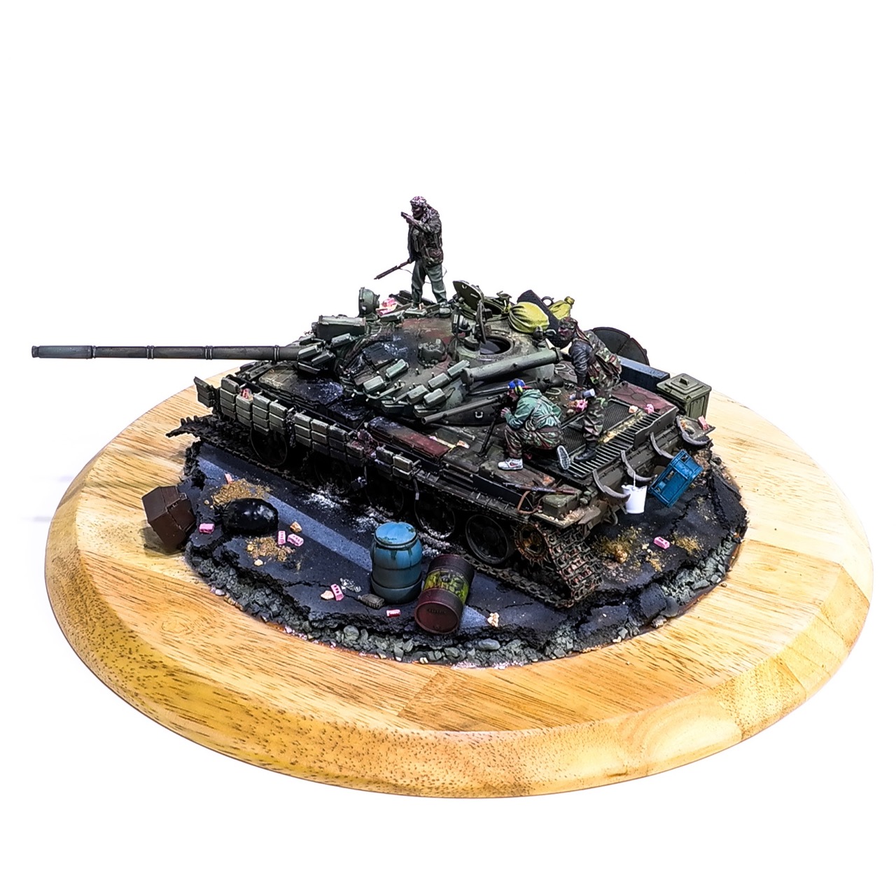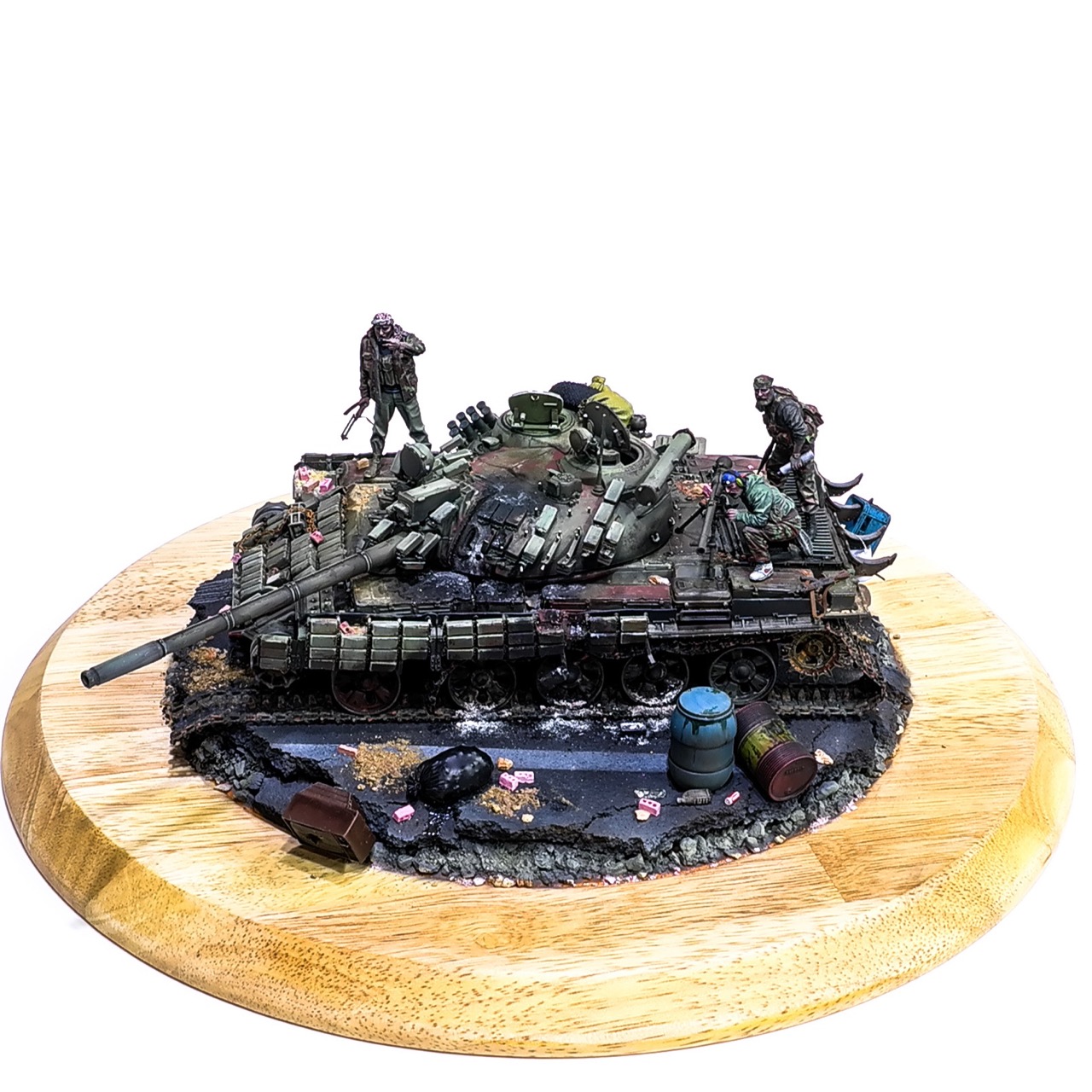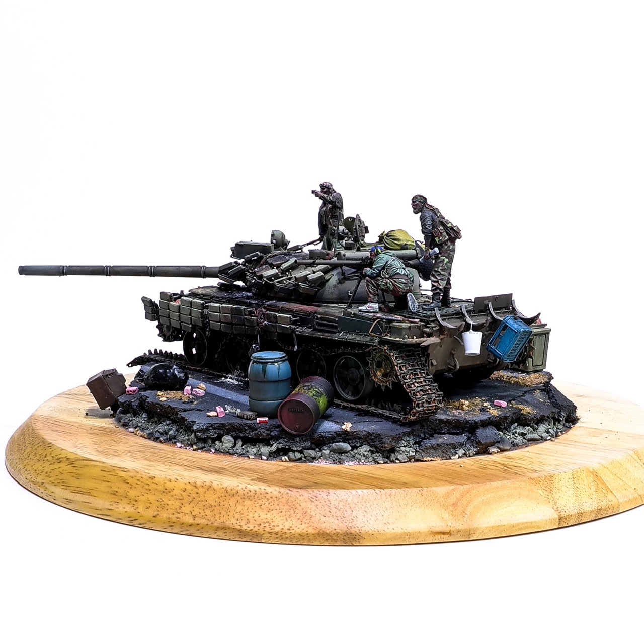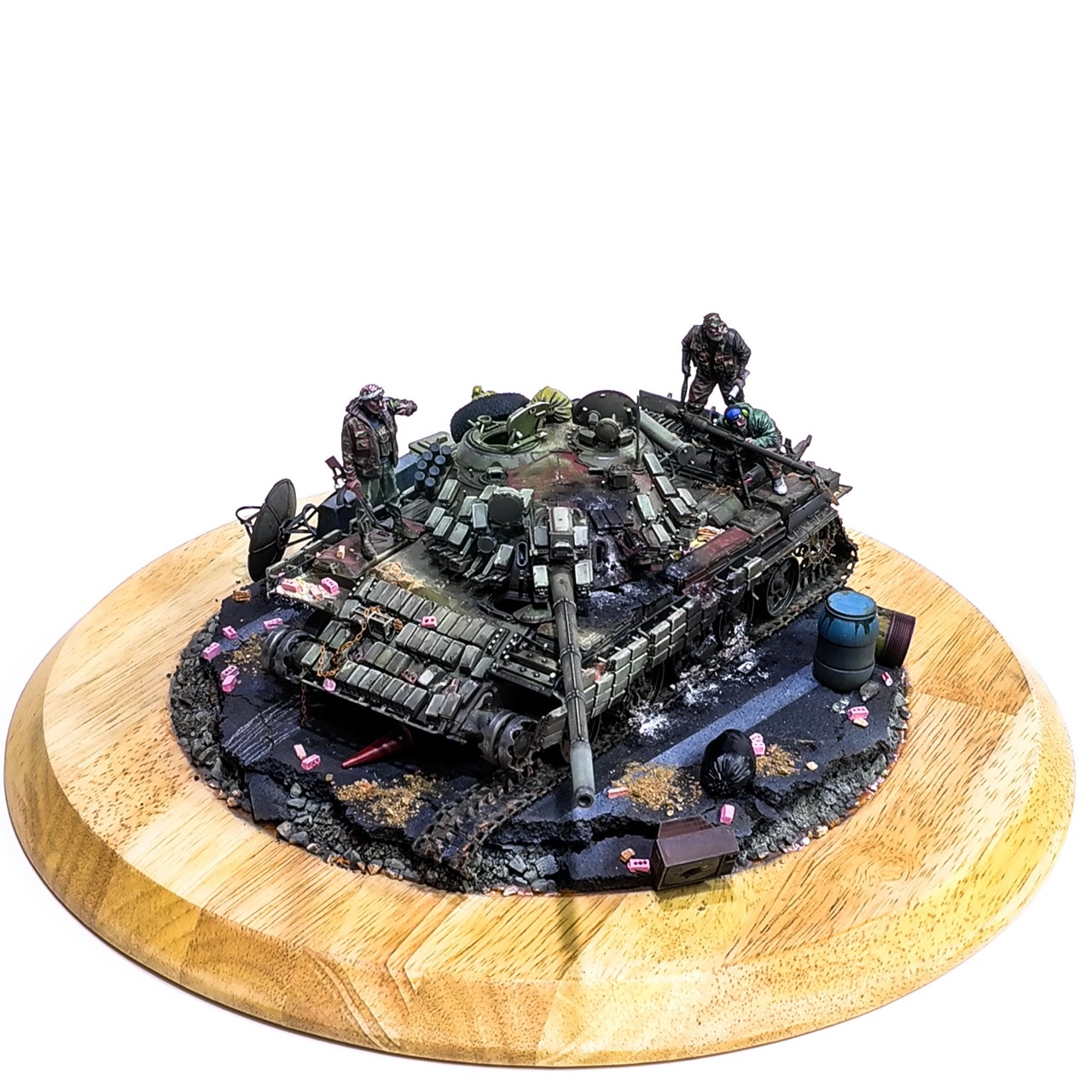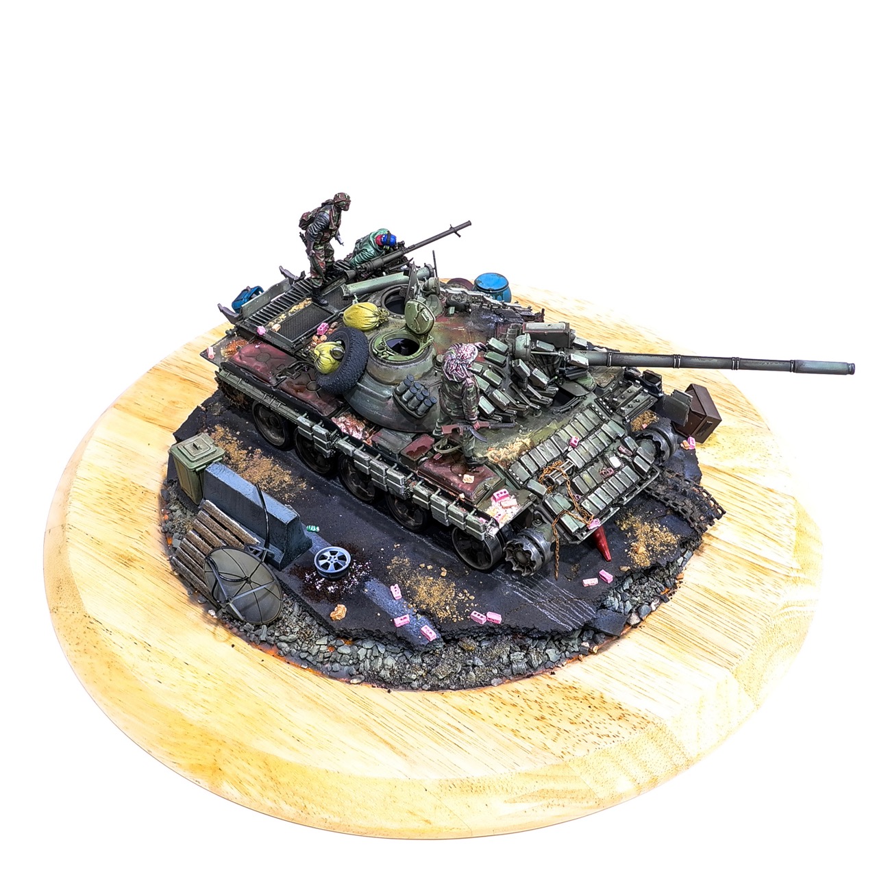 예전에 좀 썰렁하게 마무리 하기도 했고, 불에 탄 부분이 전체 색감을 잡아먹어서 마음에 들지 않던 작업이었는데 올해 다시 작업을 하였습니다. 전체 필터링, 하이라이트 작업을 다시하고 악세사리들도 추가하여 완성하였습니다..Takom사의 T-55, 인형들은 evolution사의 인형들. 시리아를 배경으로 작업하였습니다.