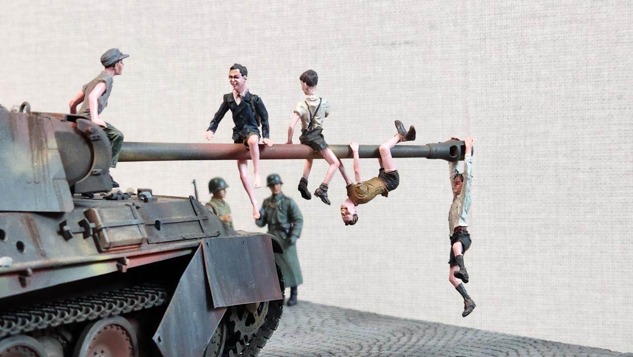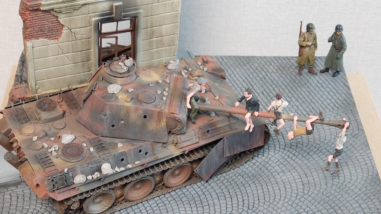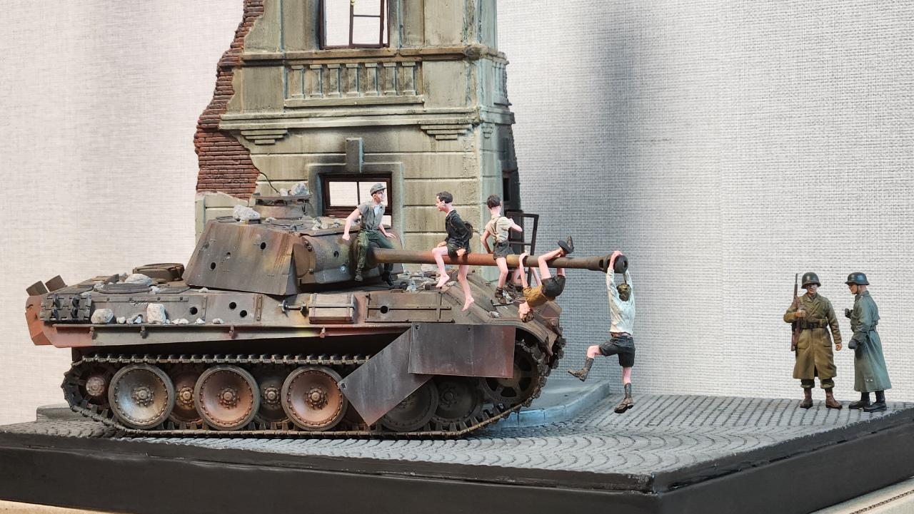 2차대전 직후 1945년 6월 경 서부독일의 도시에서 폭격으로 무너져내린 건물 옆에 파괴된 판터를 놀이터 삼아 노는 아이들입니다...