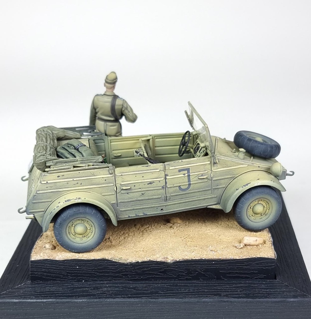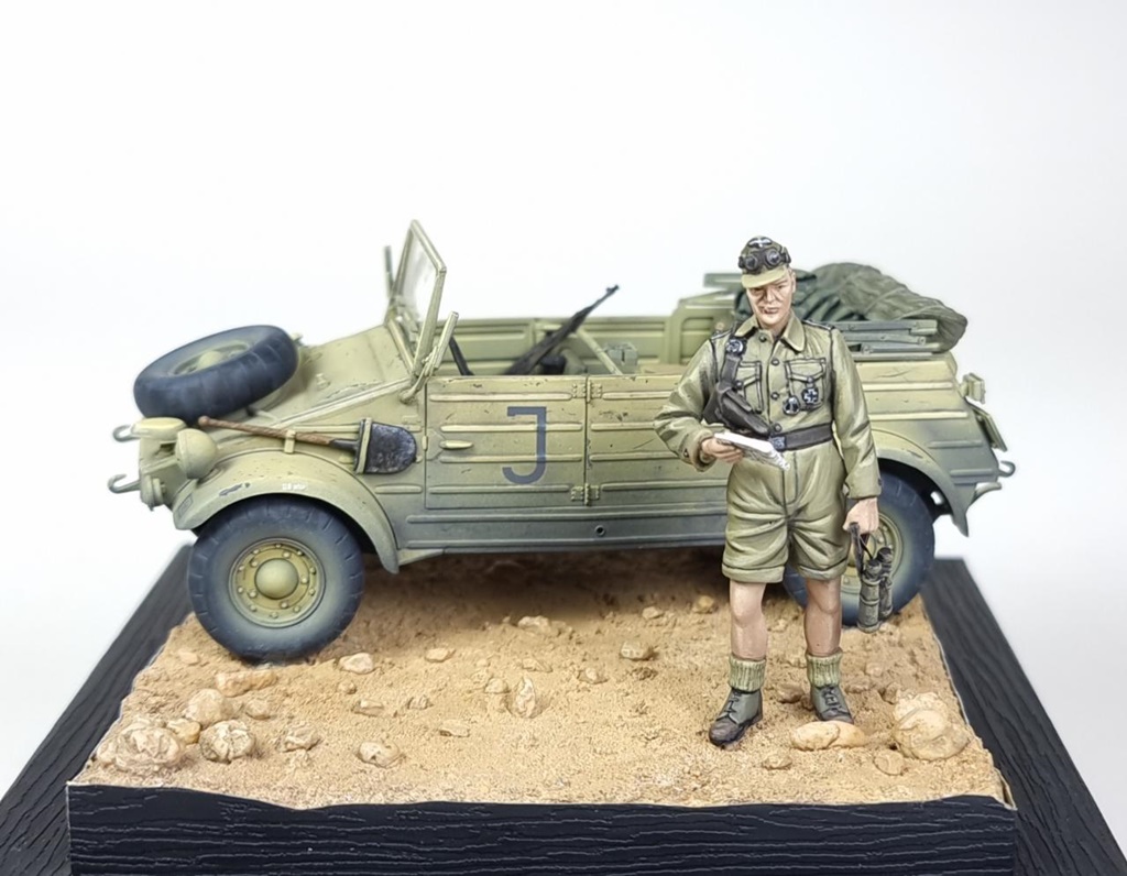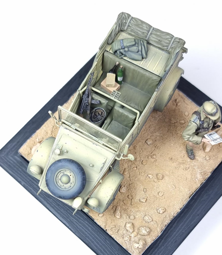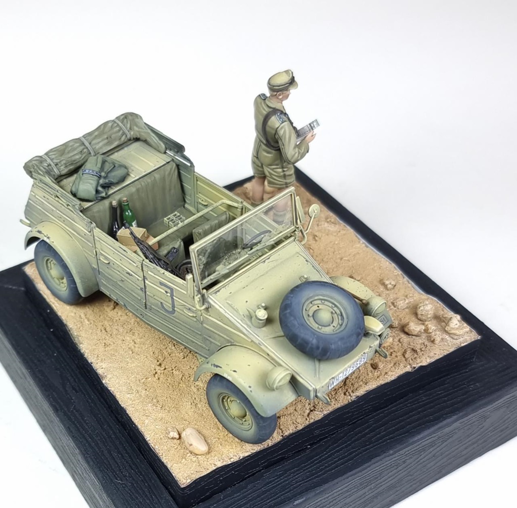 타미야의 퀴벨바겐을 만들고 벨린덴의 피규어와 함께 간단하게 꾸며보았습니다. 악세사리 추가 외에 별매품 적용은 하지 않았습니다. 차량이 작은 만큼 눈에 잘 들어오도록 칠하는데 중점을 뒀습니다. 왠만한 명암과 먹선은 에어브러싱 후에 붓으로 그려넣어줬고, 실전적인 웨더링보다는 쨍한 일러스트같은 느낌을 주려고 했습니다.