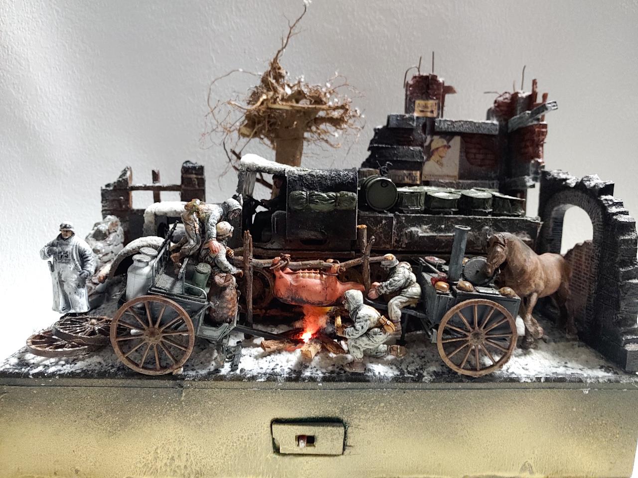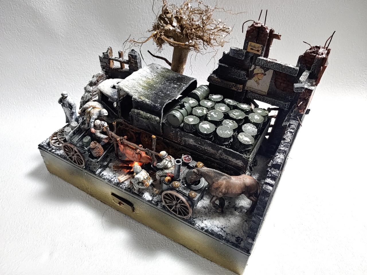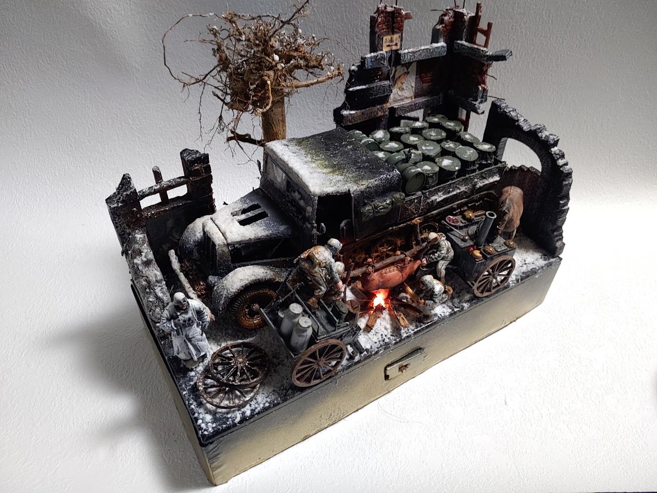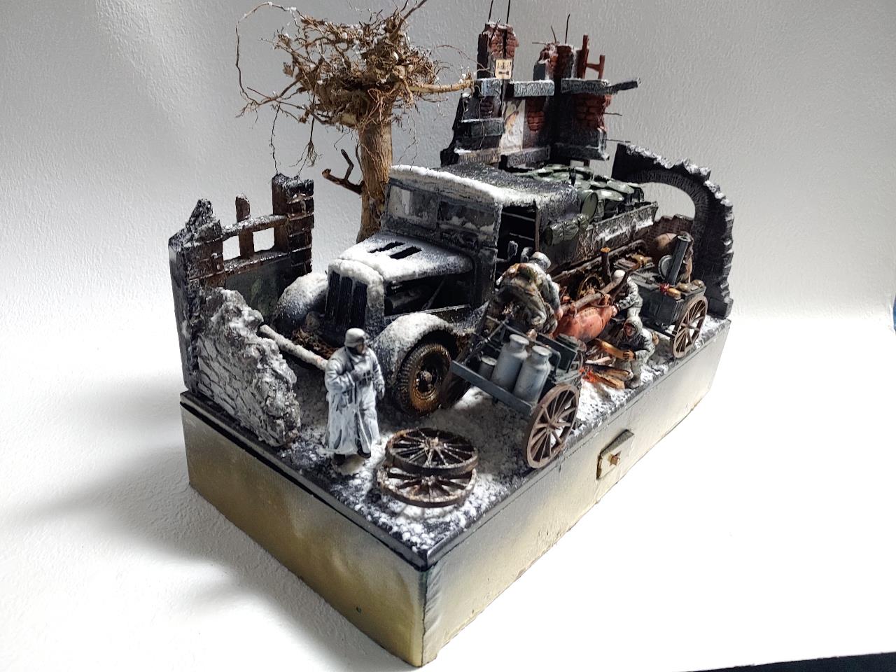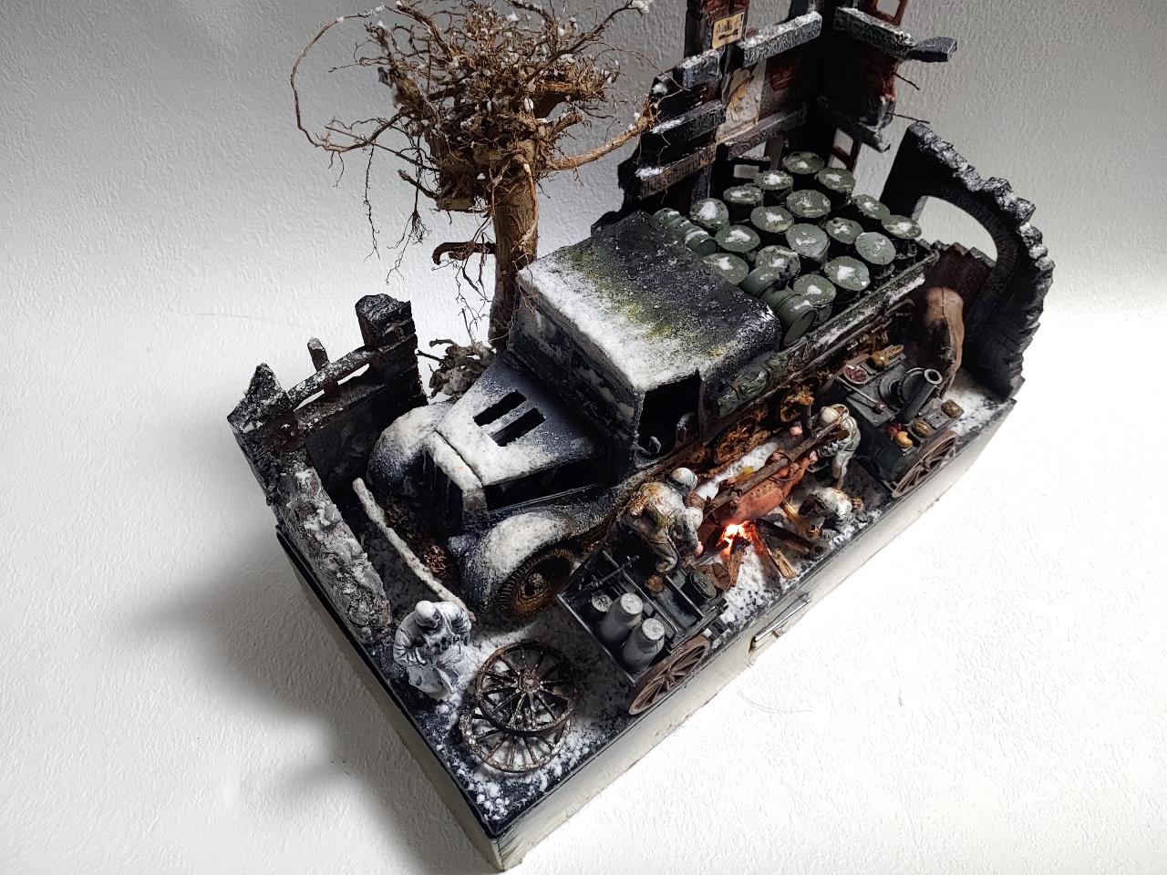 귀찮고 굴러다니는 놈들로 짜집기해서 코코블럭 맞추듯 맞춘 디오라마입니다.짜집기하는 재미가 왠지 쏠쏠하군요 ㅋㅋ설명보다 사진을 보시면 더 잘아시겠지만 간단히 설명하자면 타미야 파모와 쉴드카 우드락 자작 건물 지면은 잘안보여 지면의 눈표현을 그냥 석고뿌린뒤 석고가 젓을 정도로 분무기로 마구 뿌렸습니다.눈표현은 타미야 눈표현제를 사용 했는데 이대영 선생님의 눈표현을 보니 타미야 눈표현제가 아닌듯 합니다.