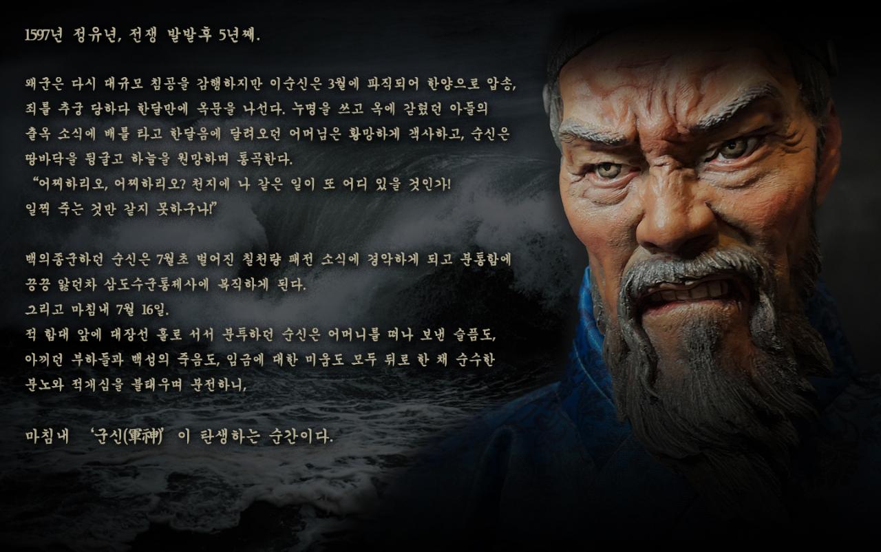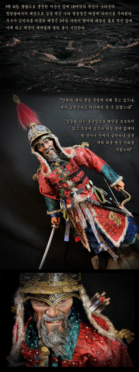 얼굴은 이순신 장군 5대손인 이봉상 장군 초상을 토대로 하고 정유년 명량해전 당시 비참하고 원통하며 순수한 분노의 화신과도 같았던 충무공의 복합적인 감정을 '전신사조' 바탕으로 해석해 봤습니다.