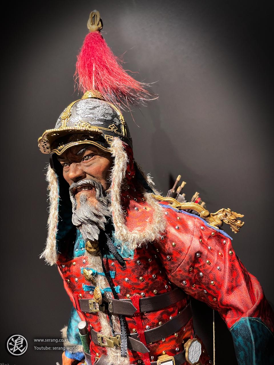 착용한 갑주는 기록에만 존재하는 최고위급 갑옷인 '홍단자 녹피 두두미갑'입니다.