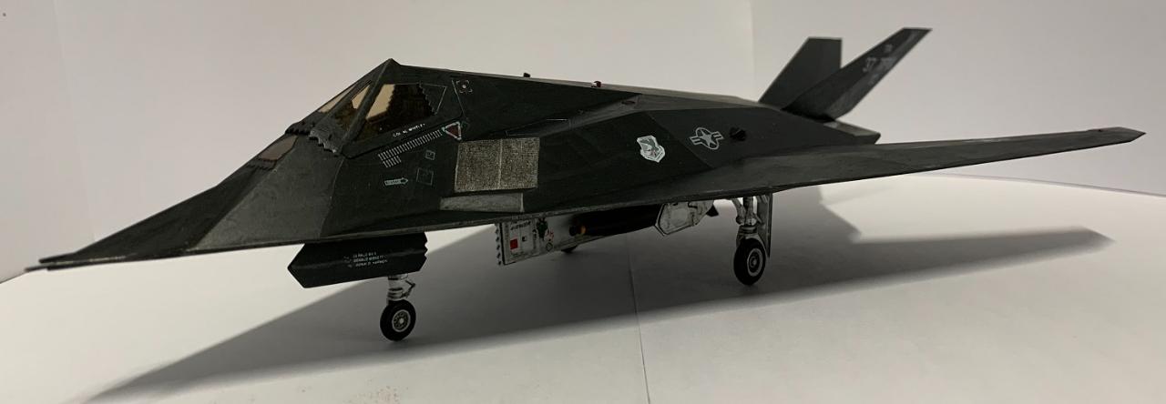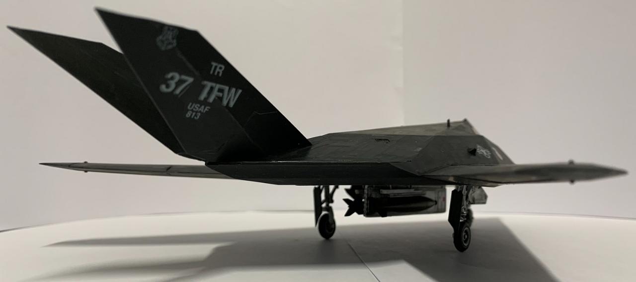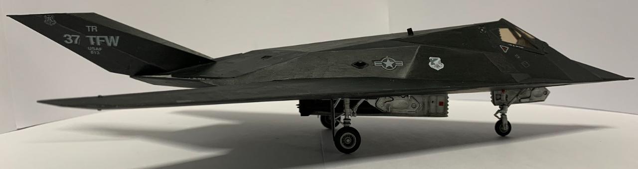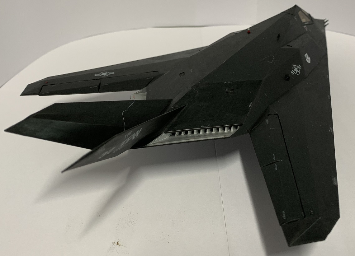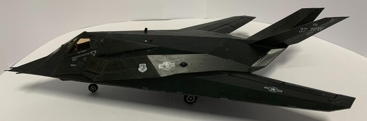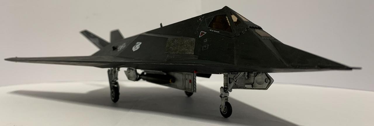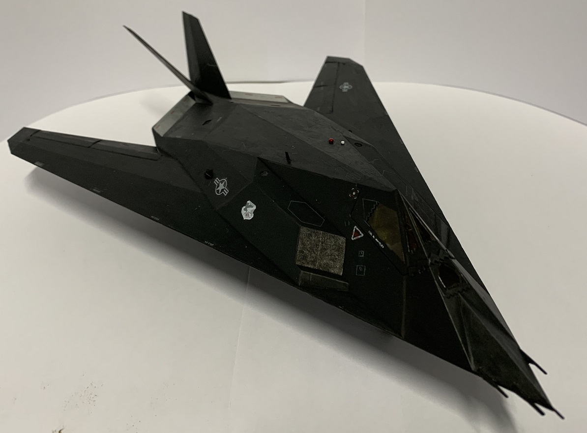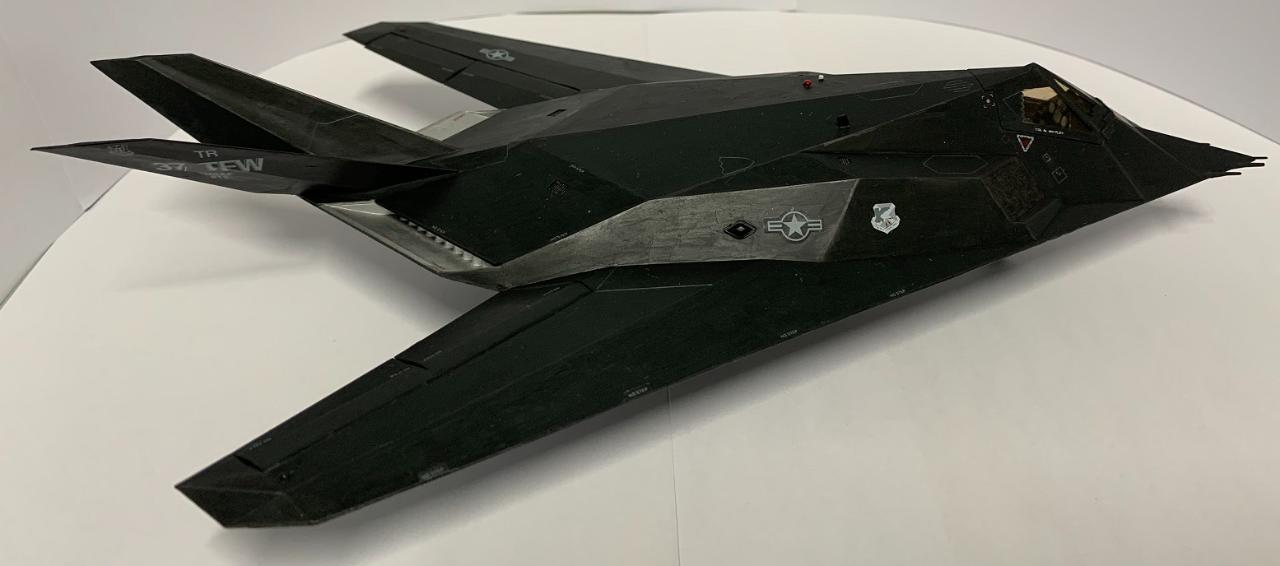 작품은 키트 기본 부품과 전사지를 그대로 사용했고, 타미야 아크릴 붓도색으로 작업했습니다. 그리고 F-117 특유의 각은 모서리 부분을 4B 연필로 문질러서 강조해 줬습니다.