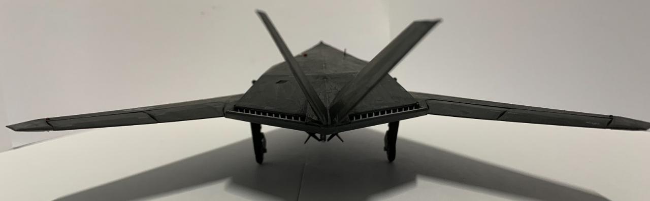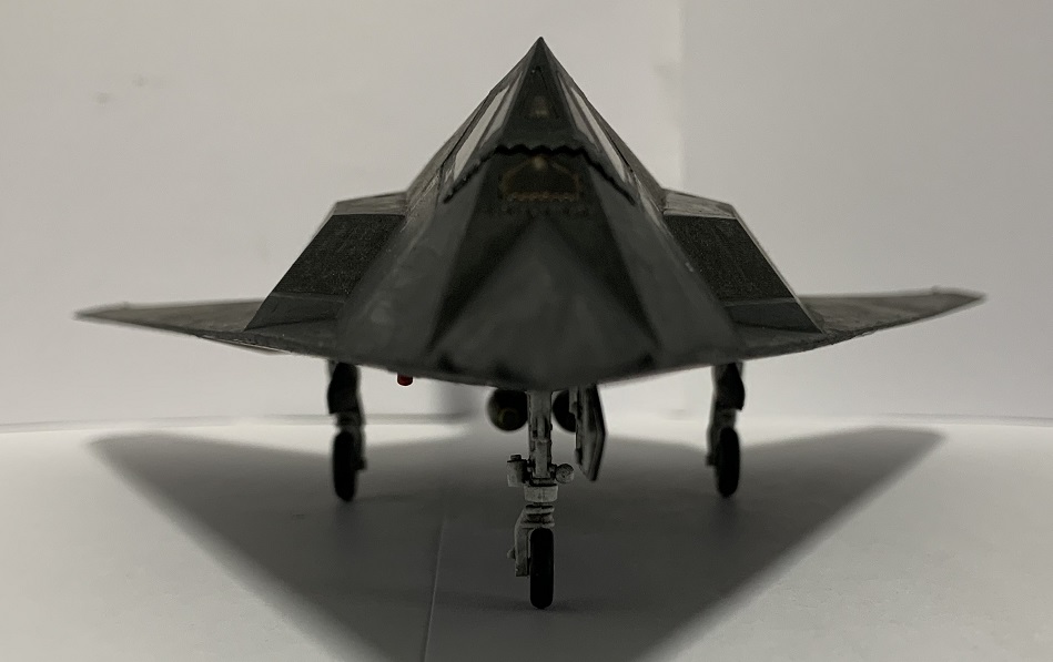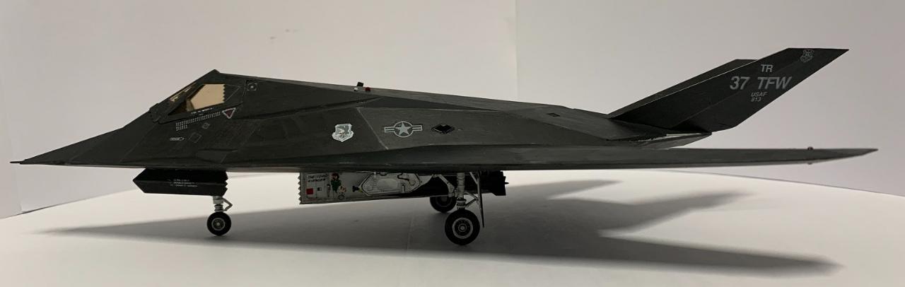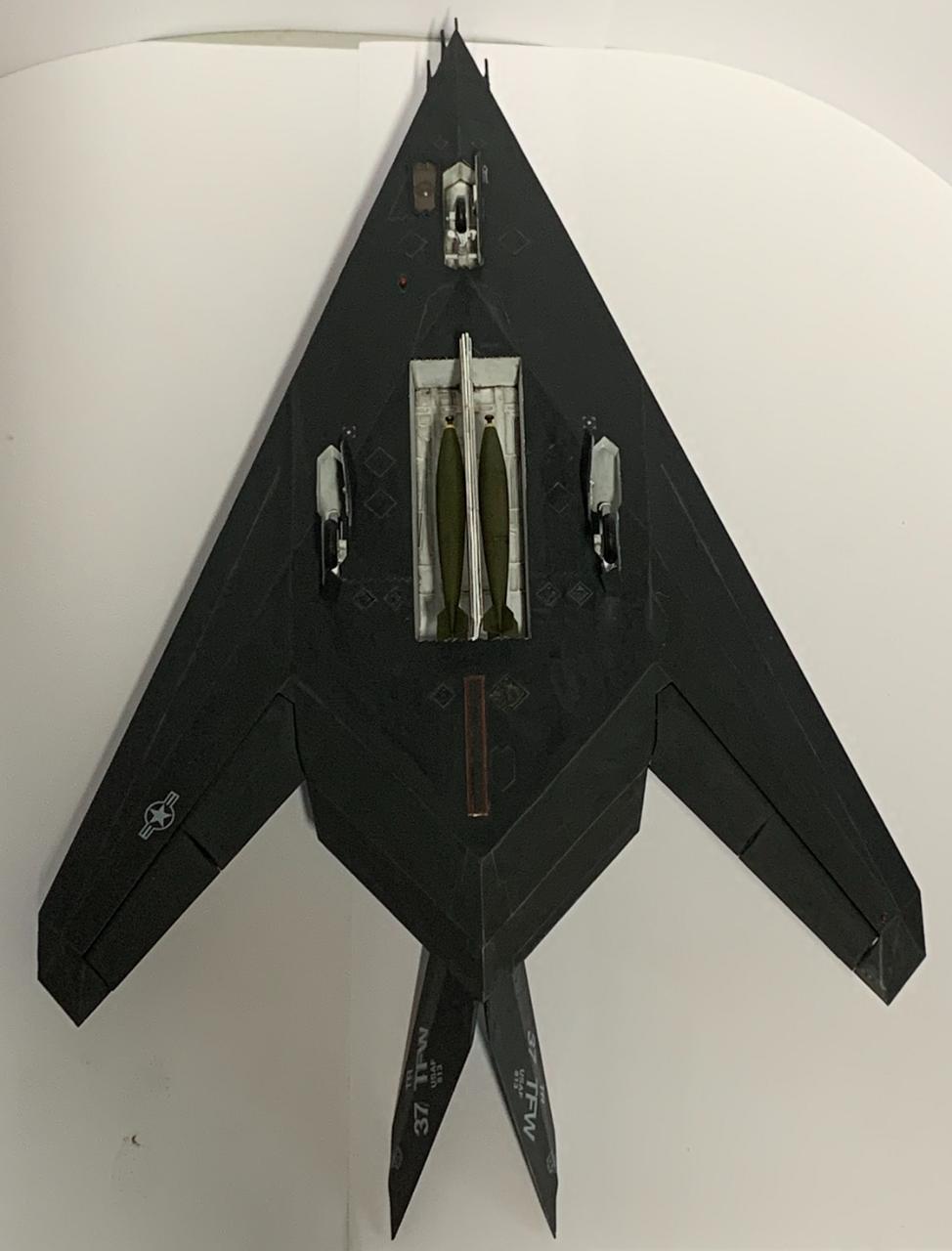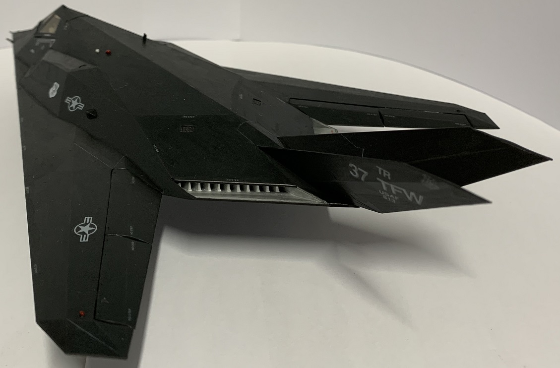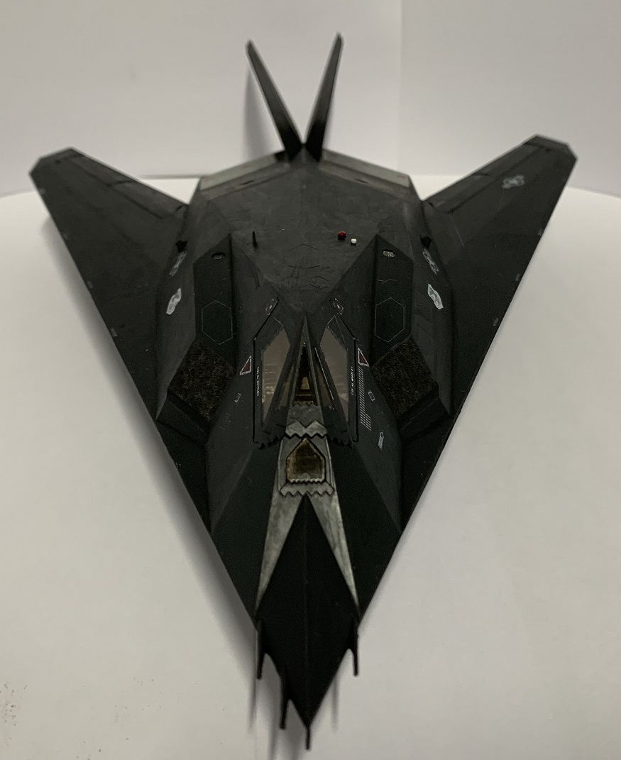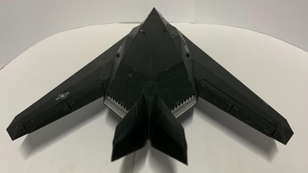 작품은 키트 기본 부품과 전사지를 그대로 사용했고, 타미야 아크릴 붓도색으로 작업했습니다. 그리고 F-117 특유의 각은 모서리 부분을 4B 연필로 문질러서 강조해 줬습니다.