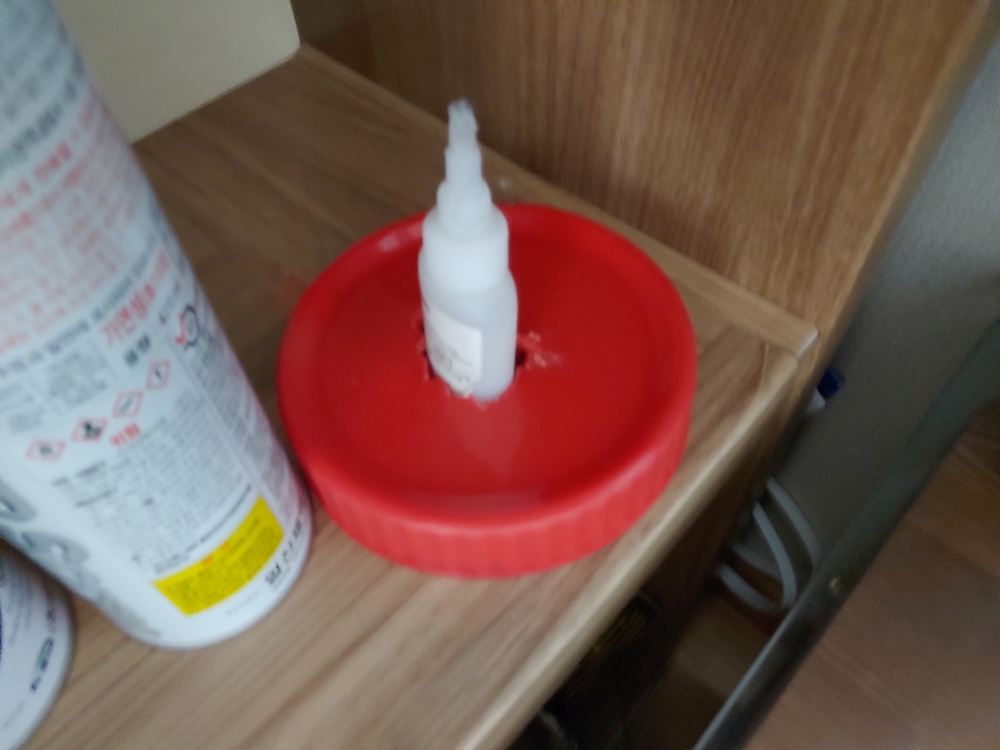 자꾸 작업중 본드가 쓰러져 이불에 묻는데 방지키 위해 용기 뚜껑에 구멍내서 끼웠습니다.