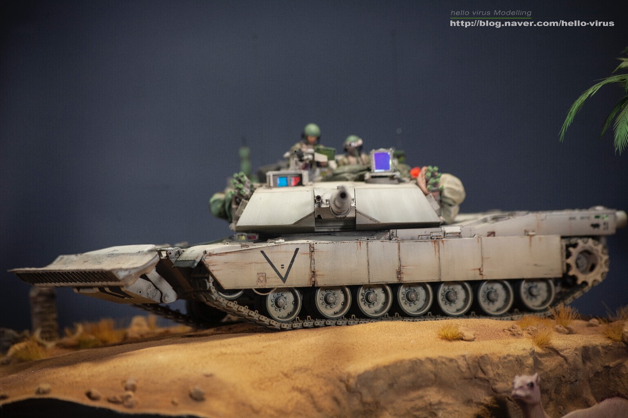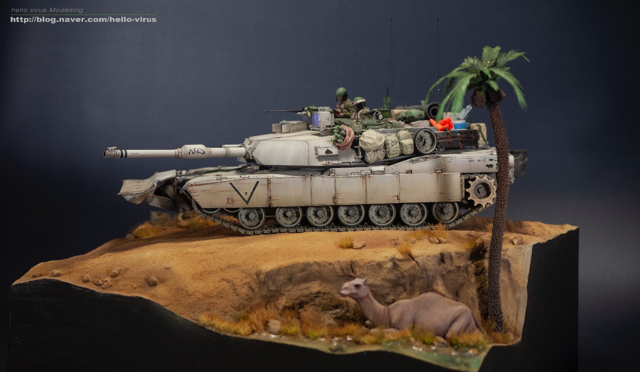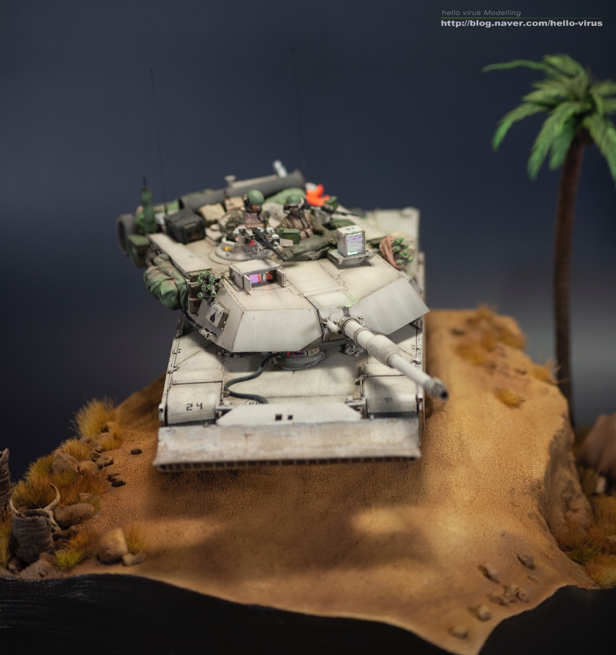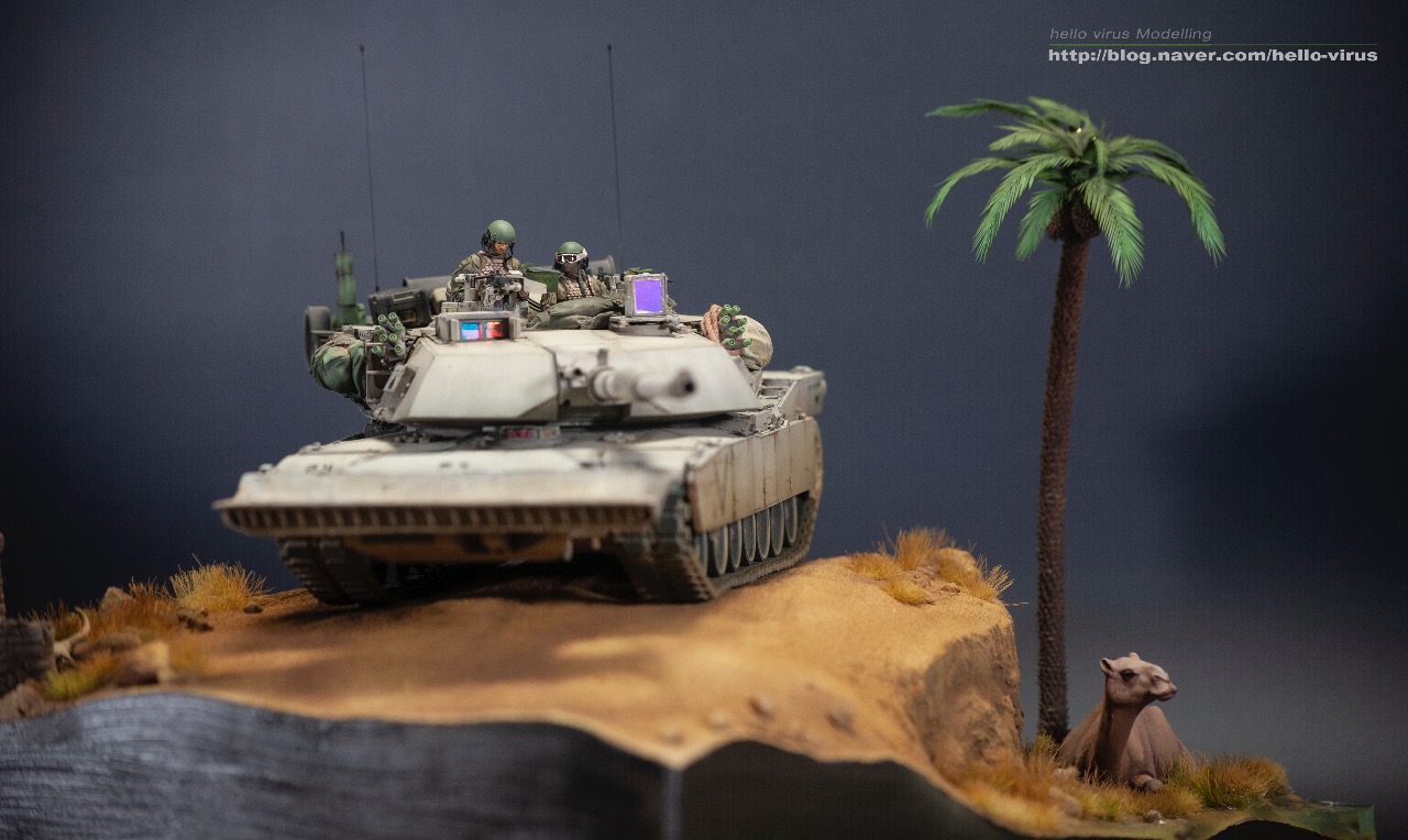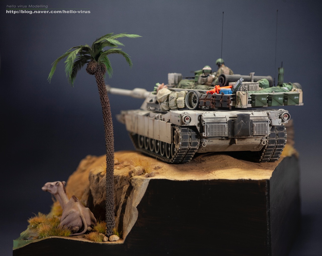 라이필드의 M1A2 Tusk I / II 제품에 각종 액세서리등을 추가하여 미해병대 사양의 M1A1으로 작업하였고, 사막에서 작전하는 모습을 표현하고자 지형도 제작하고 낙타랑 야자수도 배치 했습니다.