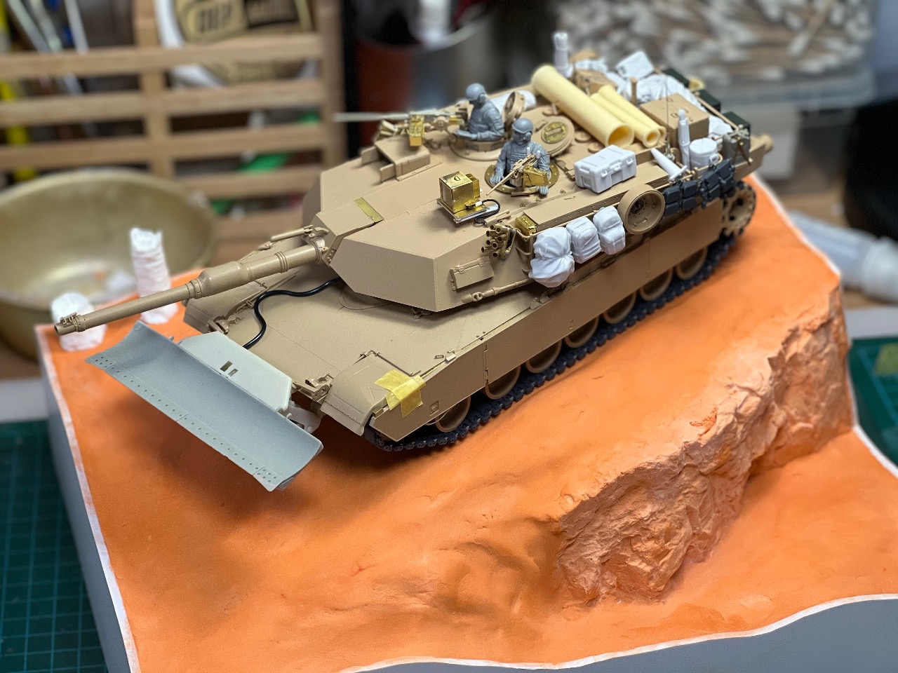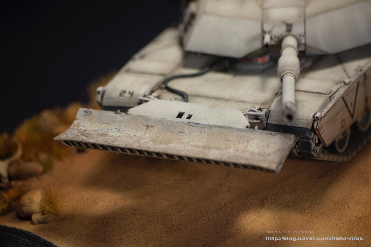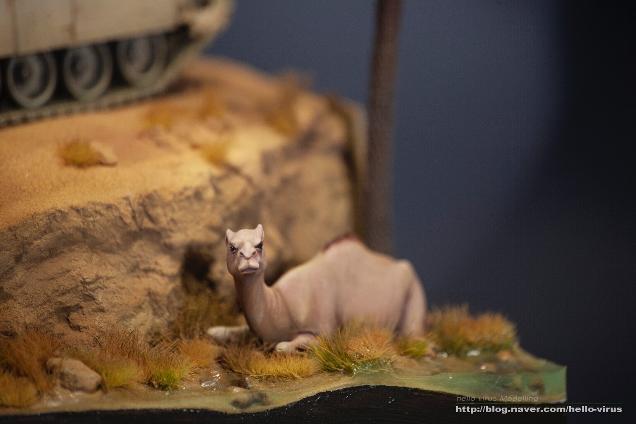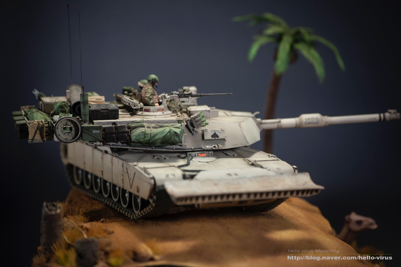 라이필드의 M1A2 Tusk I / II 제품에 각종 액세서리등을 추가하여 미해병대 사양의 M1A1으로 작업하였고, 사막에서 작전하는 모습을 표현하고자 지형도 제작하고 낙타랑 야자수도 배치 했습니다.