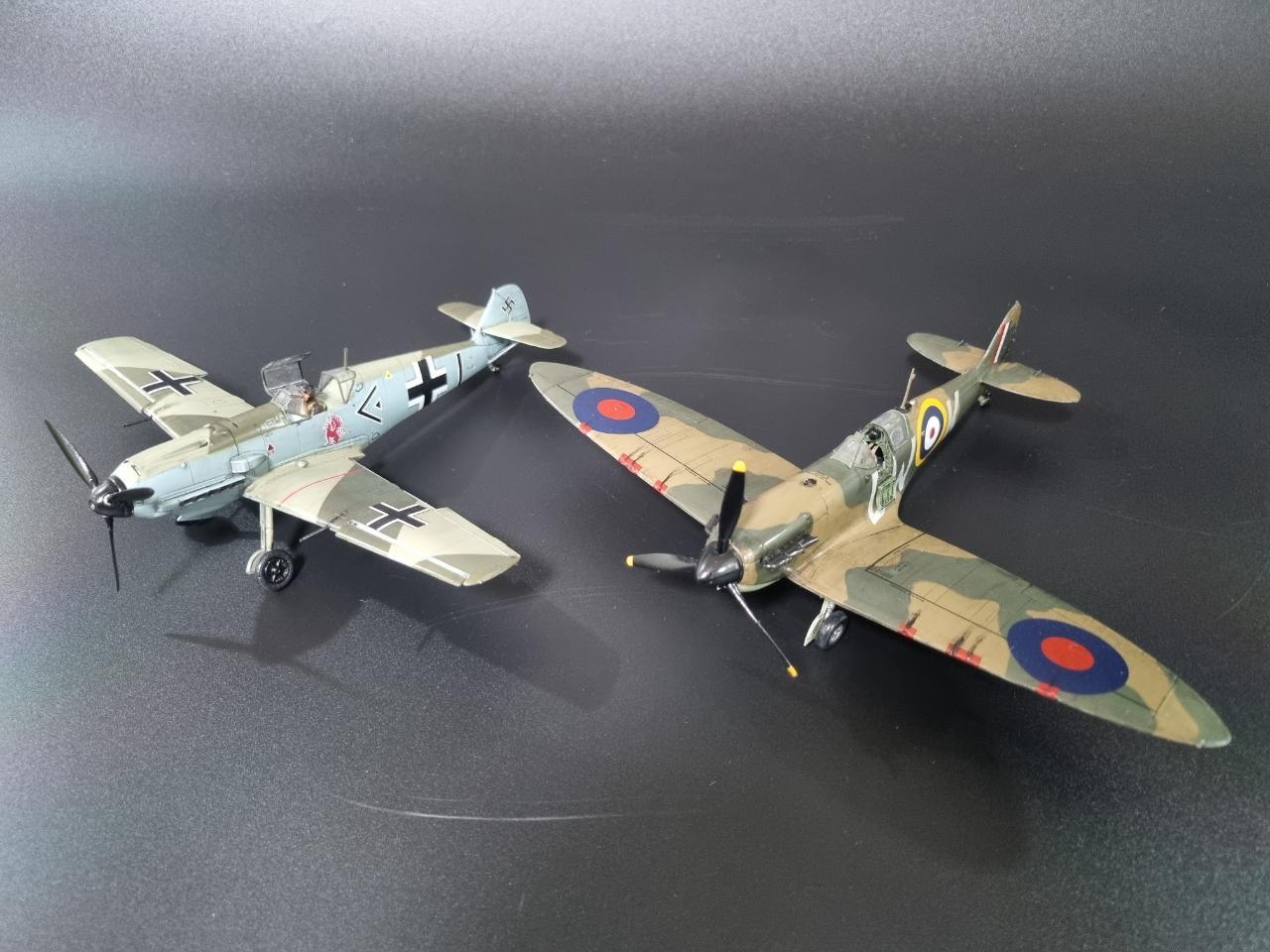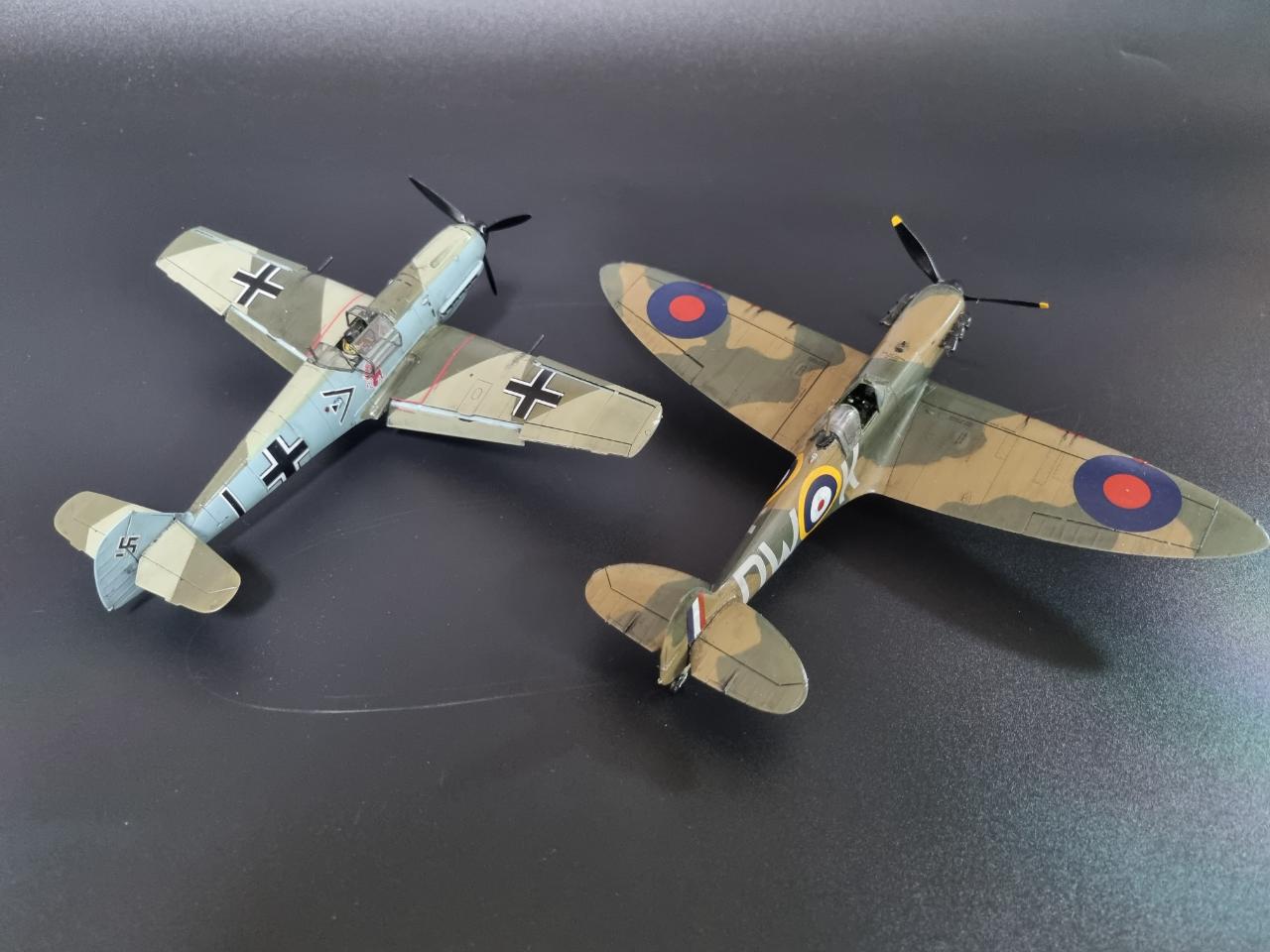 타미야 1/48 2차대전 프로펠러기 2기를 제작했습니다. 하나는 스핏파이어, 하나는 BF-109E입니다. 둘다 영국본토항공전에 사용된 기체이죠. 평소 1/48 기체는 잘 제작하지 않는데 웬일로 나이가 들어서 그런지 2차대전 프로펠러기가 땡기더군요. 그래서 제작해 보았습니다. 도색은 타미야 지정색이며, 마감은 군제수성반광 스프레이로 완료했습니다.