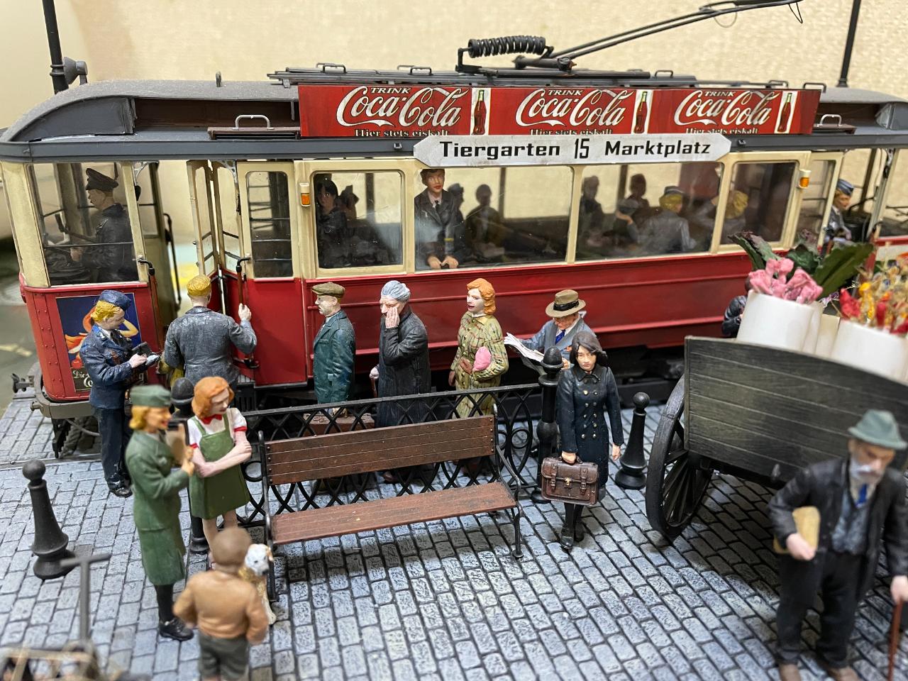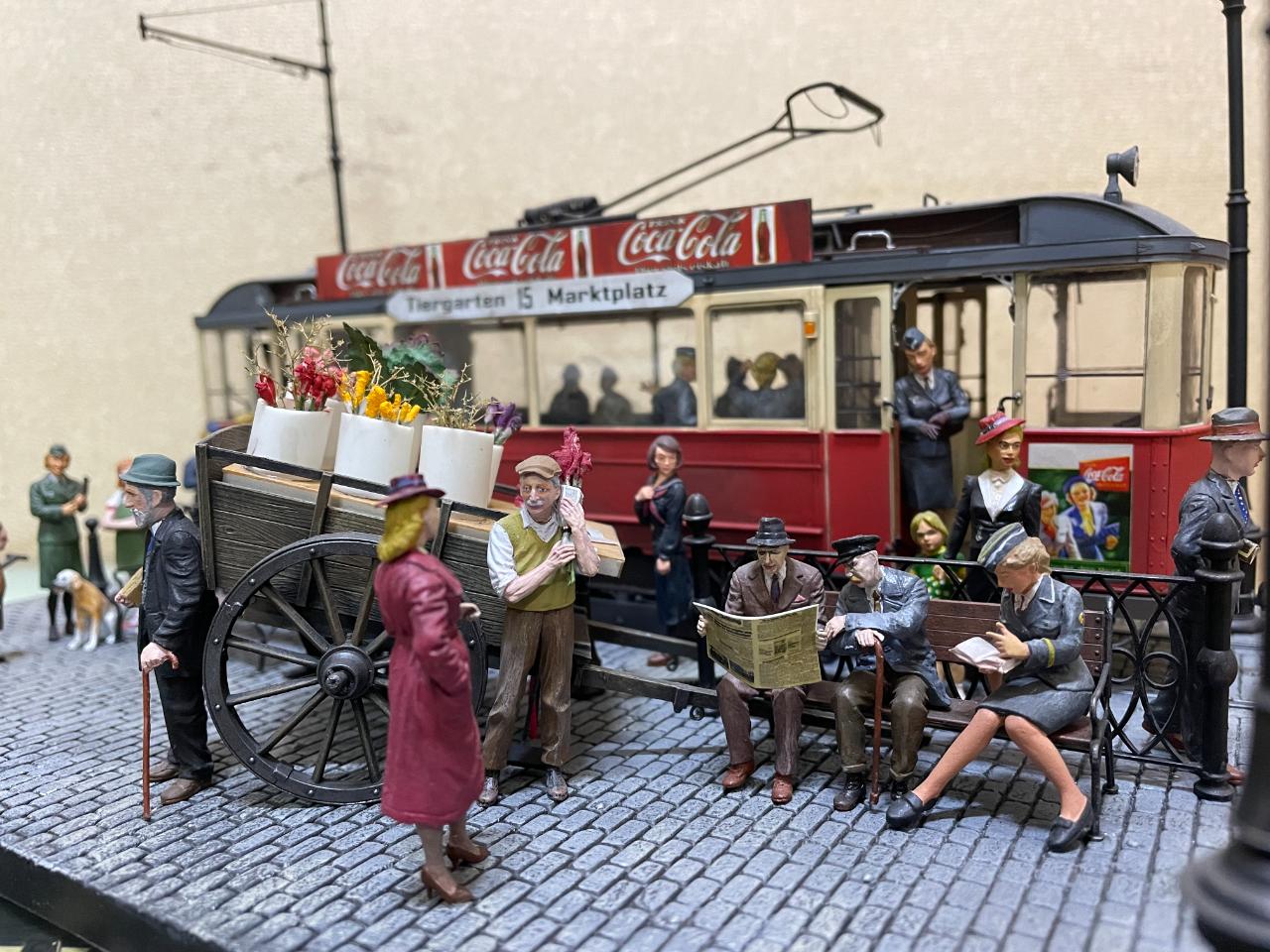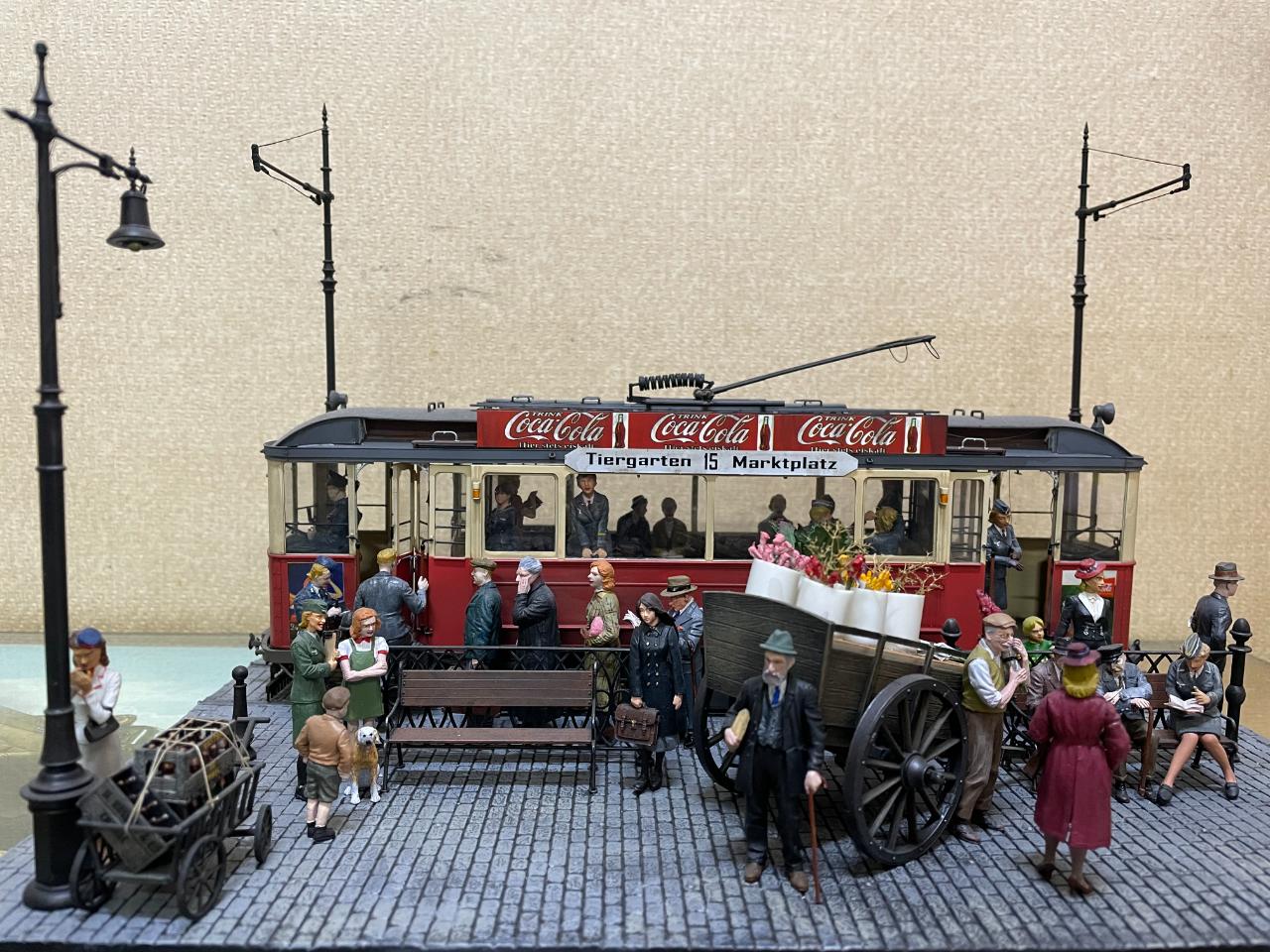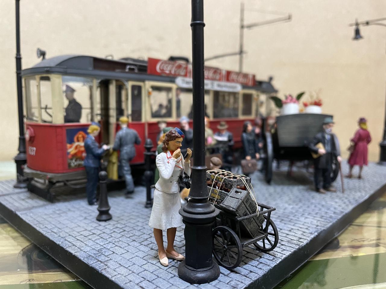 몇 년 전 만들어놓고 계속 미루다 오늘 꺼내서 사진 남겨봤습니다. 미니아트의 트램을 이용한 작품이구요, 각종 메이커의 인형들을 사용했습니다. 중간의 꽃 파는 수레가 파워소스로, 트램 내부조명과 헤드라이트를 작동시킵니다. 가로등 불도 들어왔었는데 나갔나봅니다..