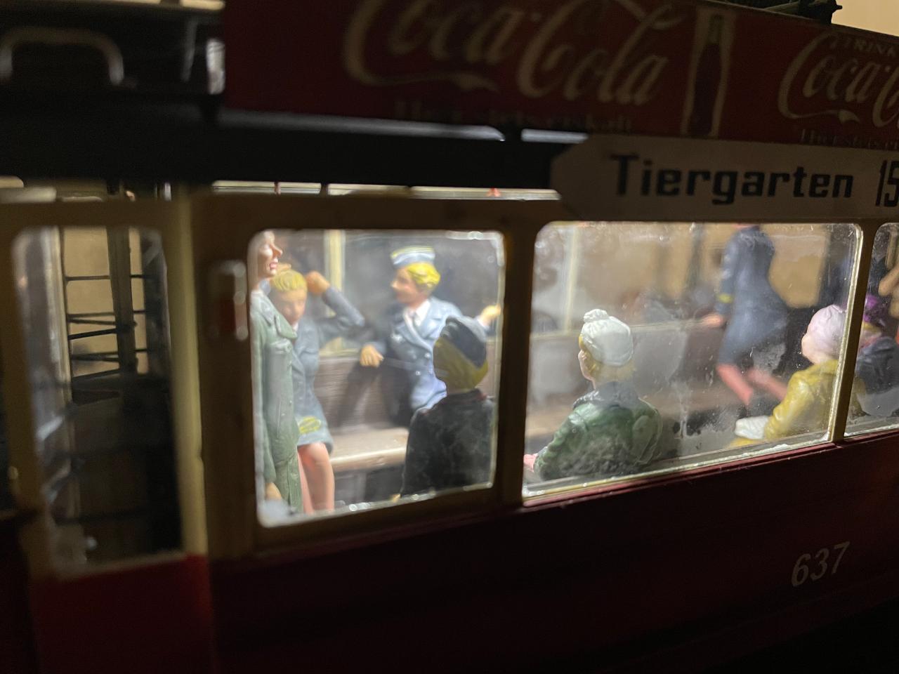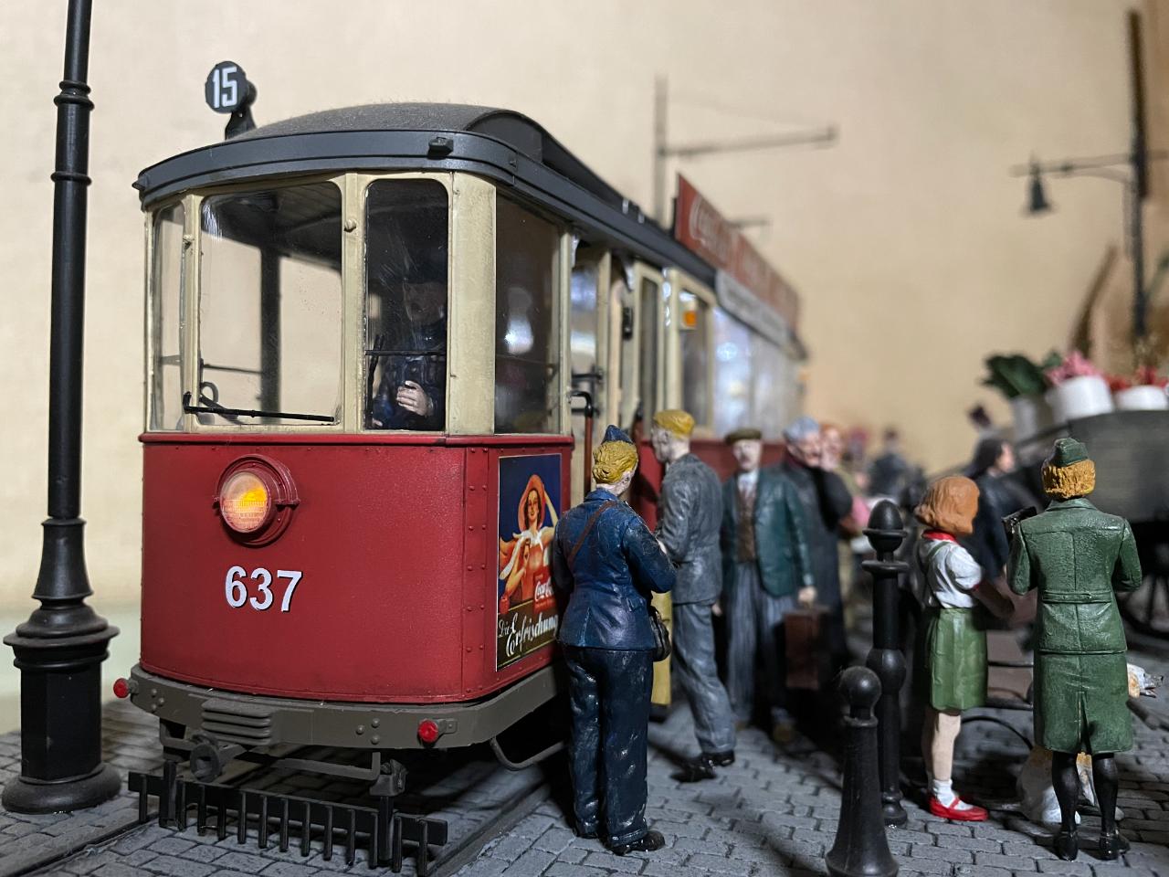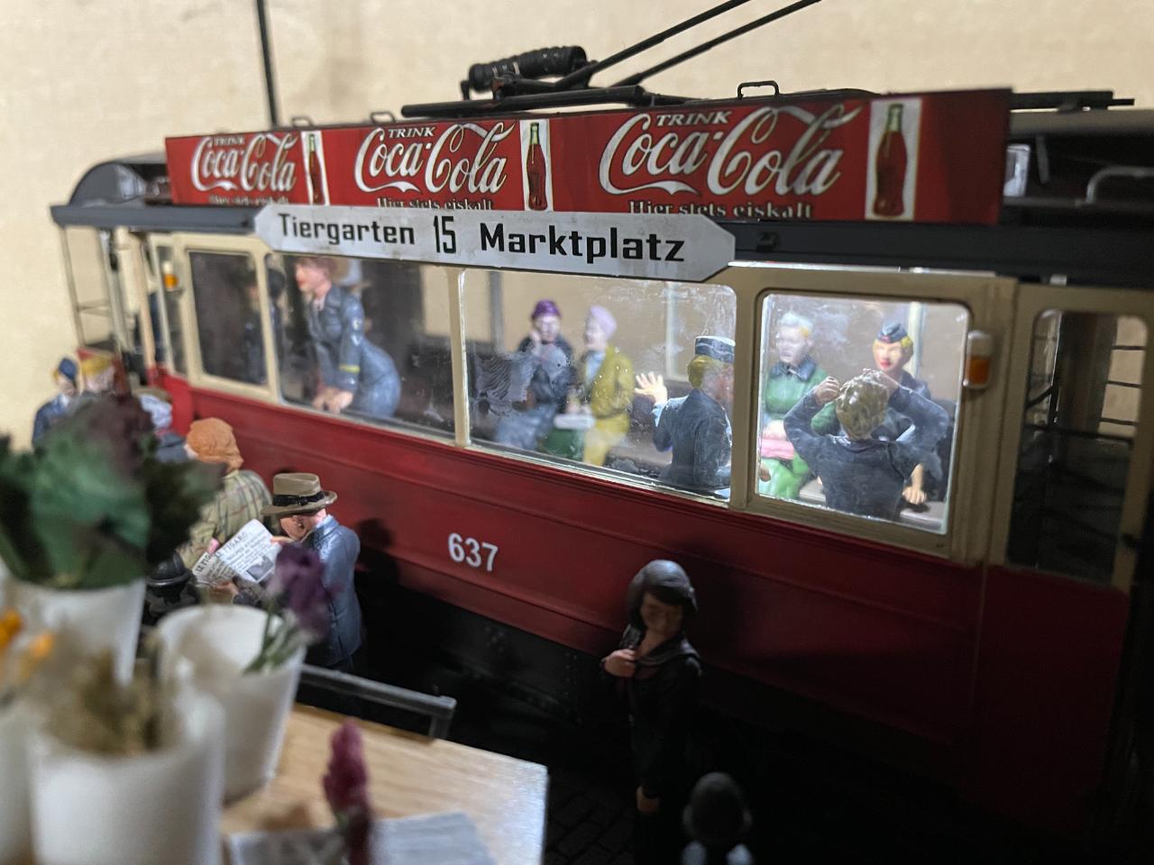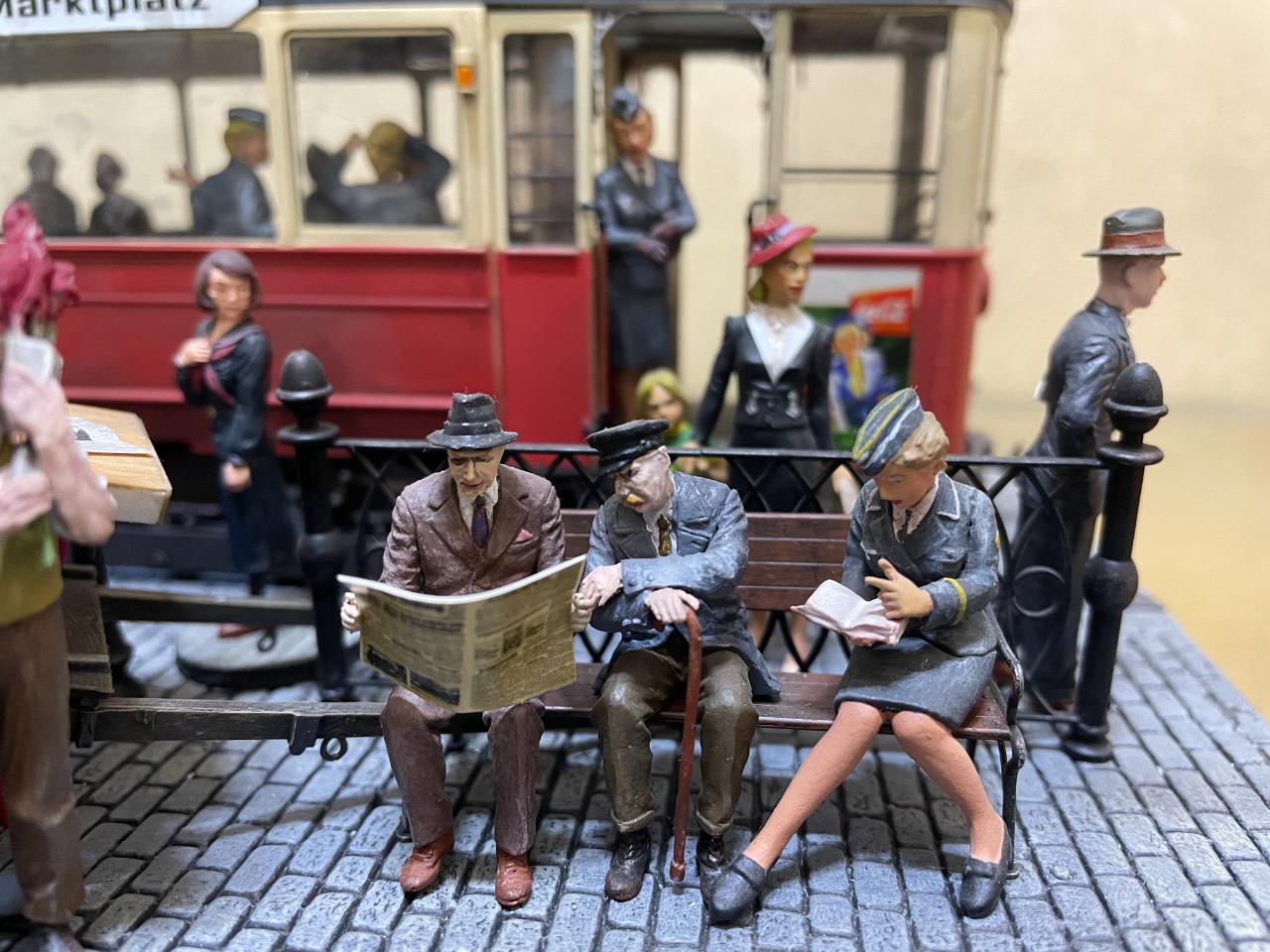 몇 년 전 만들어놓고 계속 미루다 오늘 꺼내서 사진 남겨봤습니다. 미니아트의 트램을 이용한 작품이구요, 각종 메이커의 인형들을 사용했습니다. 중간의 꽃 파는 수레가 파워소스로, 트램 내부조명과 헤드라이트를 작동시킵니다. 가로등 불도 들어왔었는데 나갔나봅니다..