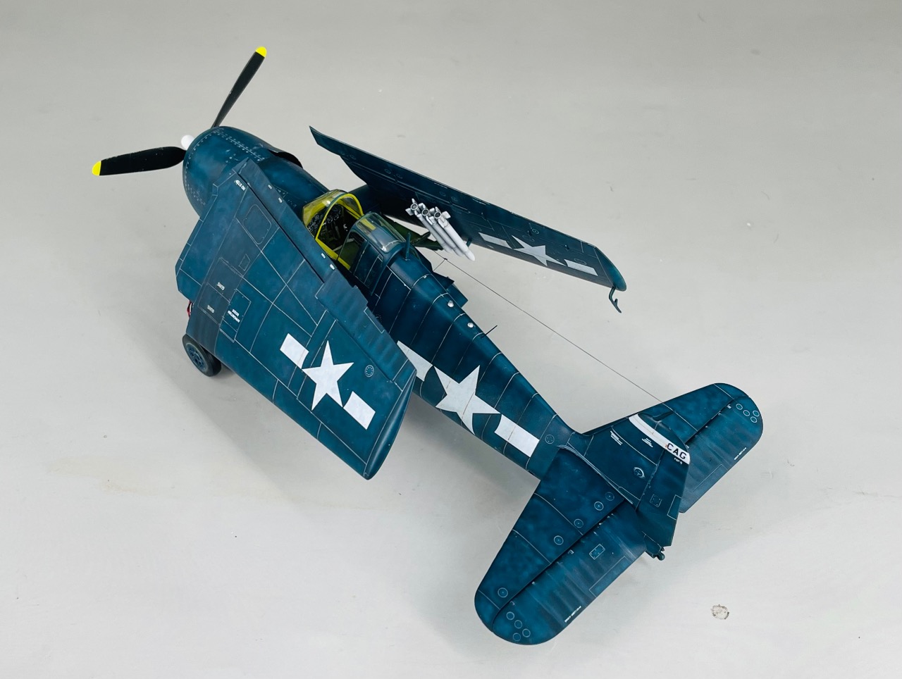 하비보스 헬켓입니다. 아크릴 기본도색, 반광으로 마감 했습니다. 폴딩 윙 연결부위에 에나멜선으로 케이블 표현하고, 런너 늘려서 안테나 두개 꼽고, 나머지는 킷 그대로 만들었습니다. 몰드가 좀 얕다는 것 이외에는 가성비 좋은 킷 이네요.