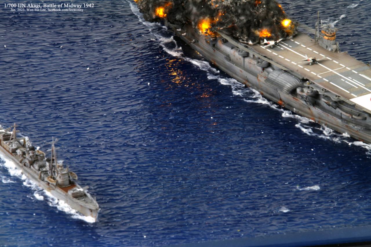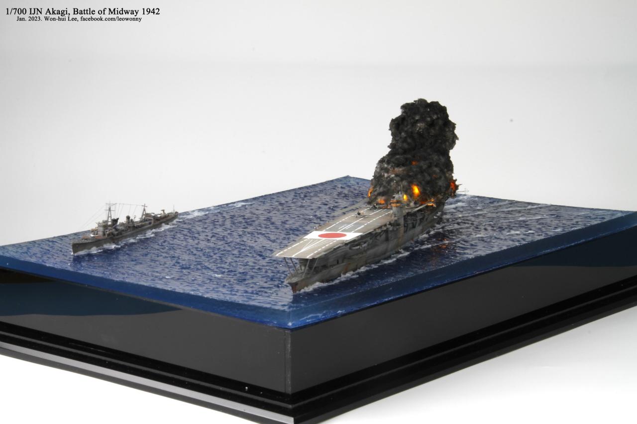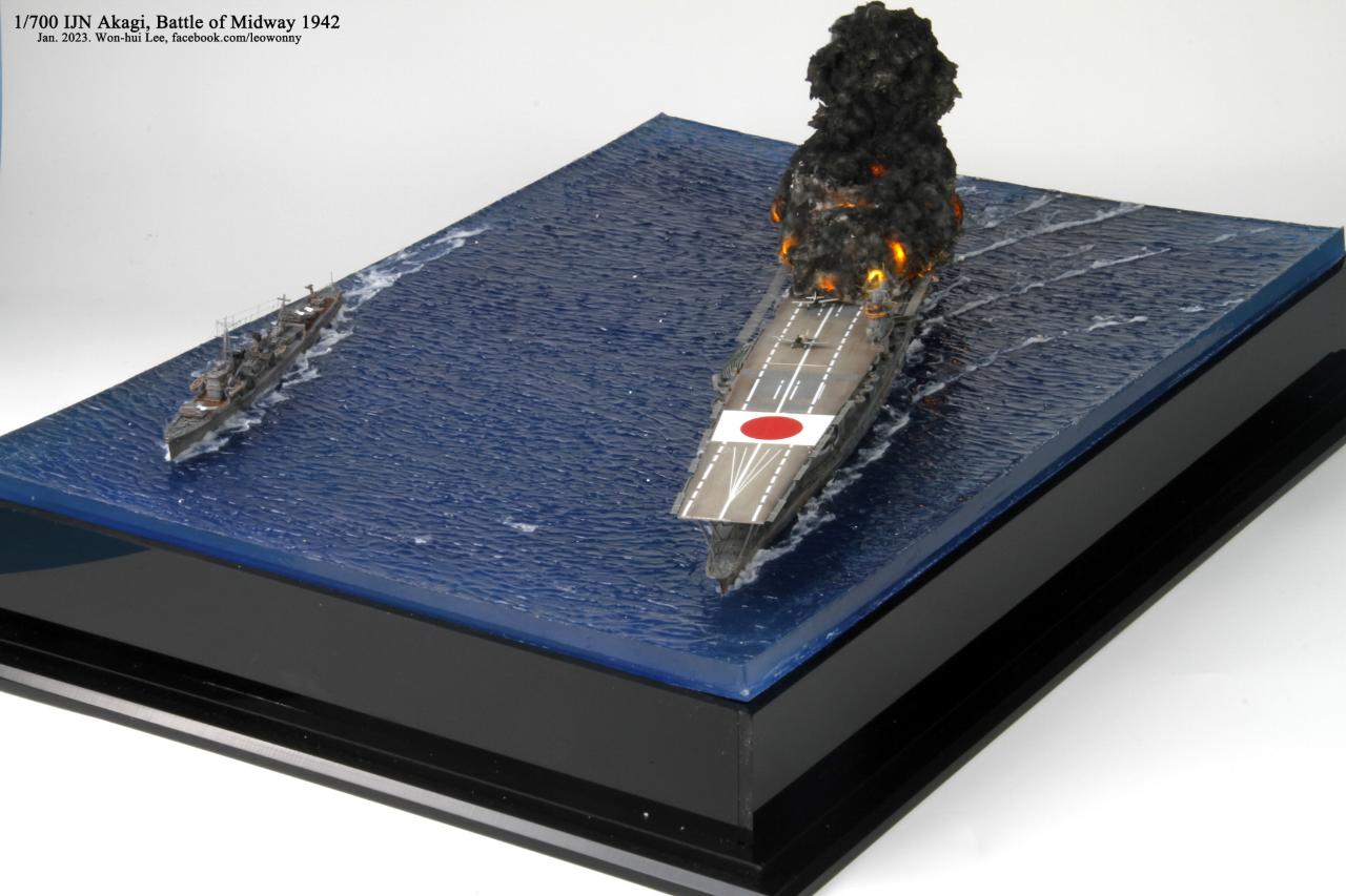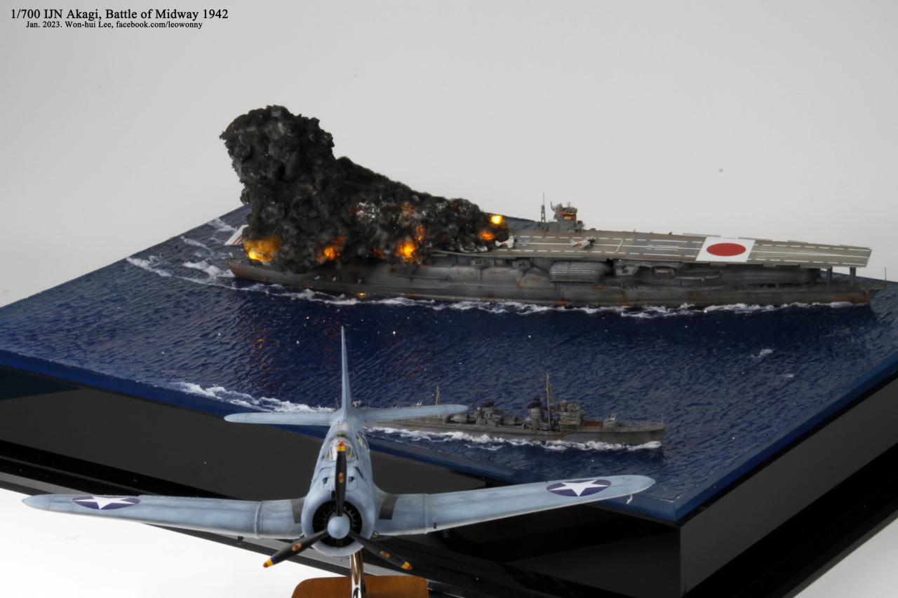 미드웨이 디오라마 입니다. 고증에 관해서 미리 말씀드리자면, 아카기 좌우측 키리시마와 히에이, 나가라, 노와키, 이소카제 등이 포진하고 있었습니다. 아카기의 피격위치는 중앙 엘레베이터 모서리 근처였습니다. 옆에 구축함은 유구모인데 고증에 맞지 않습니다만, 거리도 마찬가지, 베이스의 크기, 무게, 비용, 구도 등 여러가지 문제를 고려해서 배치했습니다.