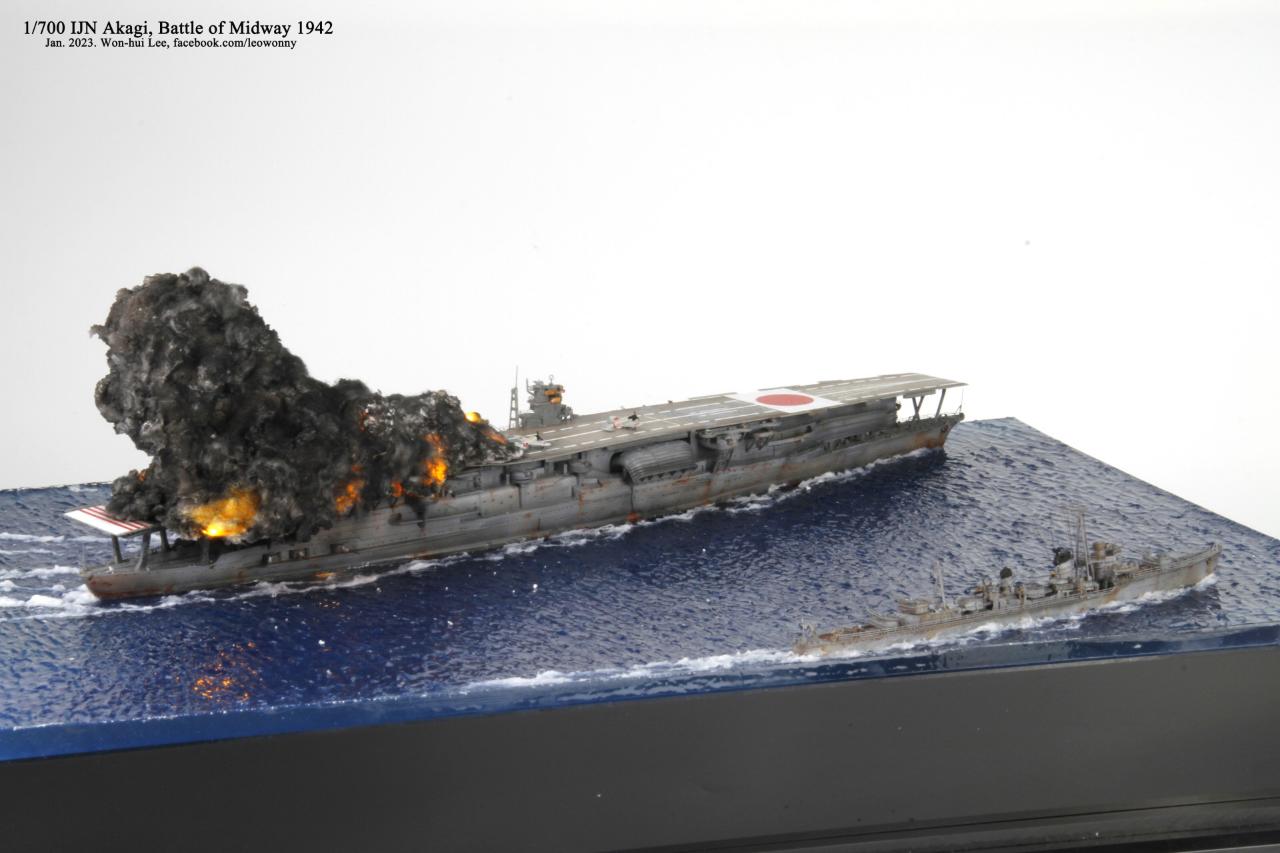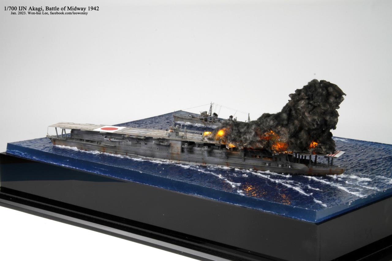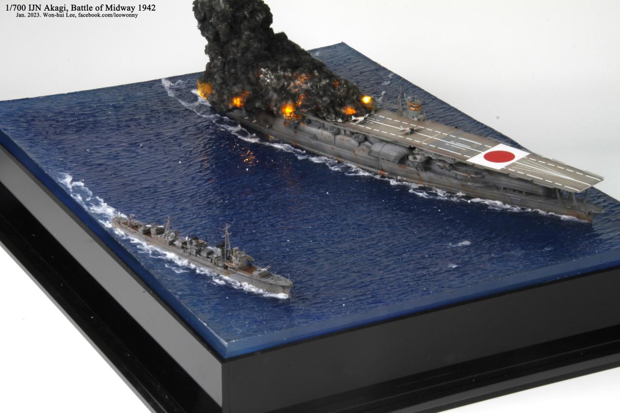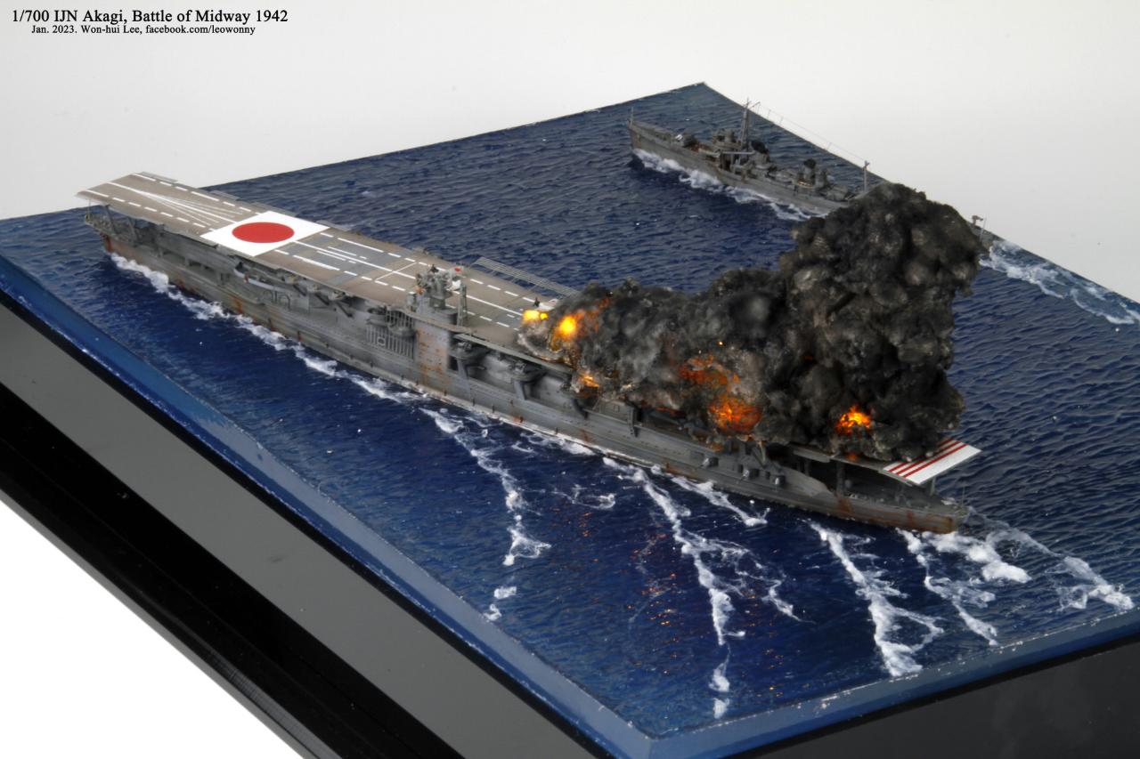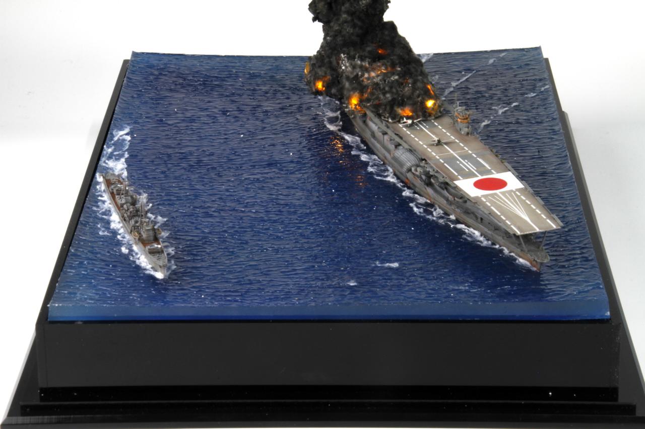 미드웨이 디오라마 입니다. 고증에 관해서 미리 말씀드리자면, 아카기 좌우측 키리시마와 히에이, 나가라, 노와키, 이소카제 등이 포진하고 있었습니다. 아카기의 피격위치는 중앙 엘레베이터 모서리 근처였습니다. 옆에 구축함은 유구모인데 고증에 맞지 않습니다만, 거리도 마찬가지, 베이스의 크기, 무게, 비용, 구도 등 여러가지 문제를 고려해서 배치했습니다.