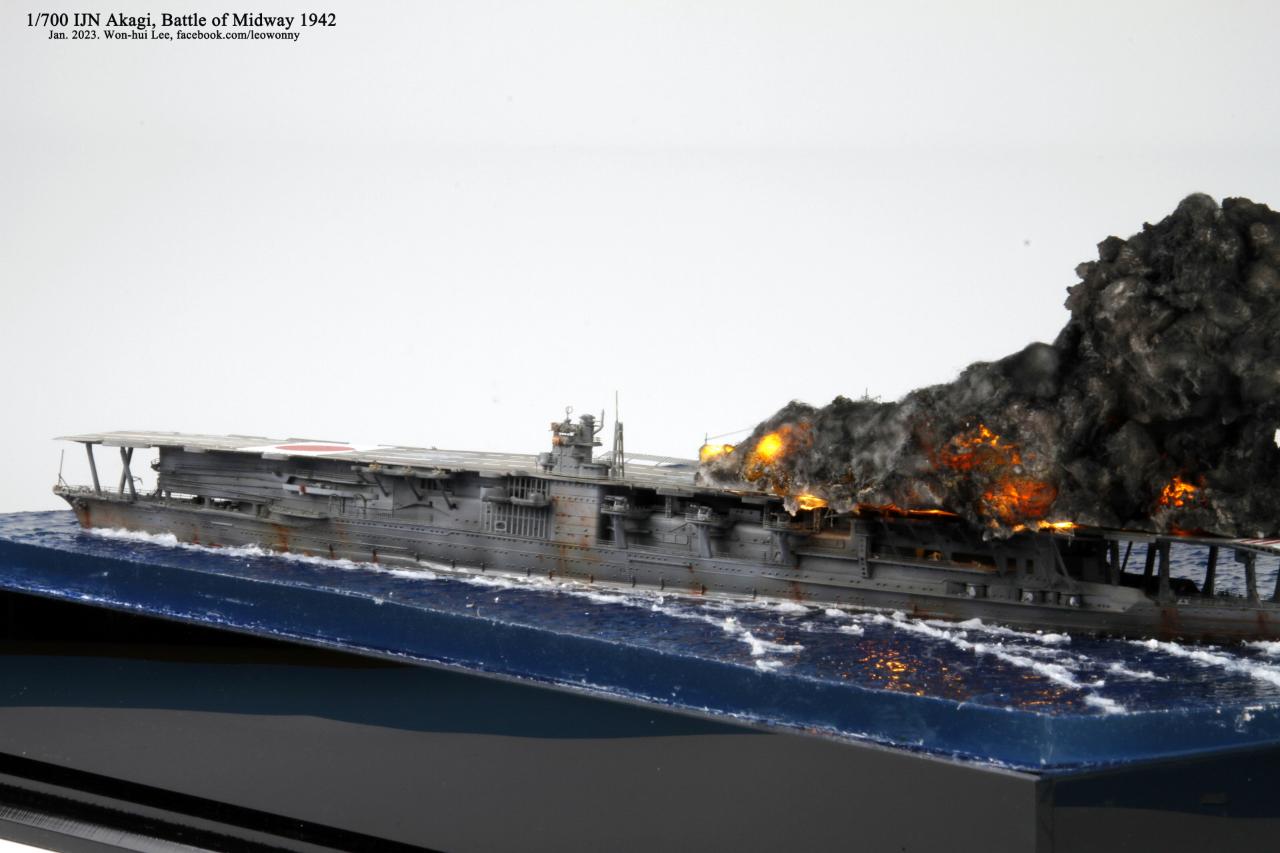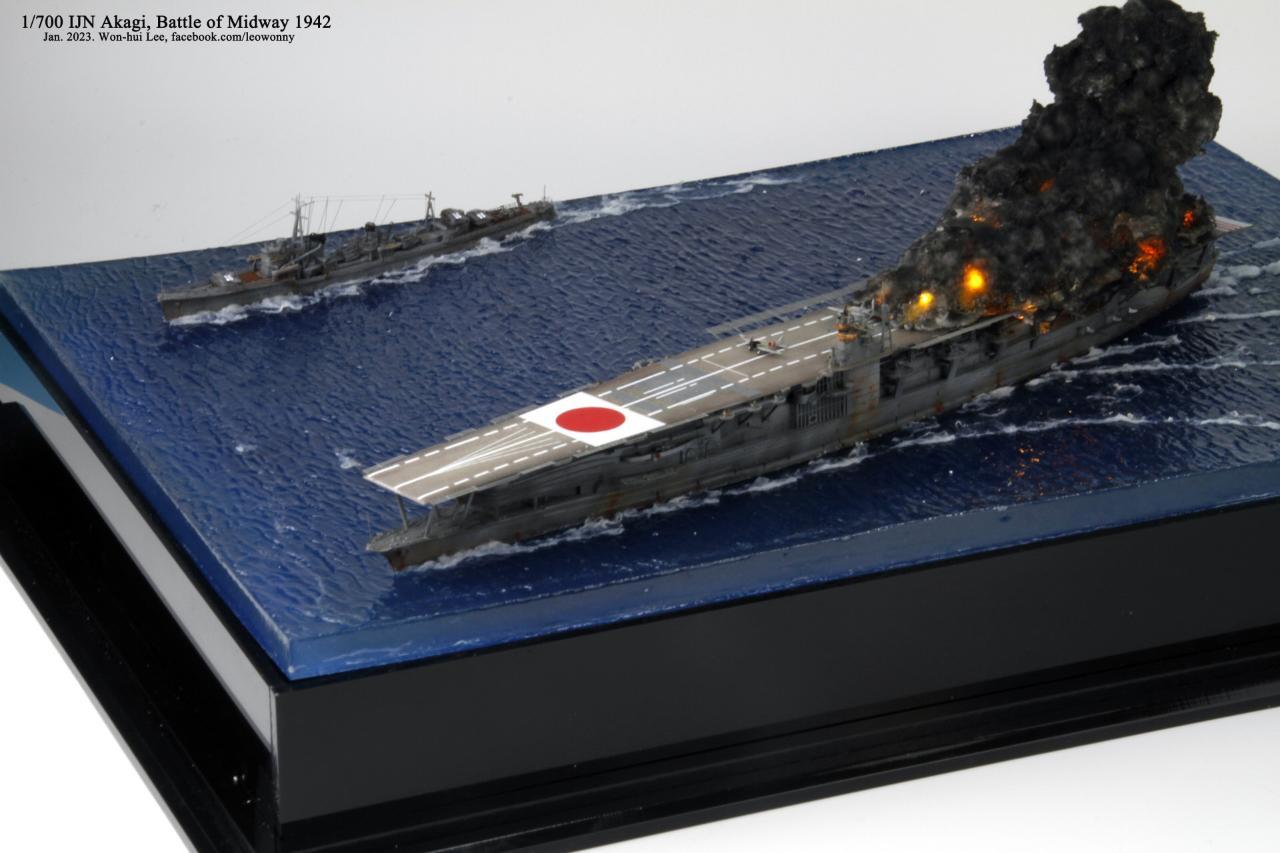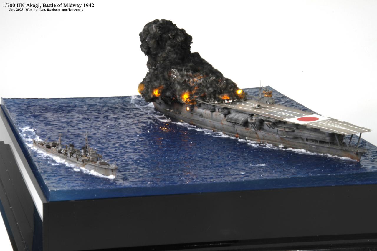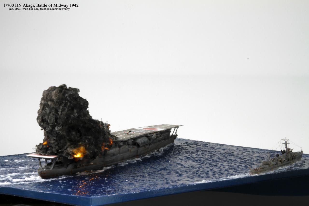 미드웨이 디오라마 입니다. 고증에 관해서 미리 말씀드리자면, 아카기 좌우측 키리시마와 히에이, 나가라, 노와키, 이소카제 등이 포진하고 있었습니다. 아카기의 피격위치는 중앙 엘레베이터 모서리 근처였습니다. 옆에 구축함은 유구모인데 고증에 맞지 않습니다만, 거리도 마찬가지, 베이스의 크기, 무게, 비용, 구도 등 여러가지 문제를 고려해서 배치했습니다.