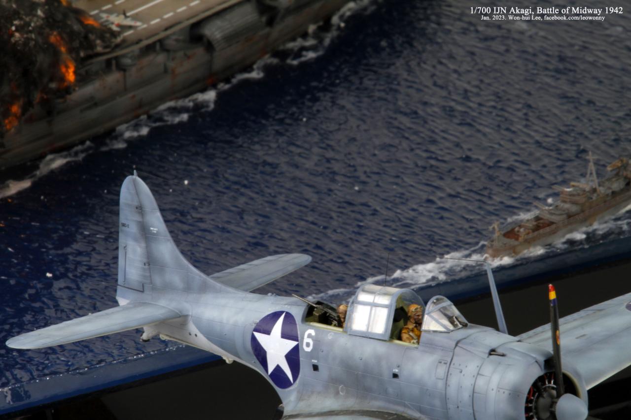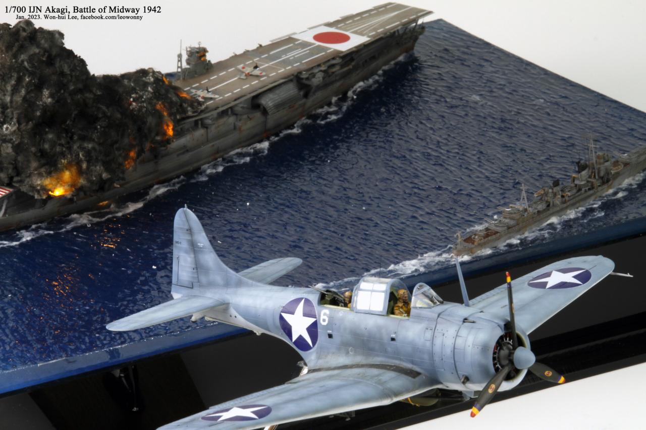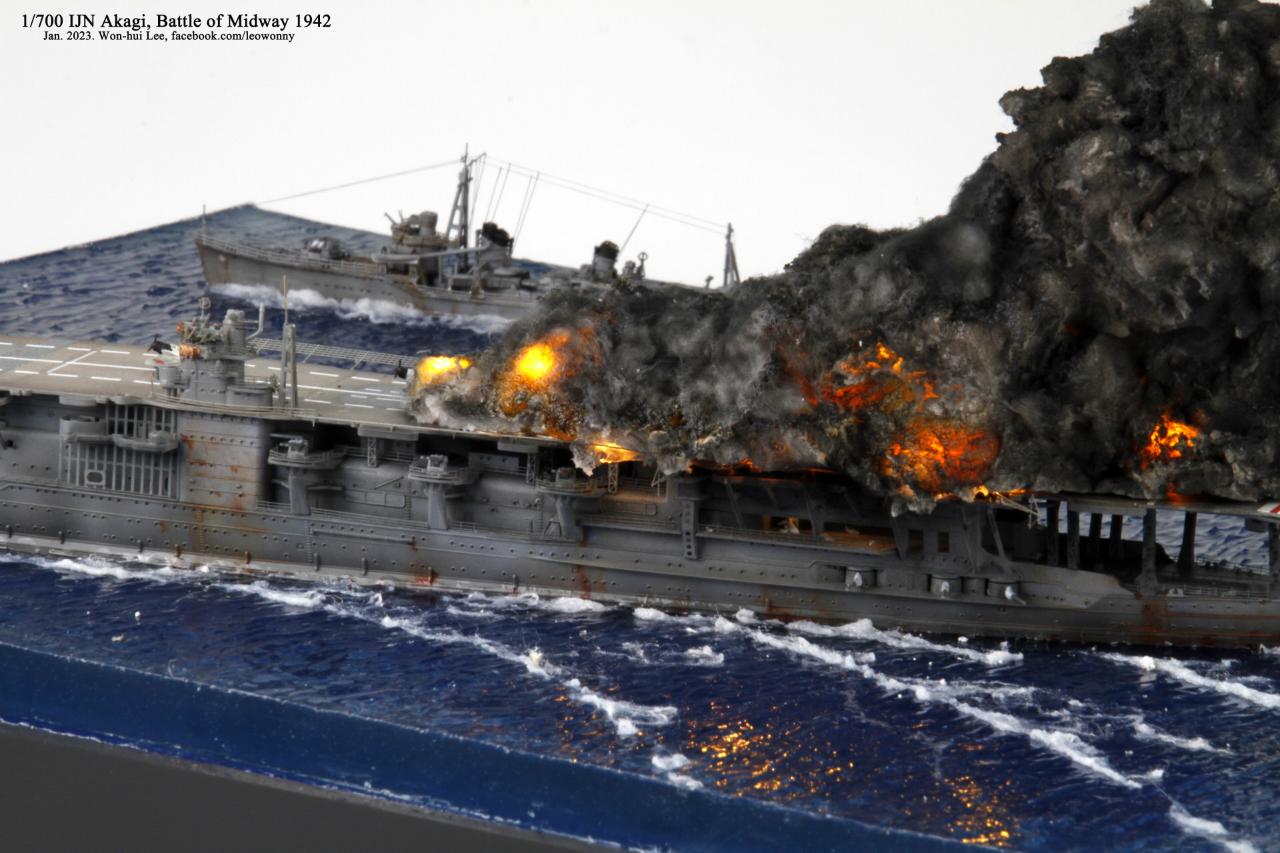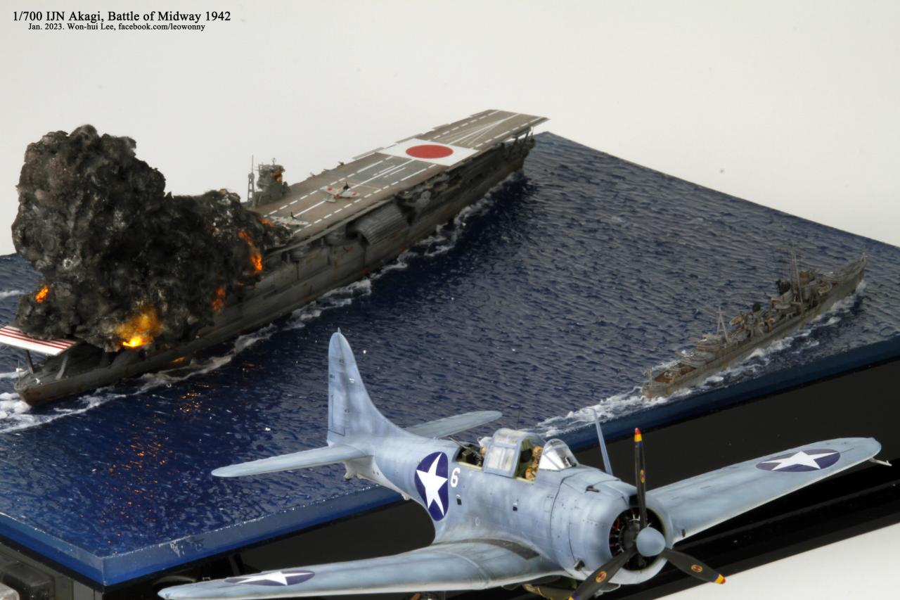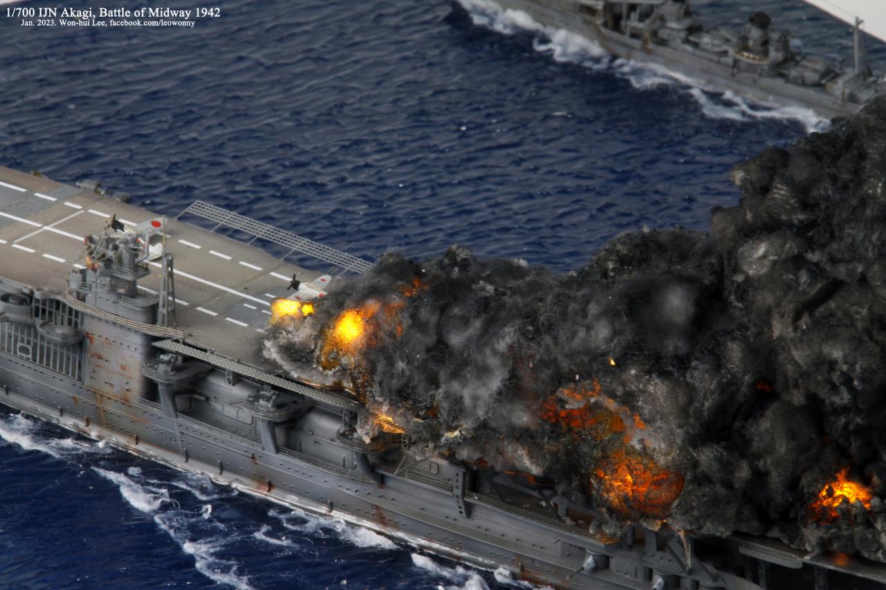 미드웨이 디오라마 입니다. 고증에 관해서 미리 말씀드리자면, 아카기 좌우측 키리시마와 히에이, 나가라, 노와키, 이소카제 등이 포진하고 있었습니다. 아카기의 피격위치는 중앙 엘레베이터 모서리 근처였습니다. 옆에 구축함은 유구모인데 고증에 맞지 않습니다만, 거리도 마찬가지, 베이스의 크기, 무게, 비용, 구도 등 여러가지 문제를 고려해서 배치했습니다.