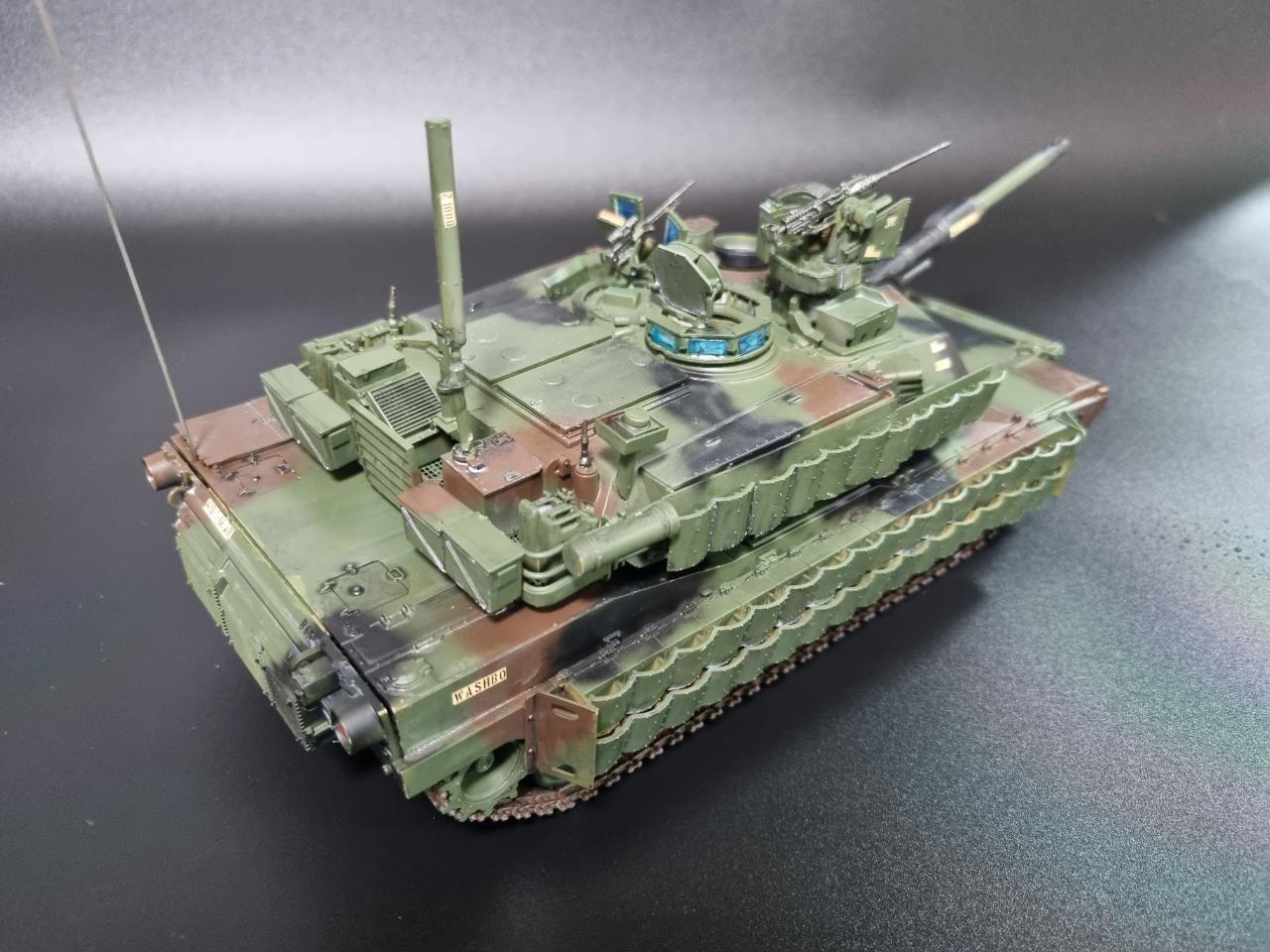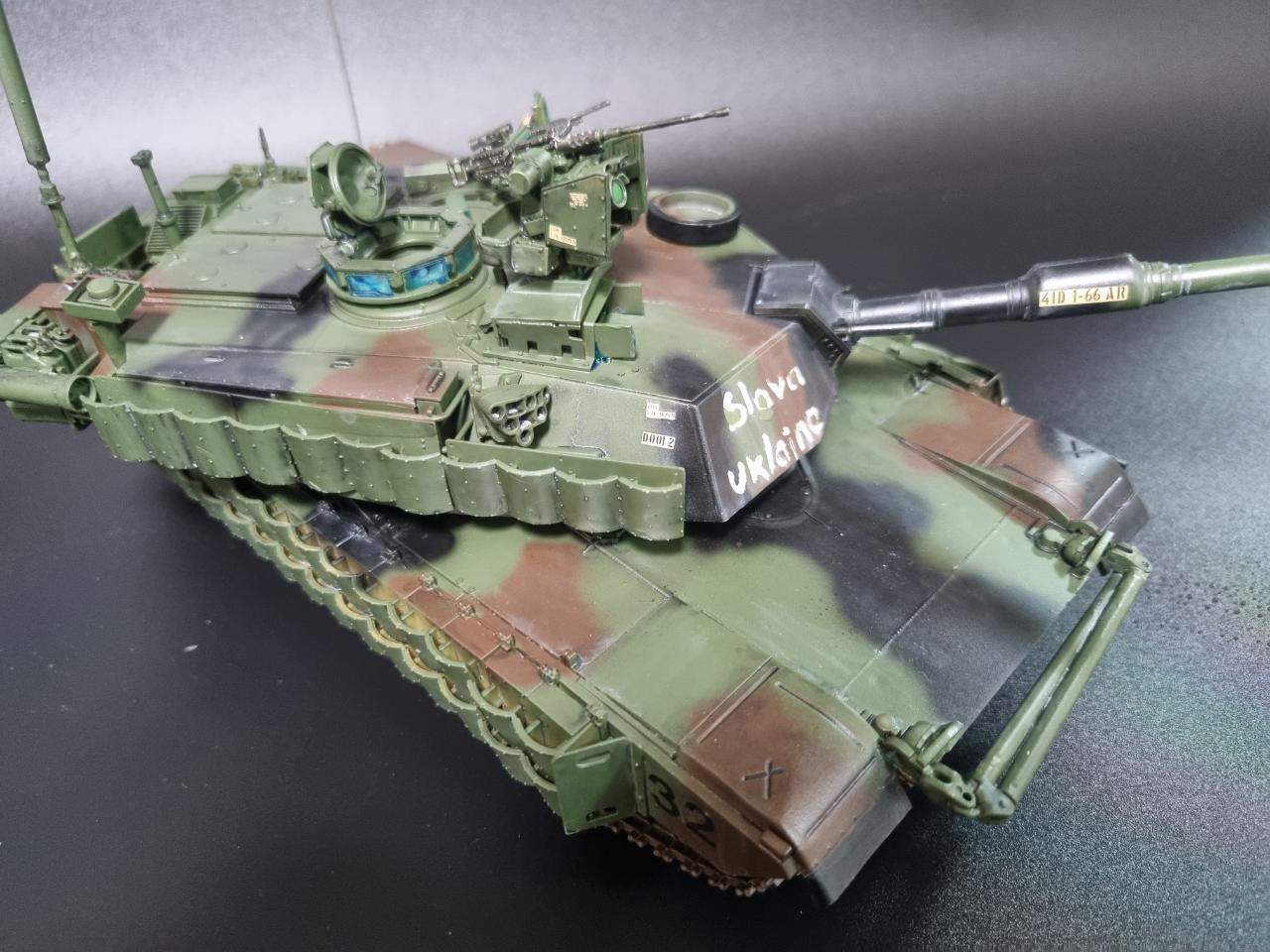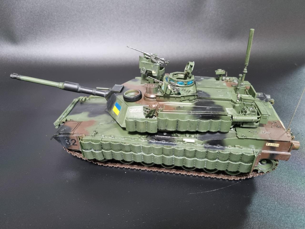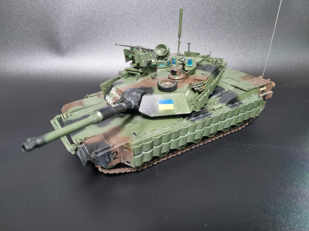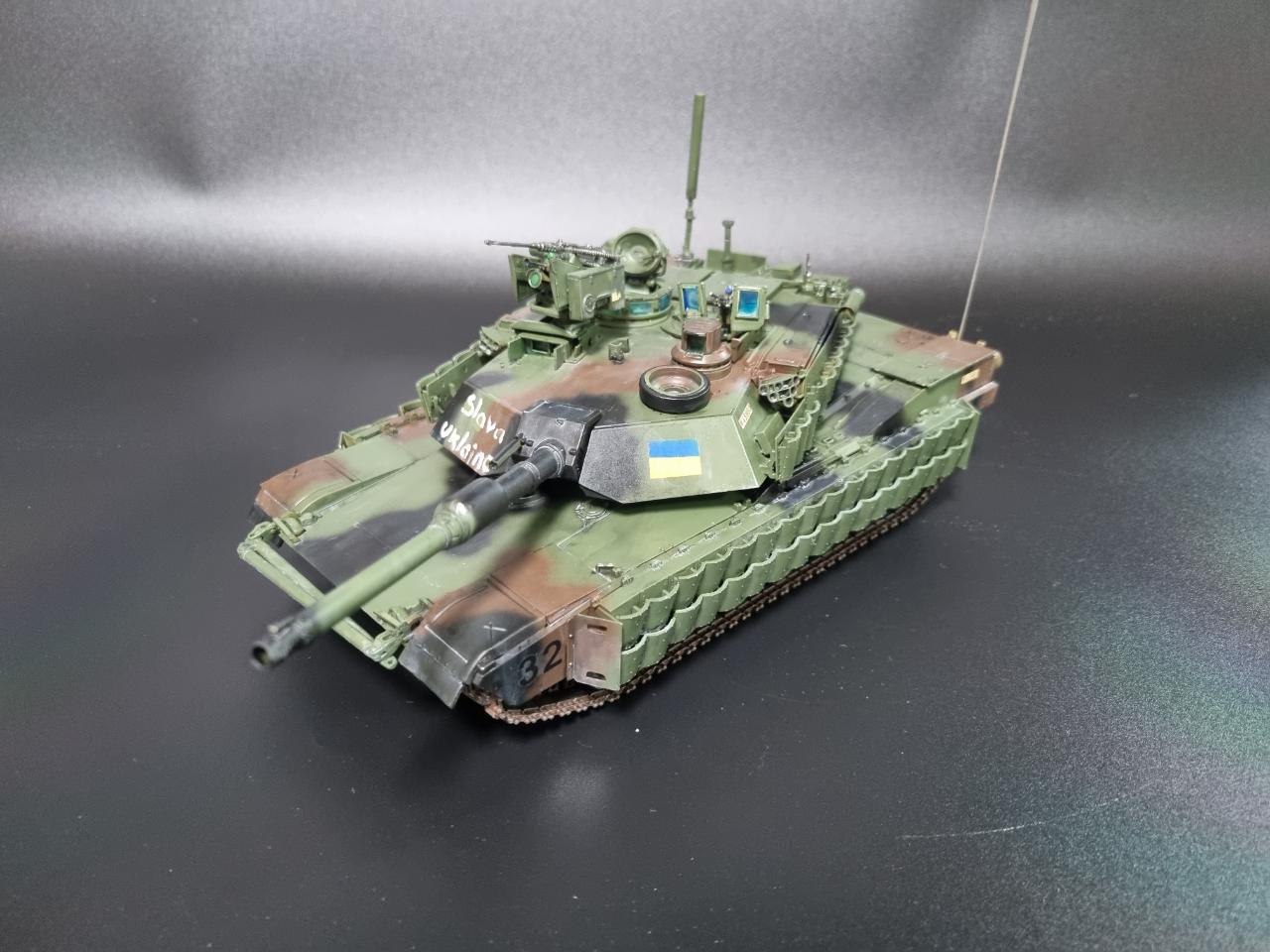 1/35 M1A2 V2 SEP 우크라이나버전으로 제작해 보았습니다. 아직 우크라이나에 M1이 인도되지 않았지만 워낙 큰 이슈이기에 만약 우크라이나에 M1A2가 인도된다면 이런 모습이지 않겠나? 하고 상상을 하며 만들었습니다."Slava Ukraine"의 탱크 옆면의 표어는 "우크라이나에 영광을"이라는 뜻으로 세필로 페인트 칠 하였고 국기는 스텐실로 제작하였습니다.