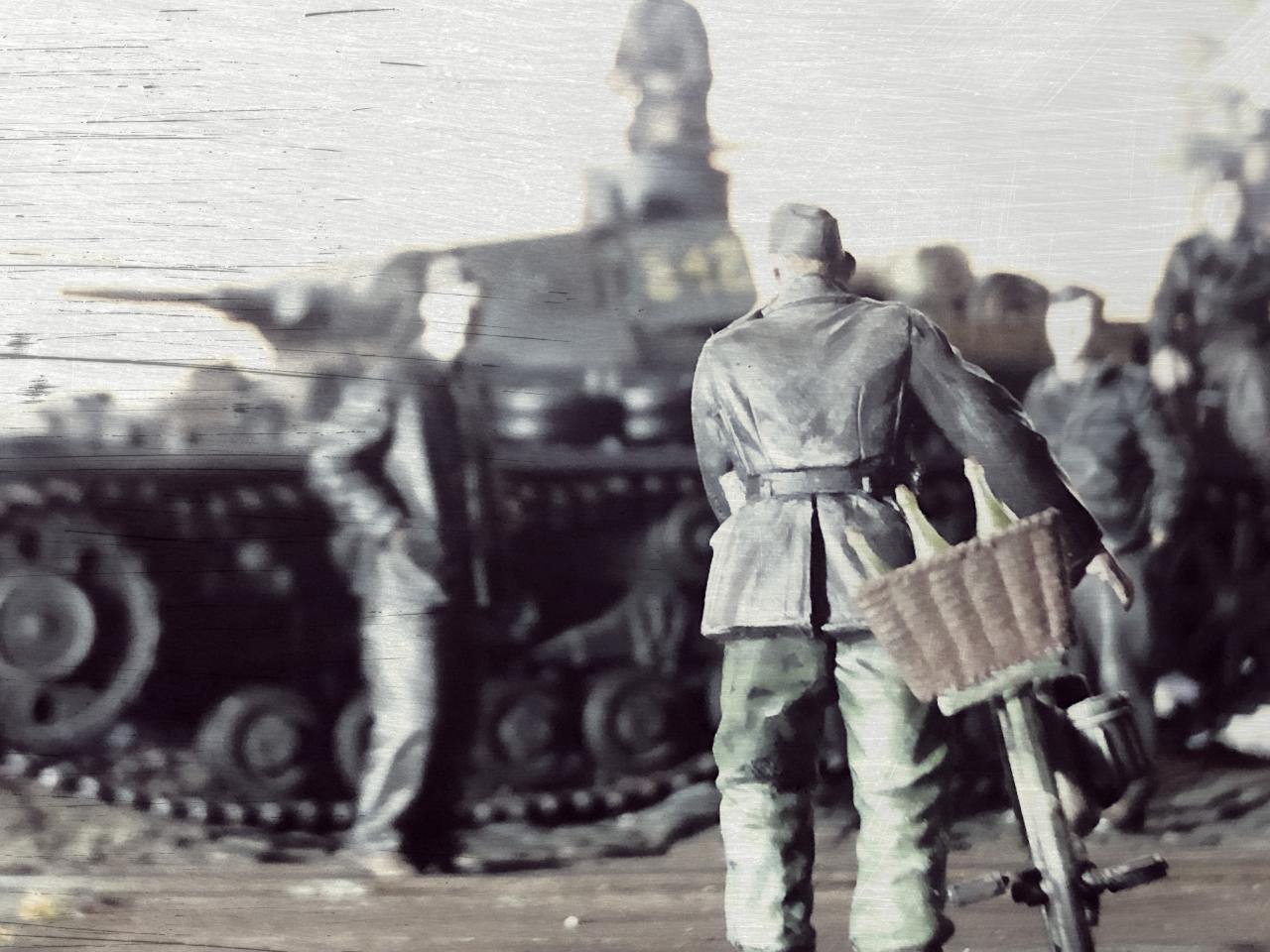 대전 초기 전격전의 성공 이후, 거점을 점령한 독일 전차소대가 프랑스 어느 농가의 명품 와인을 손에 넣고 즐거워하는 모습을 표현한,