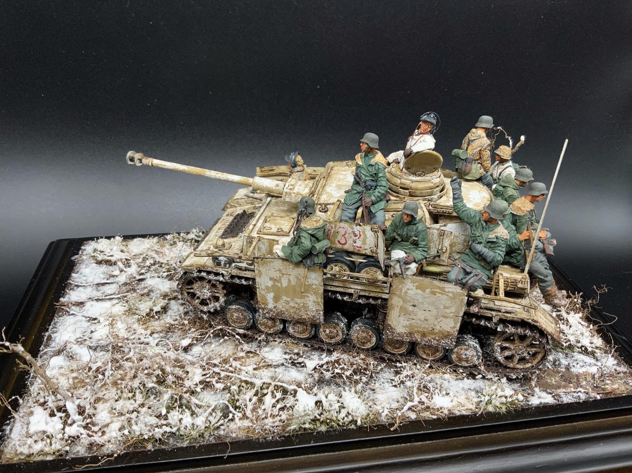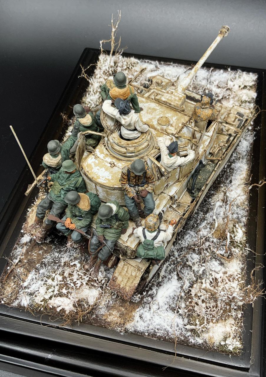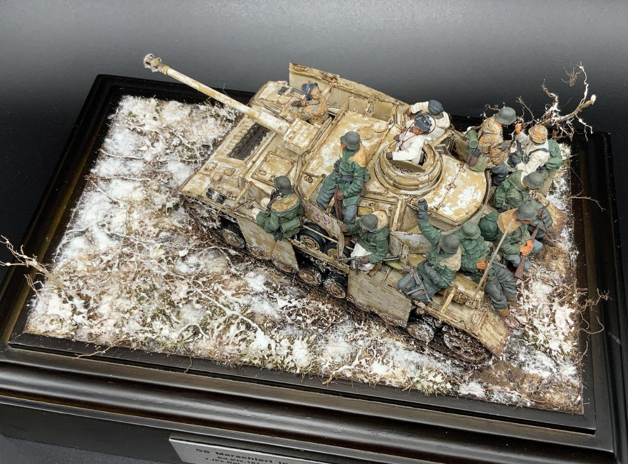 2006년 유로 밀리테어 BOS를 차지했던 Phil Stutcinskas 작품을 처음 보았을 때 헤어 스프레이 기법이라는 신세계도 나름 충격으로 다가왔었지만 그 보다는 작품에서 느껴지는 혹독한 겨울 전장의 피로감, 우울감이나 허무한 감정 등이 저에게는 너무 매력적으로 느껴졌었습니다. 꼭 따라해보고 싶은 마음이 있었던 차에 이 느낌을 살려줄만한 제품을 찾게 되었고 결국 능력에는 부치지만 저질러보게 되었습니다. 전차병들은 스탈린그라드 제품, 전차는 드래곤 4호 전차 H형 입니다. 비넷의 설정은 소련군에 의해 부다페스트에 포위된 독일군과 헝가리 군을 구출하기 위한 콘라트 III작전에 참가한 제3 SS 기갑사단 'Totenkopf' 를 주인공으로 삼았고, 제목은 이들의 군가 제목에서 따왔습니다. 저도 남의 일처럼 여겨왔던 노안이란게 와서 디테일은 포기했지만 전체적인 분위기를 표현하는데 주력했습니다. 부디 아량의 눈길로 보아주십시오~
