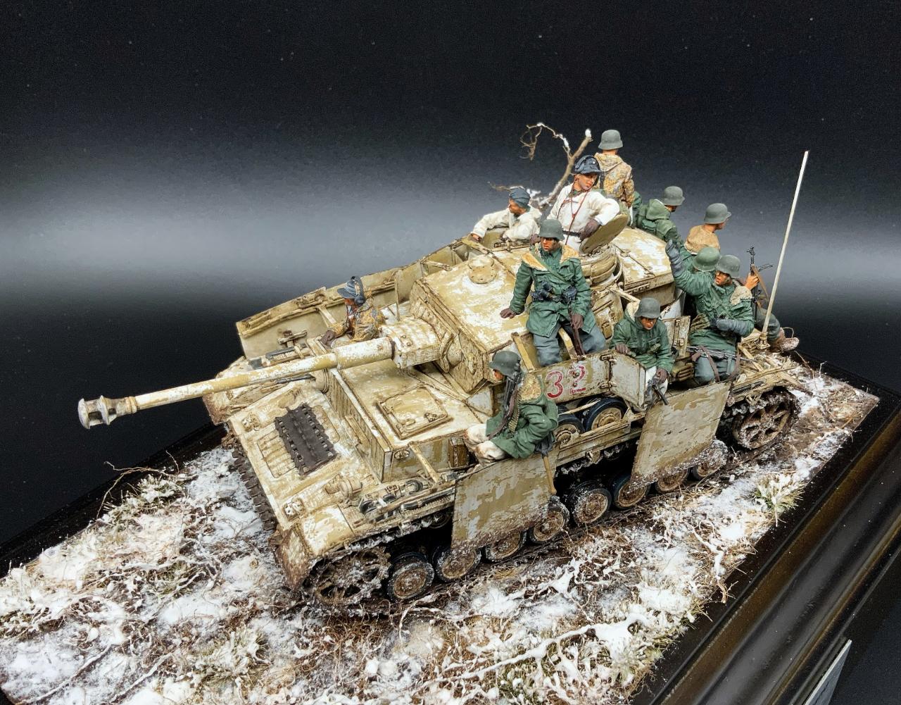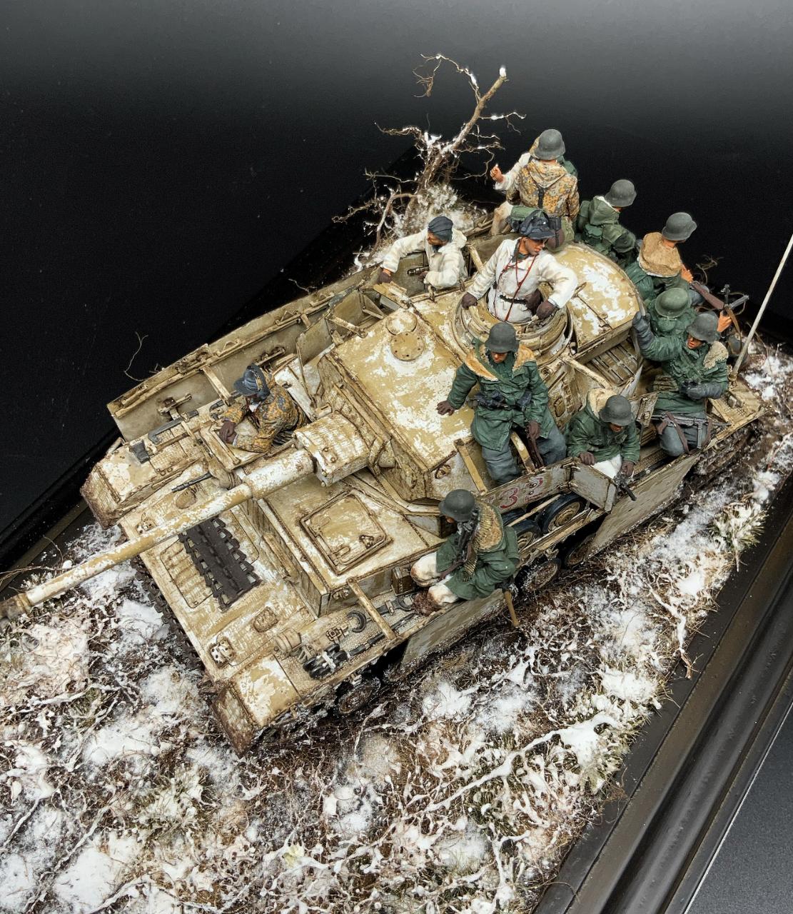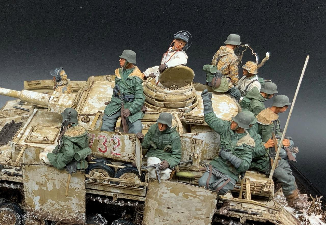 2006년 유로 밀리테어 BOS를 차지했던 Phil Stutcinskas 작품을 처음 보았을 때 헤어 스프레이 기법이라는 신세계도 나름 충격으로 다가왔었지만 그 보다는 작품에서 느껴지는 혹독한 겨울 전장의 피로감, 우울감이나 허무한 감정 등이 저에게는 너무 매력적으로 느껴졌었습니다. 꼭 따라해보고 싶은 마음이 있었던 차에 이 느낌을 살려줄만한 제품을 찾게 되었고 결국 능력에는 부치지만 저질러보게 되었습니다. 전차병들은 스탈린그라드 제품, 전차는 드래곤 4호 전차 H형 입니다. 비넷의 설정은 소련군에 의해 부다페스트에 포위된 독일군과 헝가리 군을 구출하기 위한 콘라트 III작전에 참가한 제3 SS 기갑사단 'Totenkopf' 를 주인공으로 삼았고, 제목은 이들의 군가 제목에서 따왔습니다. 저도 남의 일처럼 여겨왔던 노안이란게 와서 디테일은 포기했지만 전체적인 분위기를 표현하는데 주력했습니다. 부디 아량의 눈길로 보아주십시오~
