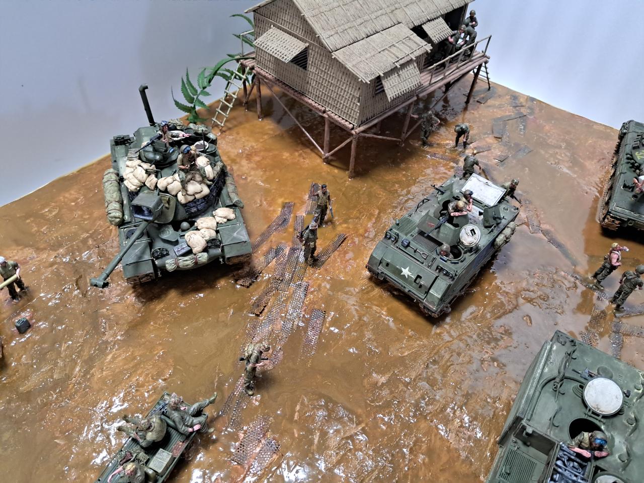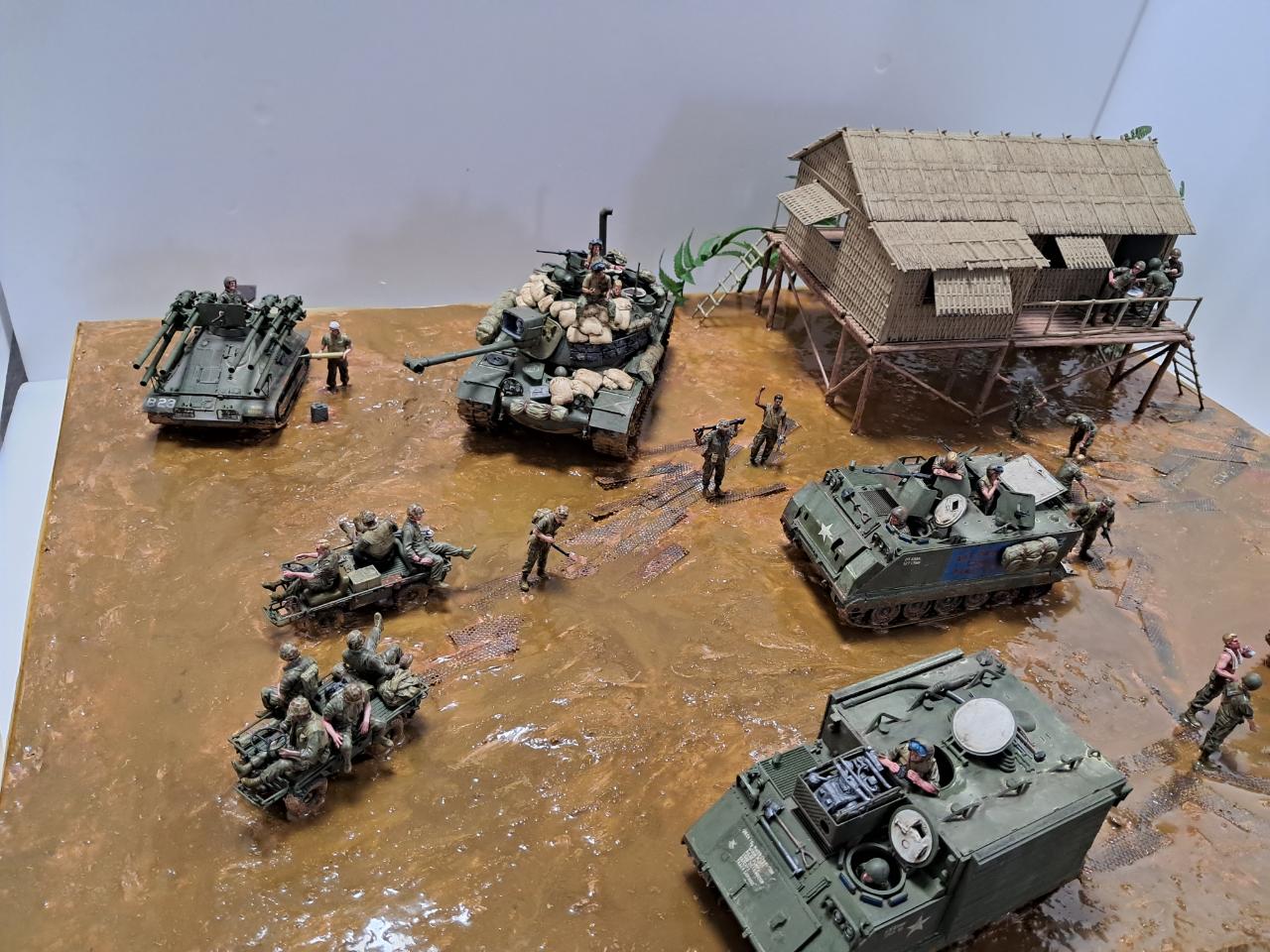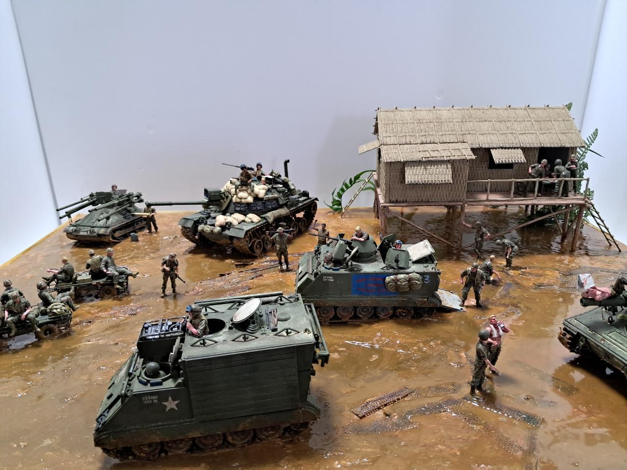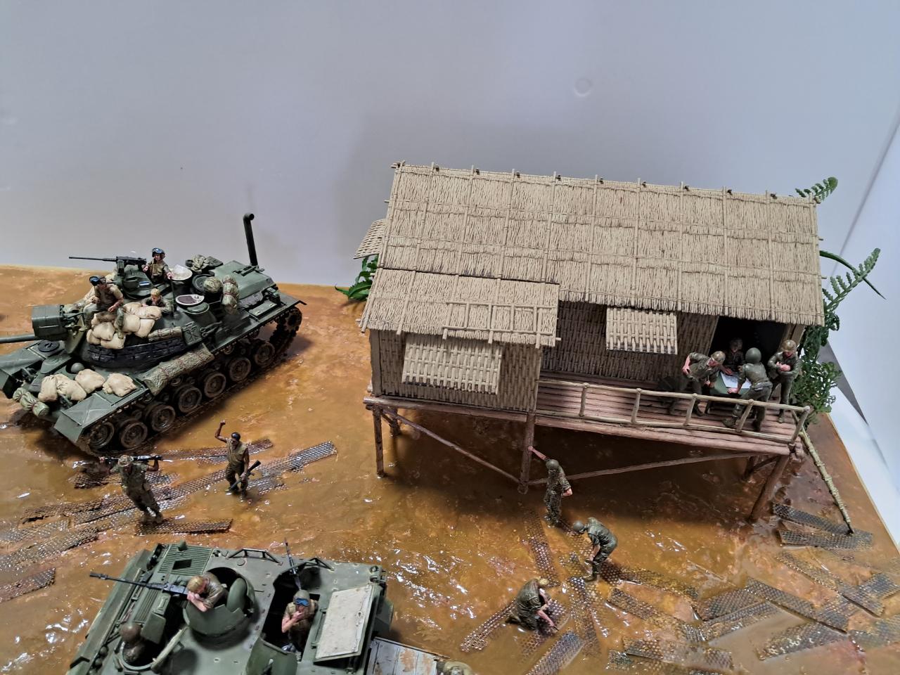 베트남전쟁중에 민가를 본부로 두고 주변을 싹밀었는데 아시다시피 비가 워낙에 많이 오는 지역이라서 뻘밭이 되어서 급하게 철판을 바닥에 깔았지만 그것도 소용이 없는 상태 인것을 표현해 보았습니다