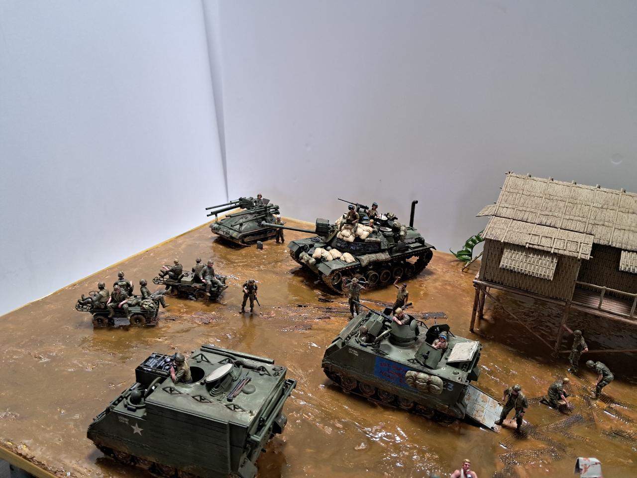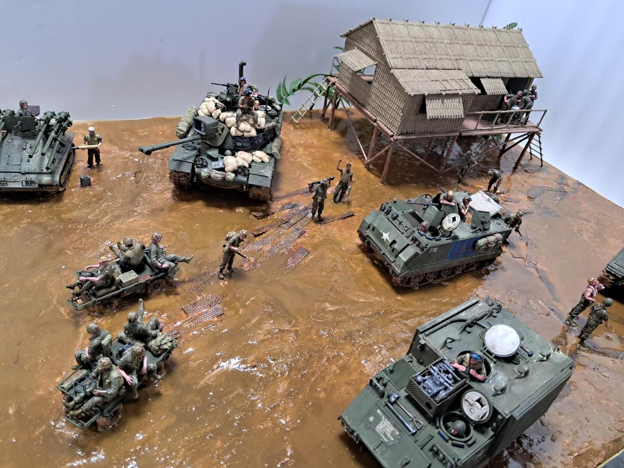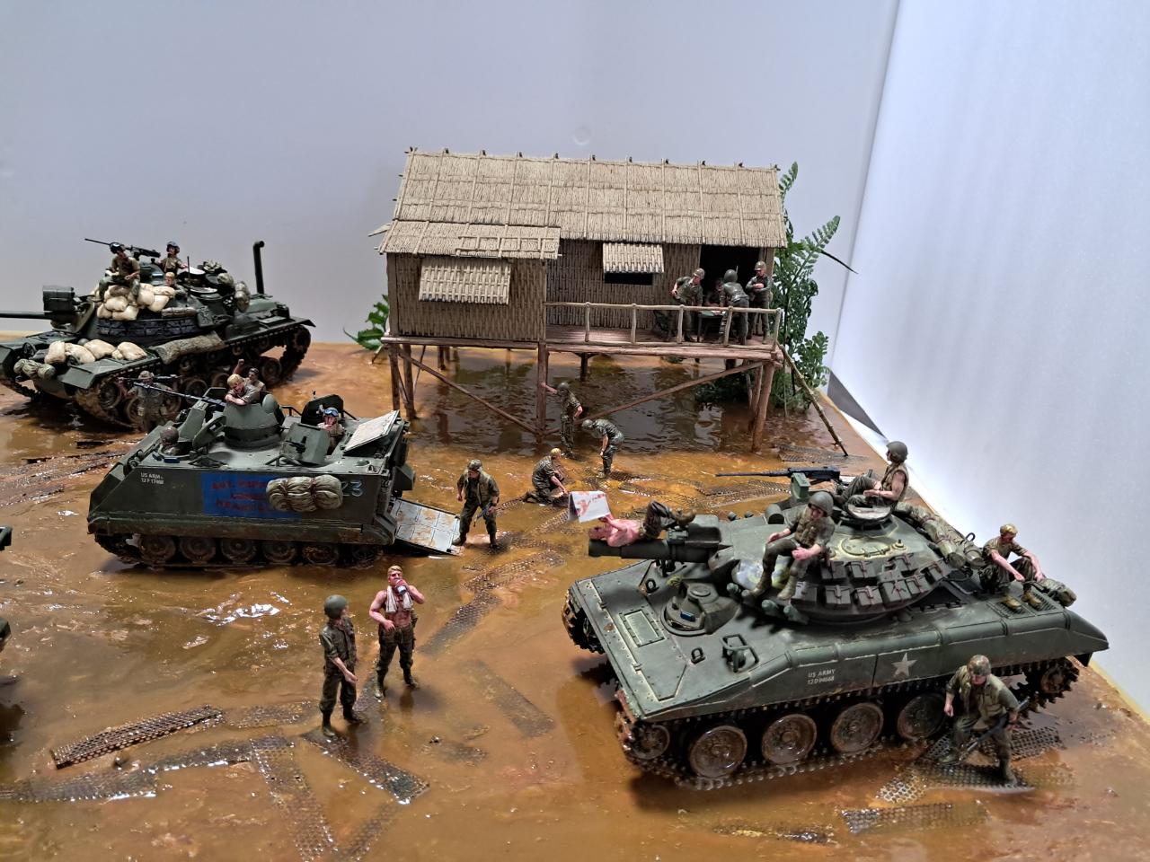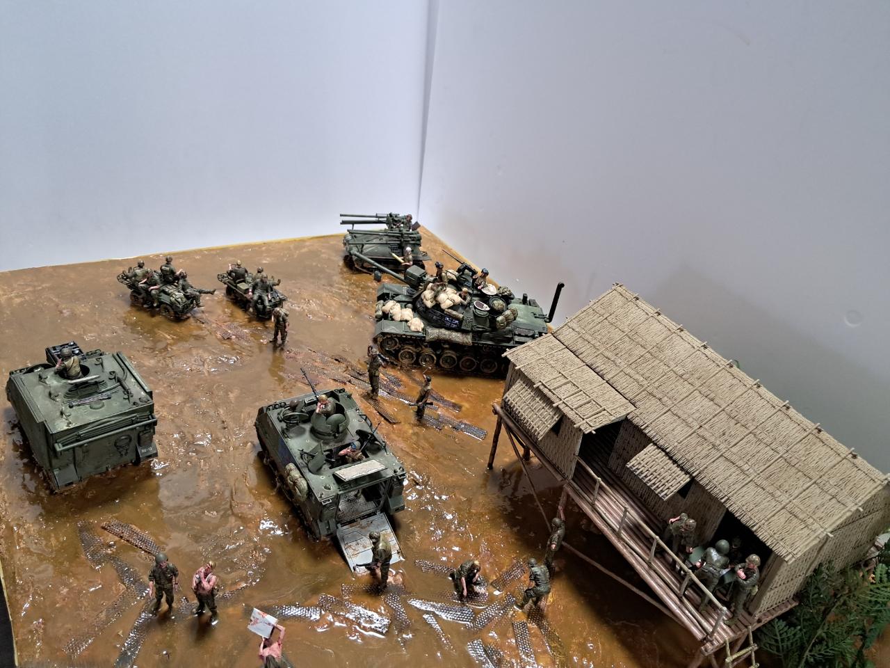 베트남전쟁중에 민가를 본부로 두고 주변을 싹밀었는데 아시다시피 비가 워낙에 많이 오는 지역이라서 뻘밭이 되어서 급하게 철판을 바닥에 깔았지만 그것도 소용이 없는 상태 인것을 표현해 보았습니다