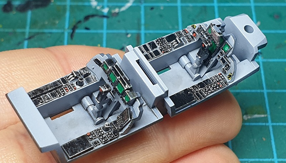 칵핏은 군제 회색 서페이서 위에 검정색 에나멜으로 각종 패널들을 칠해준 뒤 은색 에나멜으로 드라이브러싱 해줬습니다.