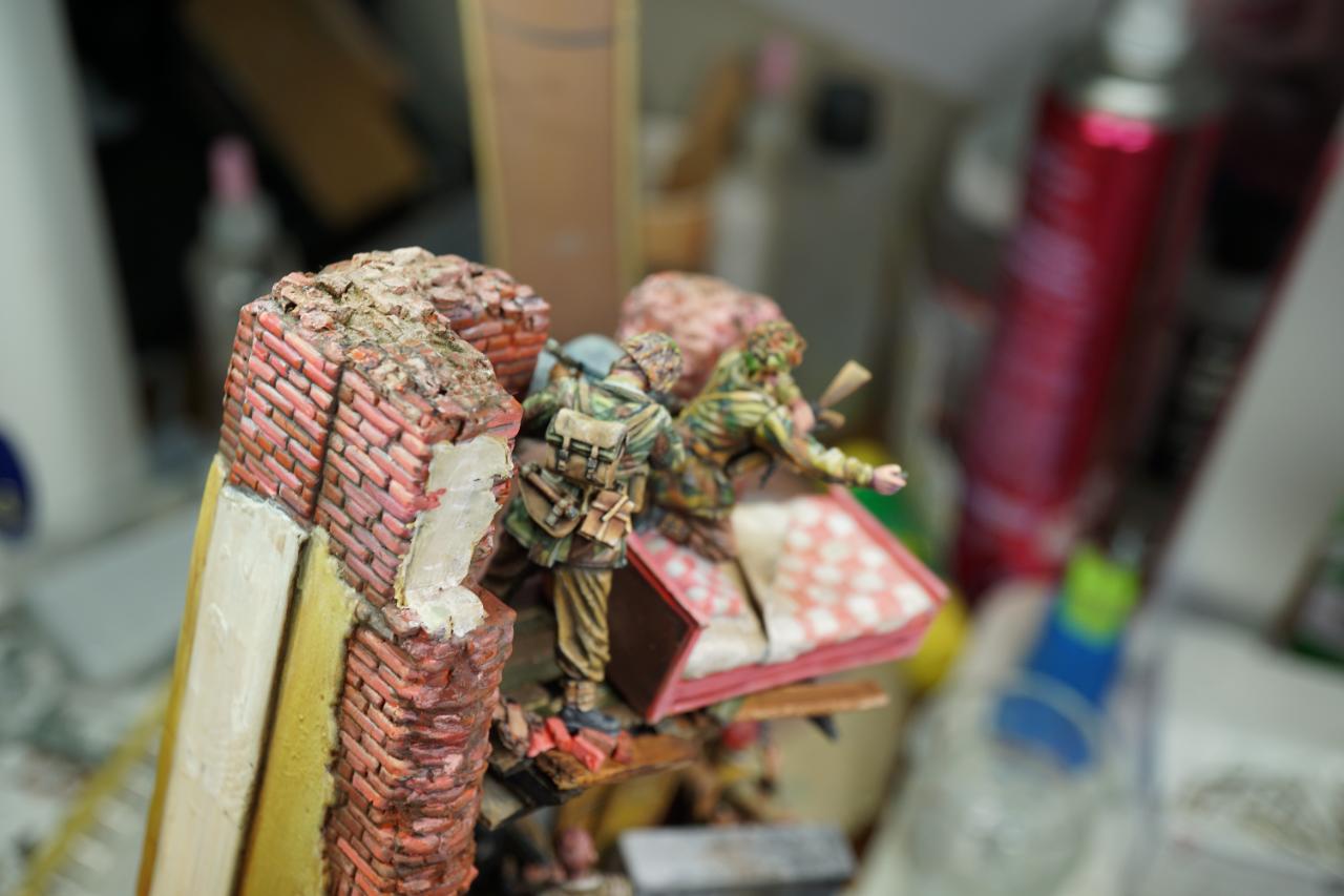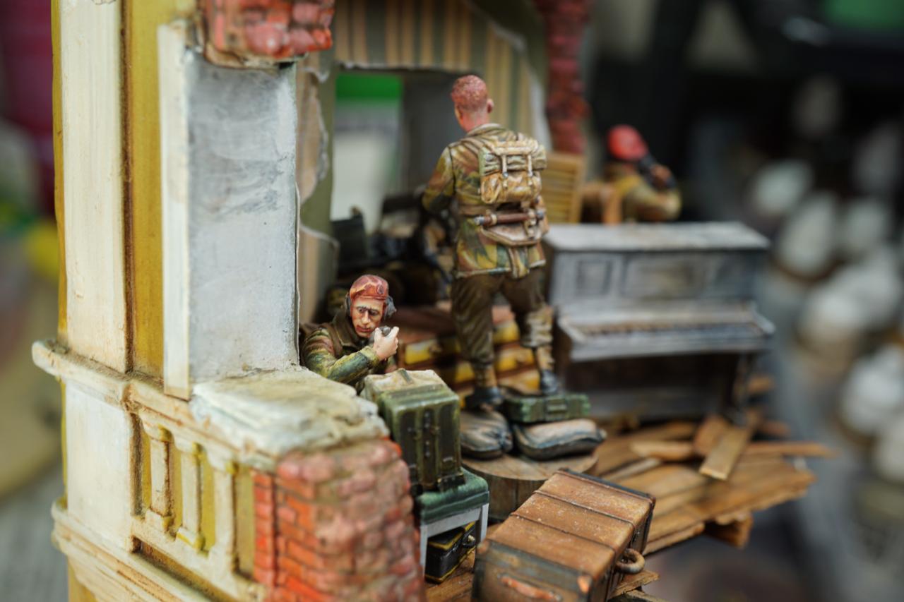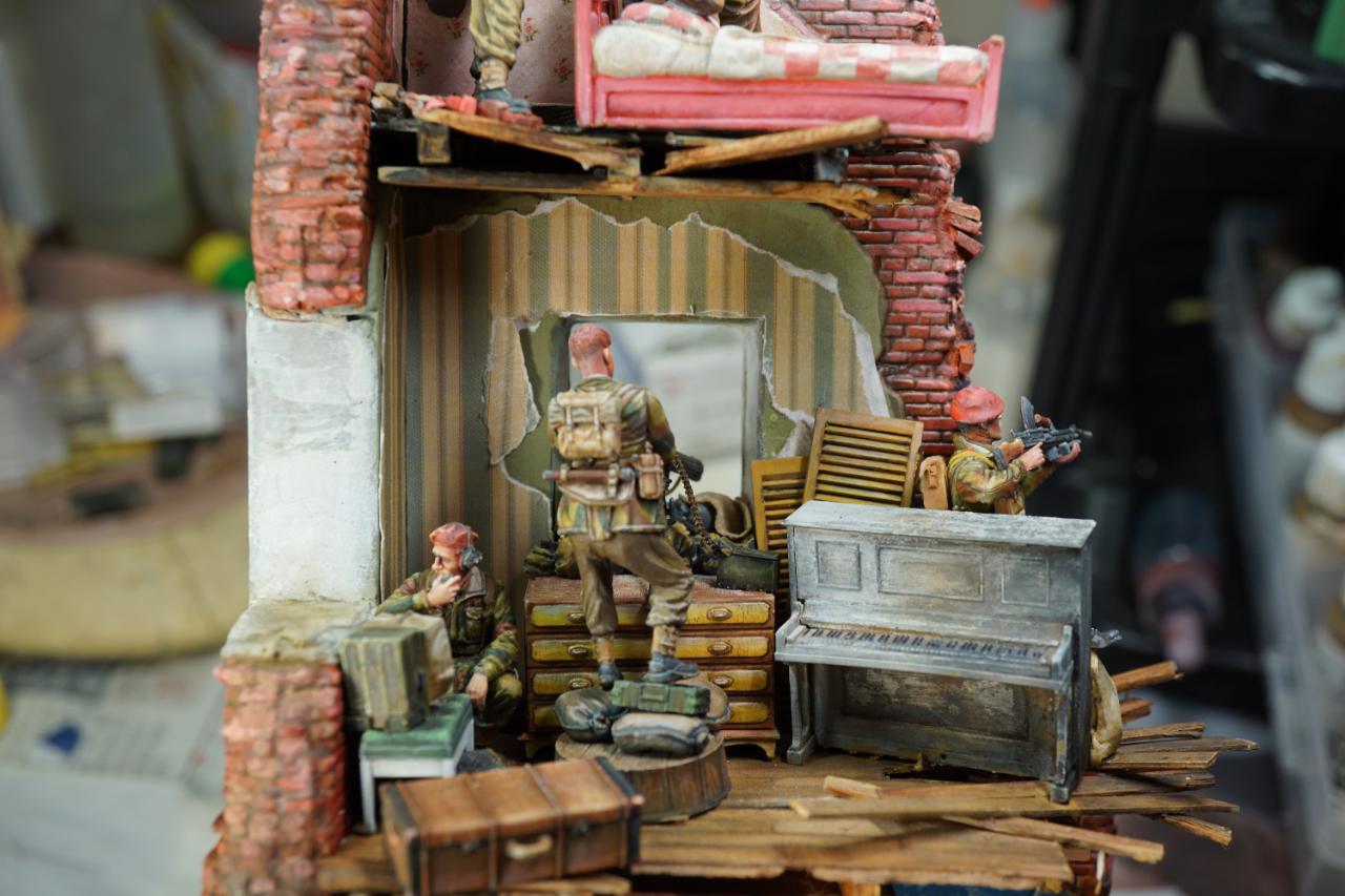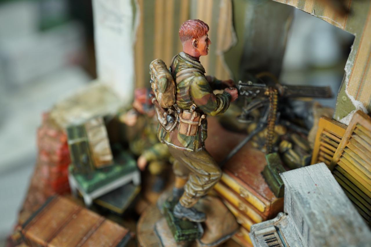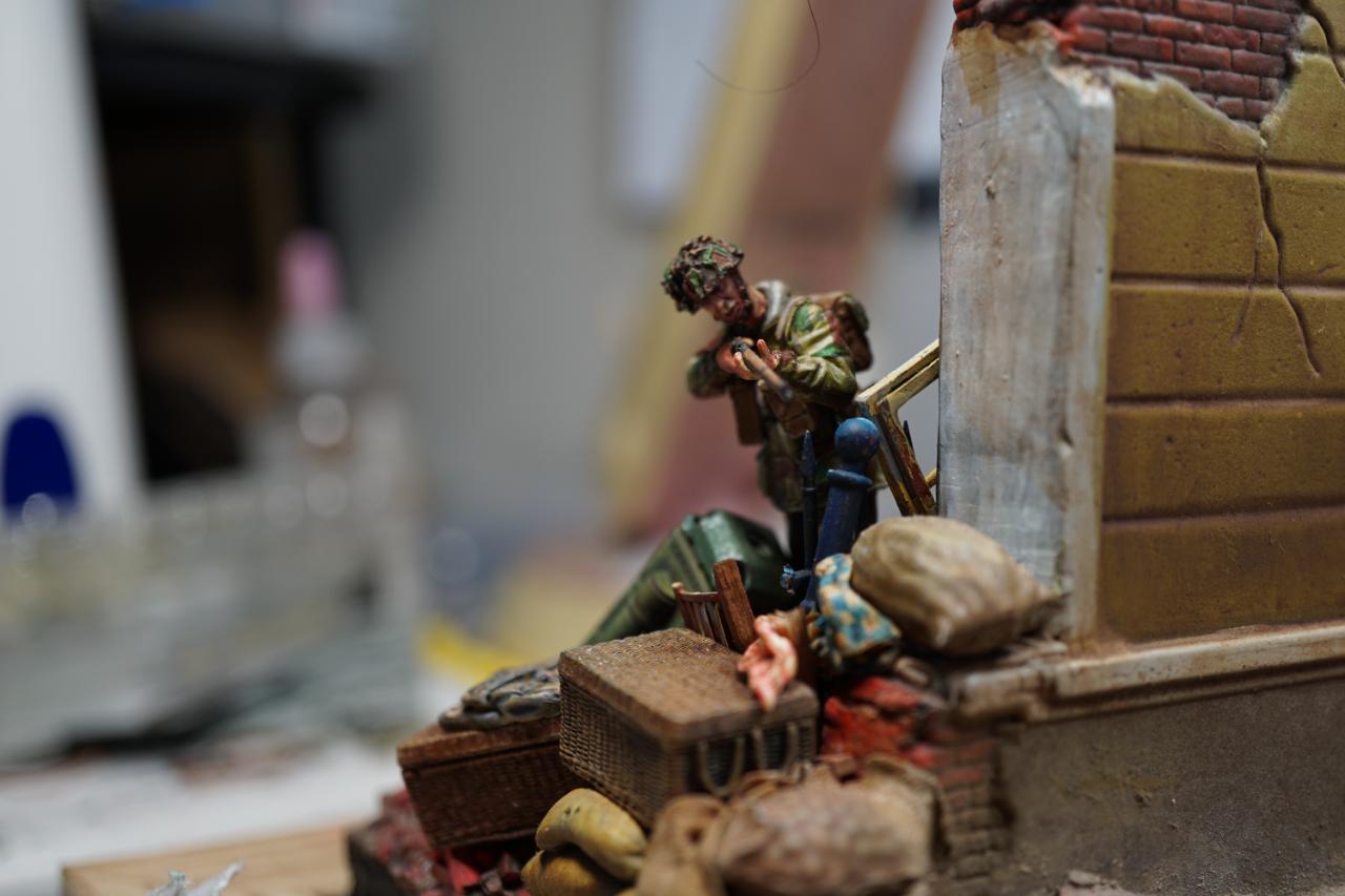 2층의 건물 무너진 틈과 피아노사이에 모래주머니를 쌓아놓고 브렌건을 사격하는 공수부대원입니다. 몸체는 브롱코 자전거 공수병이고 얼굴은 벨린덴제였던것 같습니다.