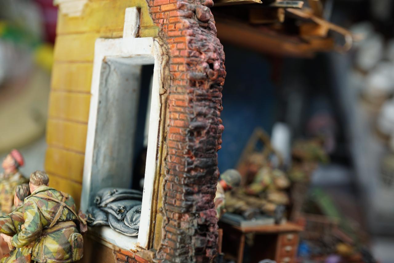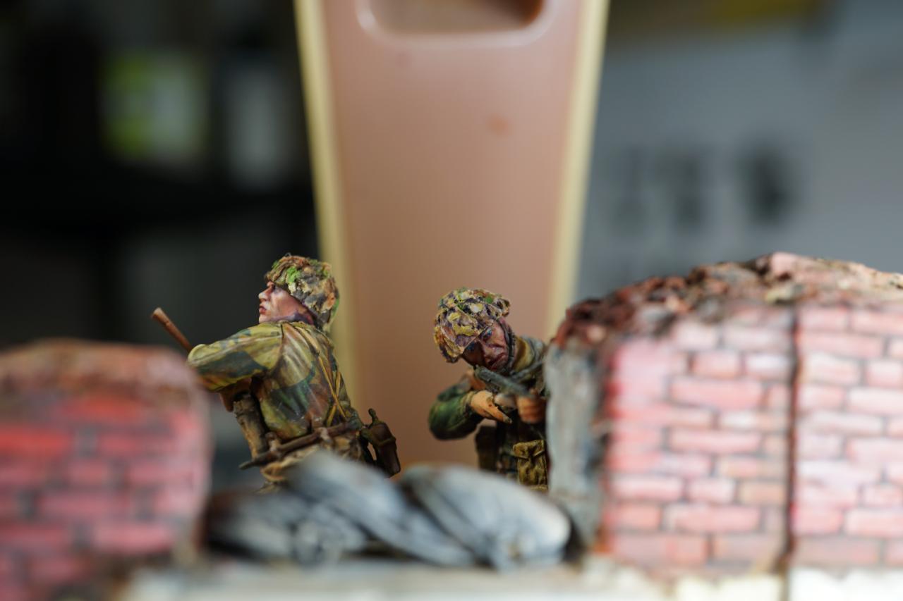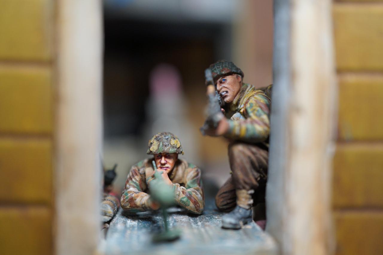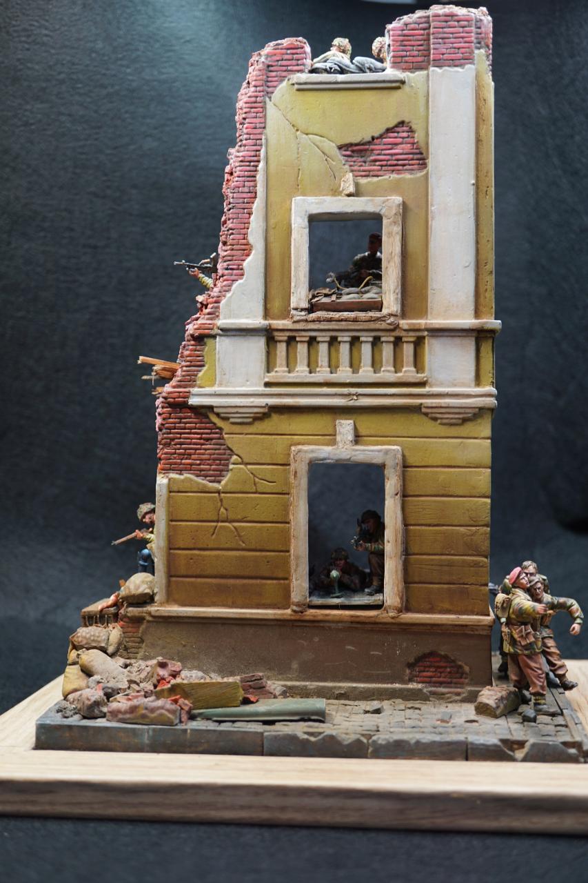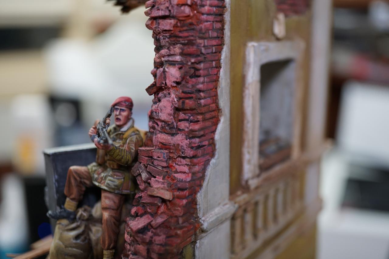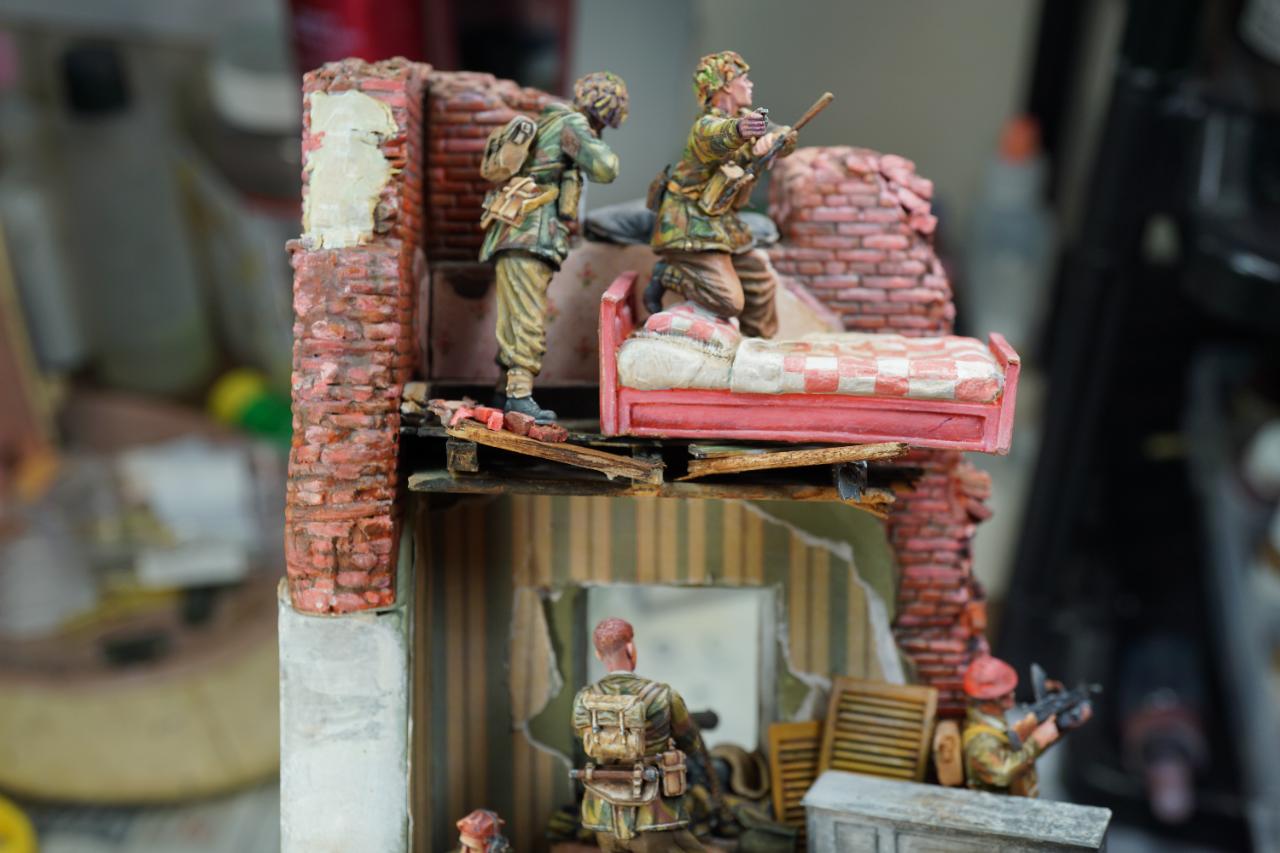 2층의 건물 무너진 틈과 피아노사이에 모래주머니를 쌓아놓고 브렌건을 사격하는 공수부대원입니다. 몸체는 브롱코 자전거 공수병이고 얼굴은 벨린덴제였던것 같습니다.