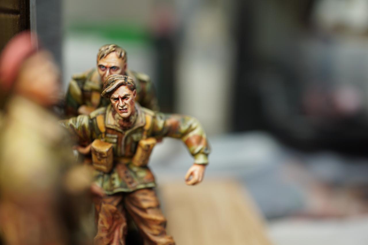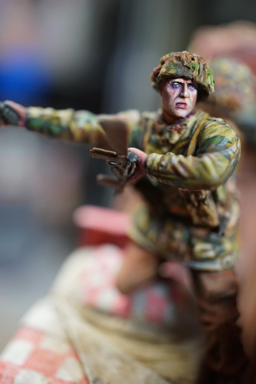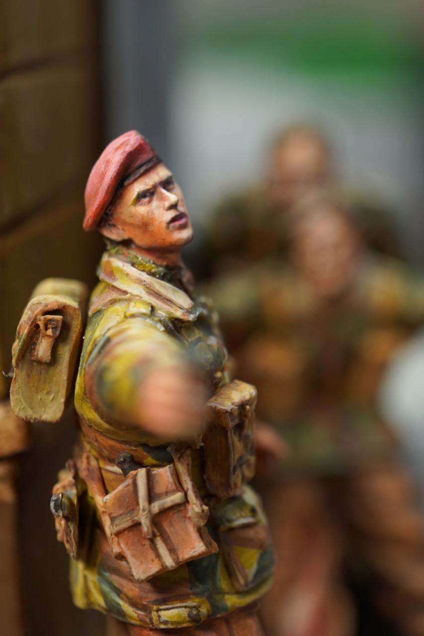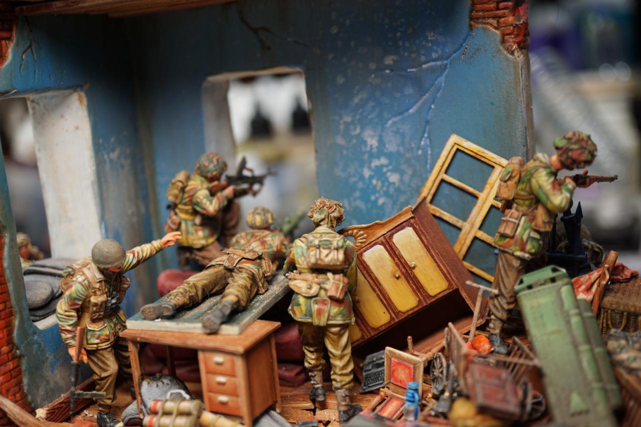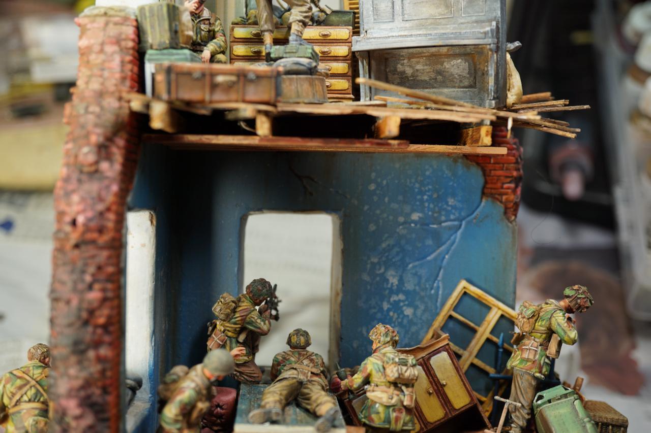 2층의 건물 무너진 틈과 피아노사이에 모래주머니를 쌓아놓고 브렌건을 사격하는 공수부대원입니다. 몸체는 브롱코 자전거 공수병이고 얼굴은 벨린덴제였던것 같습니다.