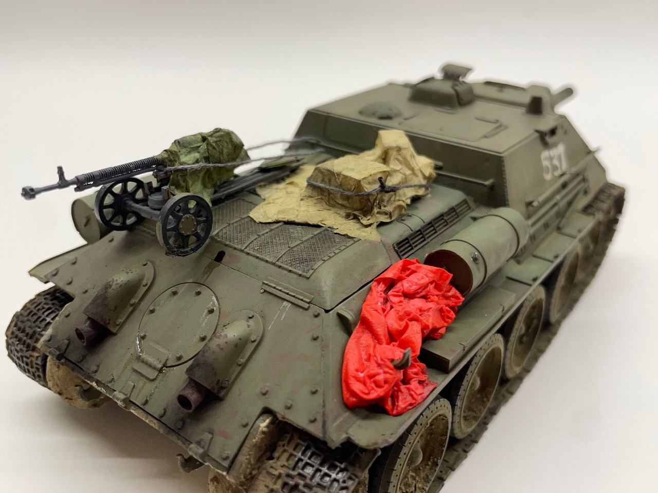타미야 T-34/76 chtz공장 버전에 포힘된 dshk 기관총과 스트라이폼으로 짐들을 만들었습니다