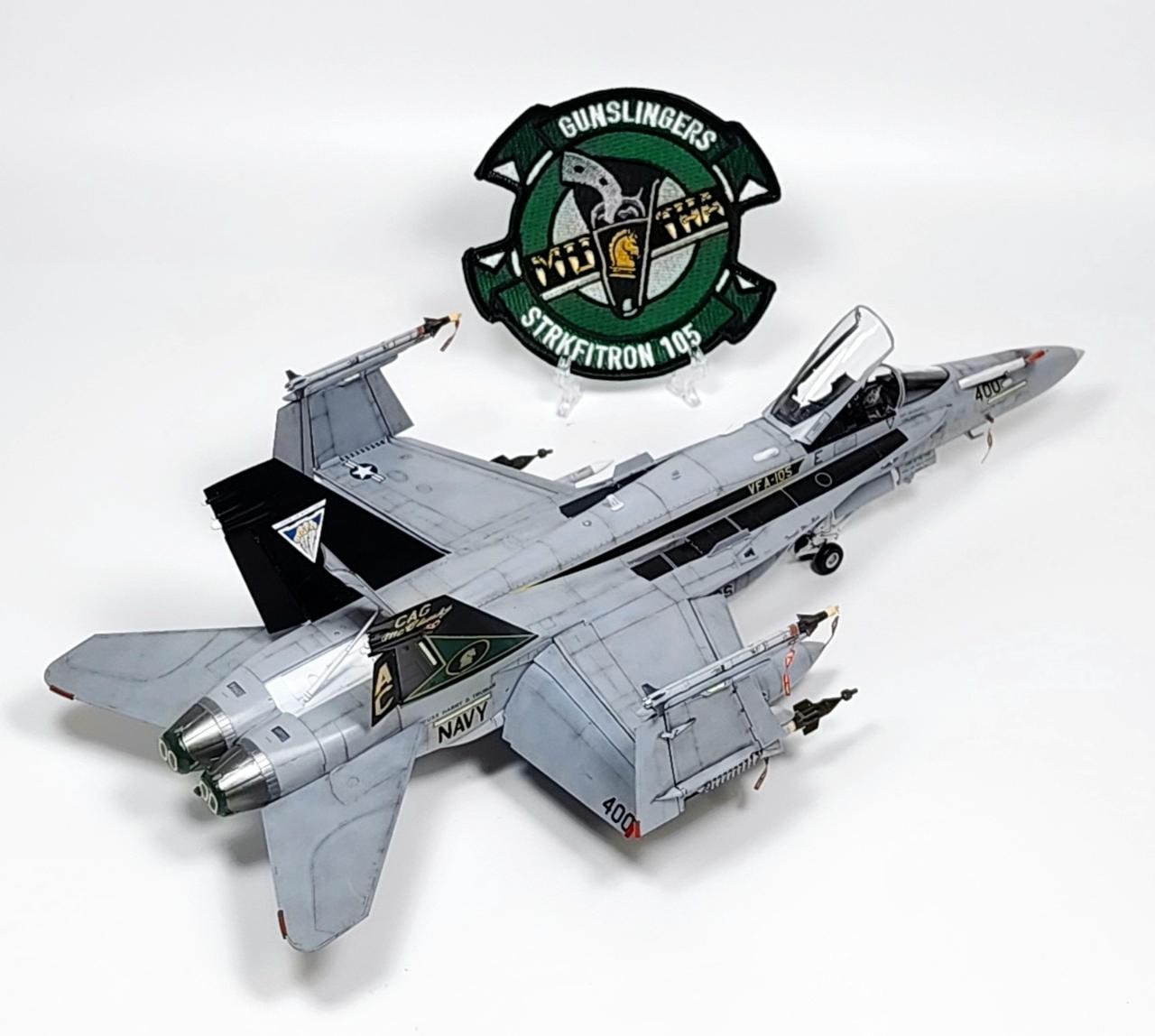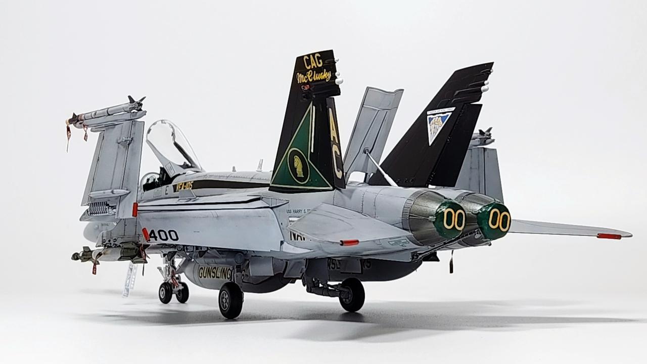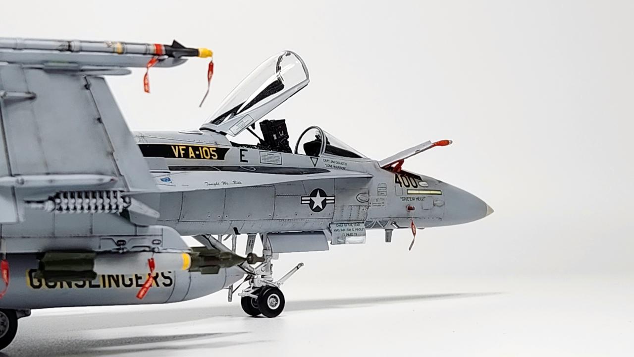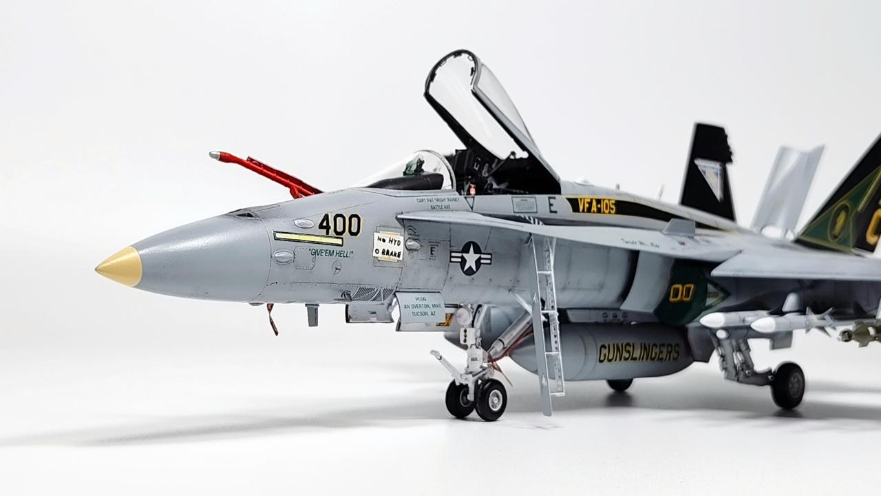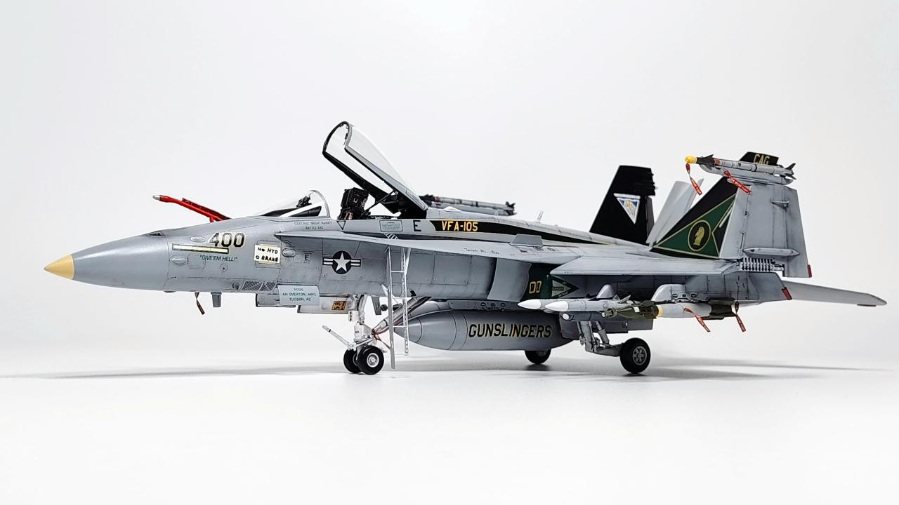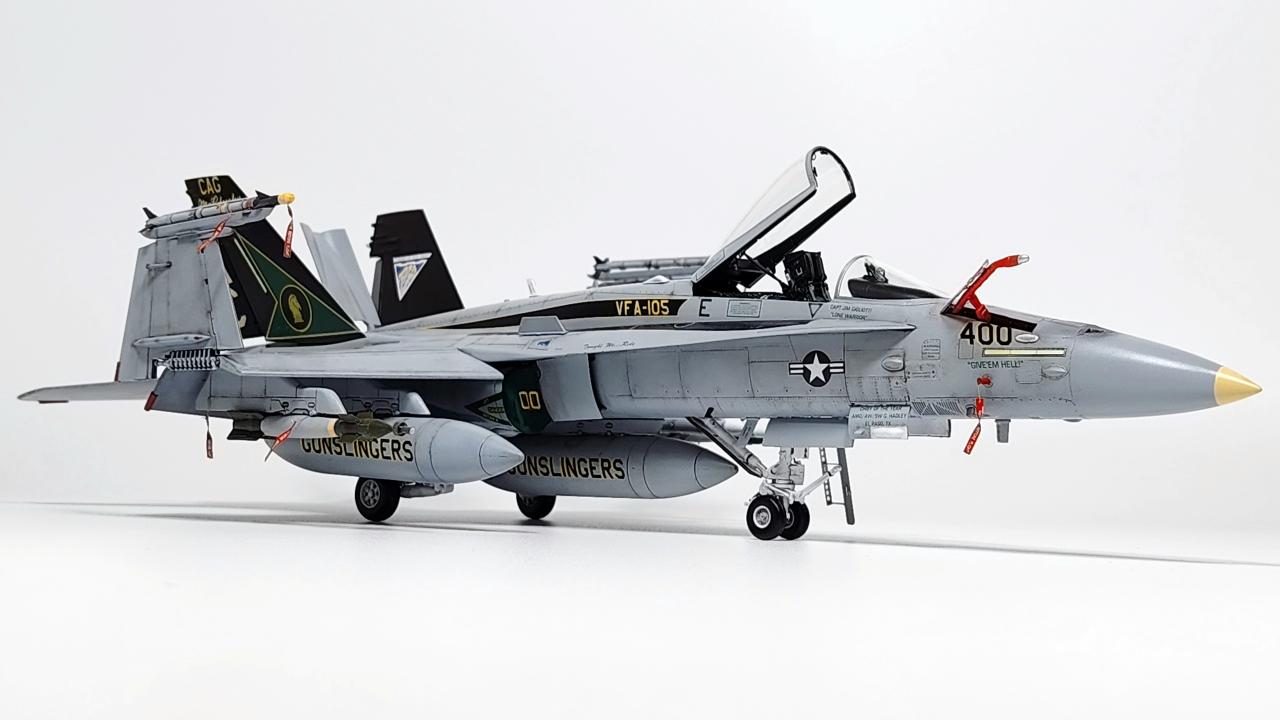 원래는 VFA-34 Blue Blasters의 2017년 Last Flight CAG로 제작하고 싶었으나 마땅한 데칼을 구하지 못해 VFA-105로 제작하였습니다. 인테이크/배기구 FOD는 별매를 사용했습니다.