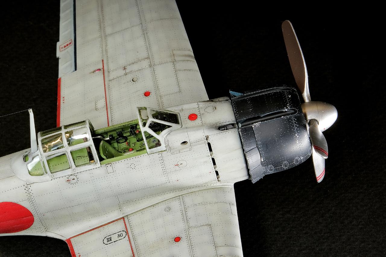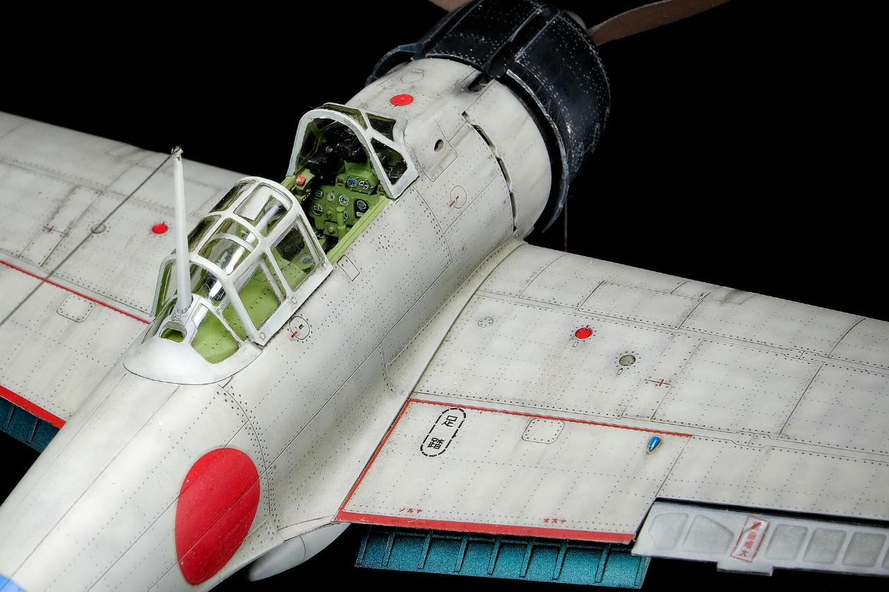 청죽색 제로전투기는 레퍼런스가 되는 거칠고 과감한 웨더링 표현이 많이 있는데 밝은회색은 사용기간이 짧아서 인지 참고할 만한 자료를 찾기 힘들었습니다. 그래서 웨더링은 기체전체에 리벳을 따라 음영을 주고 약간의 도색 벗겨짐, 오염의 표현 정도로 마무리 했습니다.