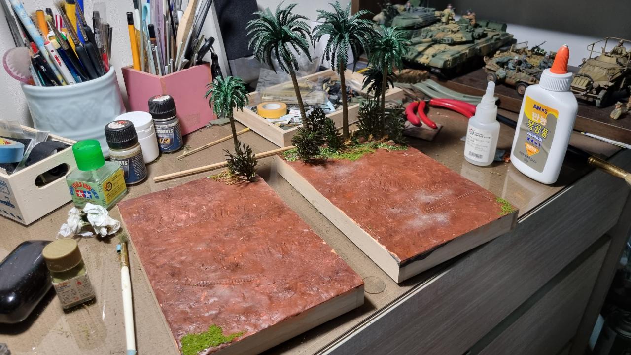 집의 공간문제로 두개의 나무 트레이를 붙여서 만들기로 합니다. 지점토에 아크릴물감을.. 그리고 야자수는 알리에서 저렴히 파는녀석을 도색한 것이고 그 아래 나무는 어항용 물풀을 적당히 재단한 것입니다.