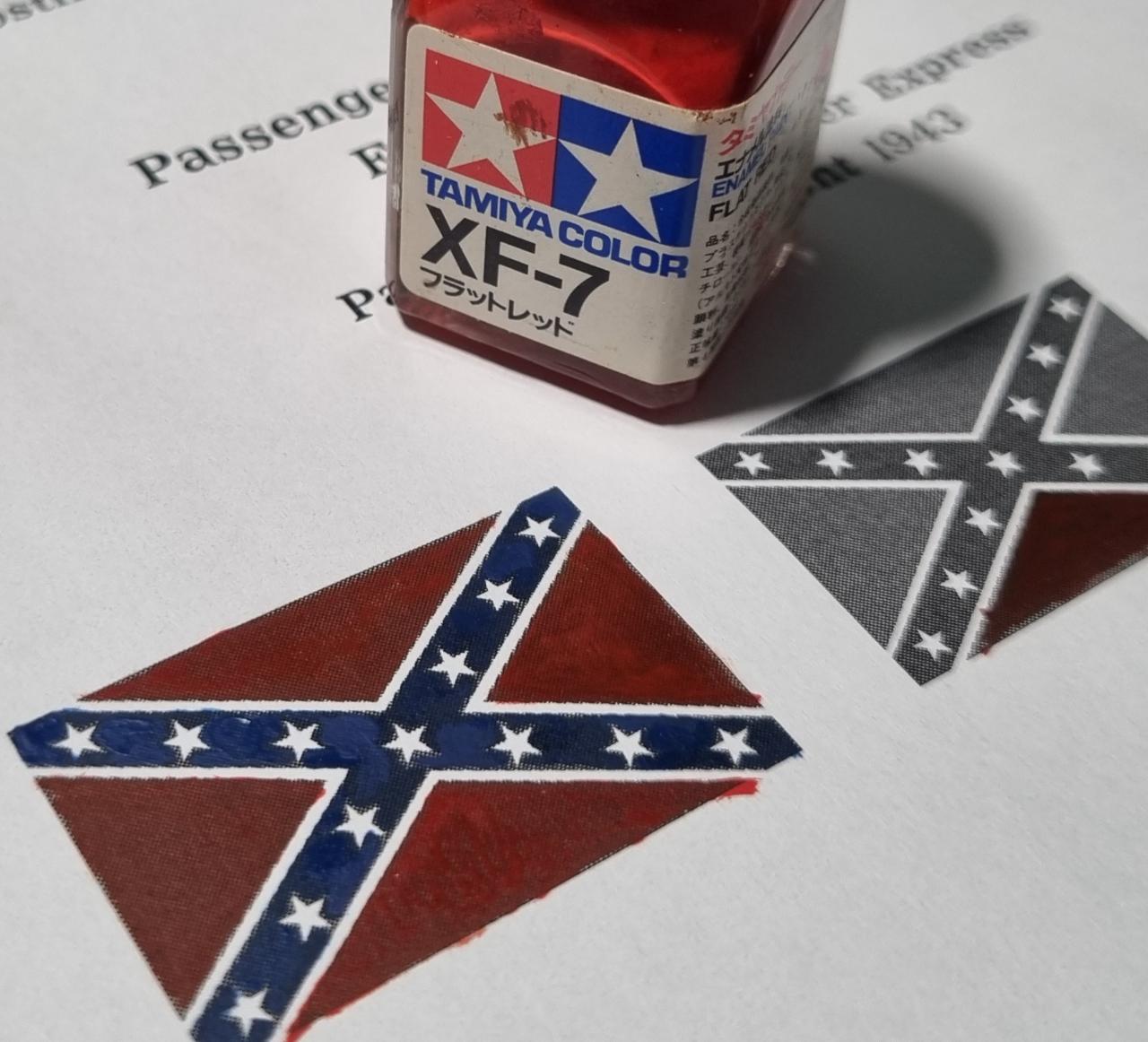 이대로는 좀 밋밋해서 종이로 남군 깃발을 만들어 올려주기로 합니다. 집에 흑백프린터밖에 없어서 에나멜로 칠해줍니다. 이거 말고 기병대 깃발도 만들어 차량에 달아주었습니다.