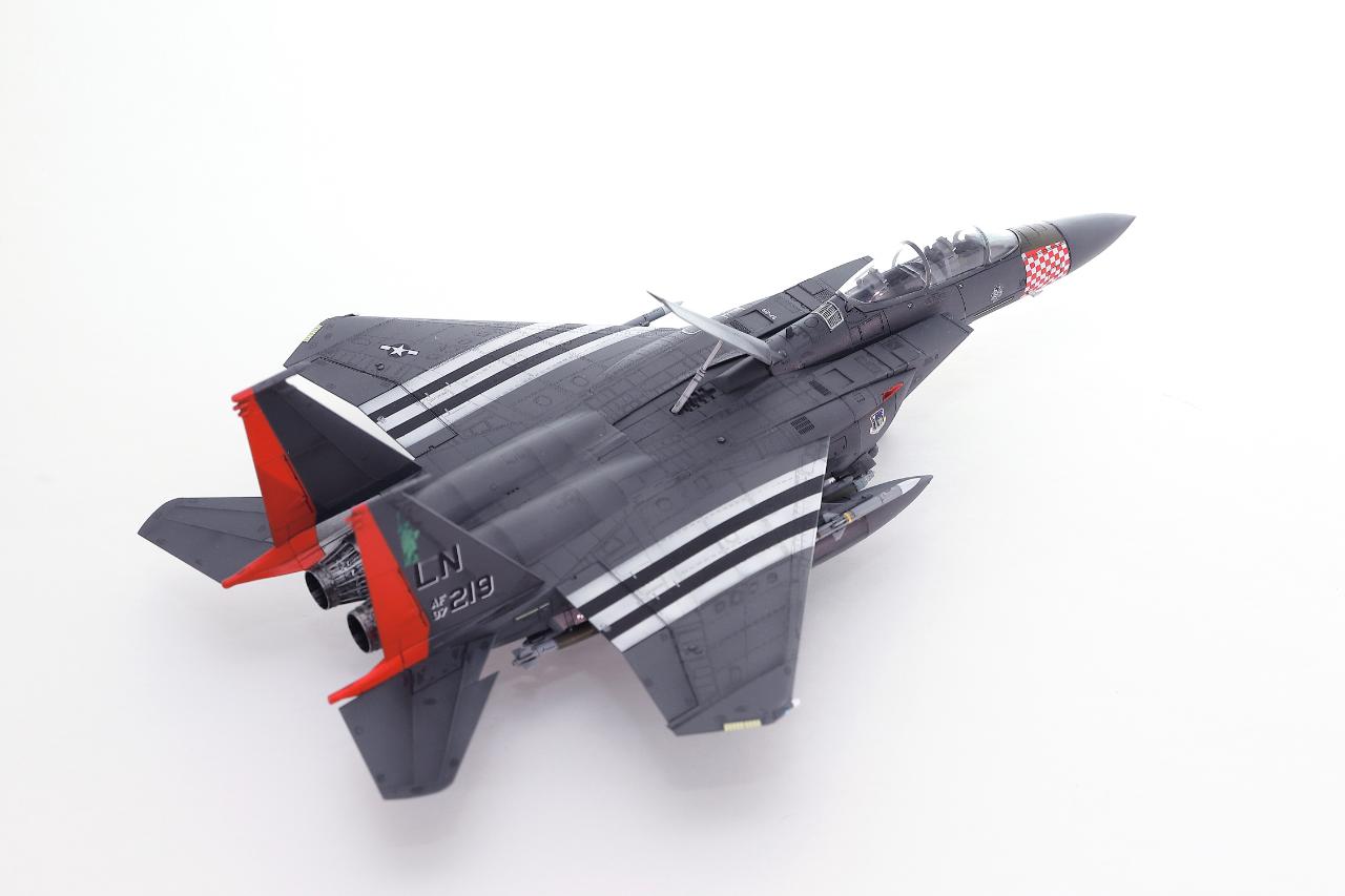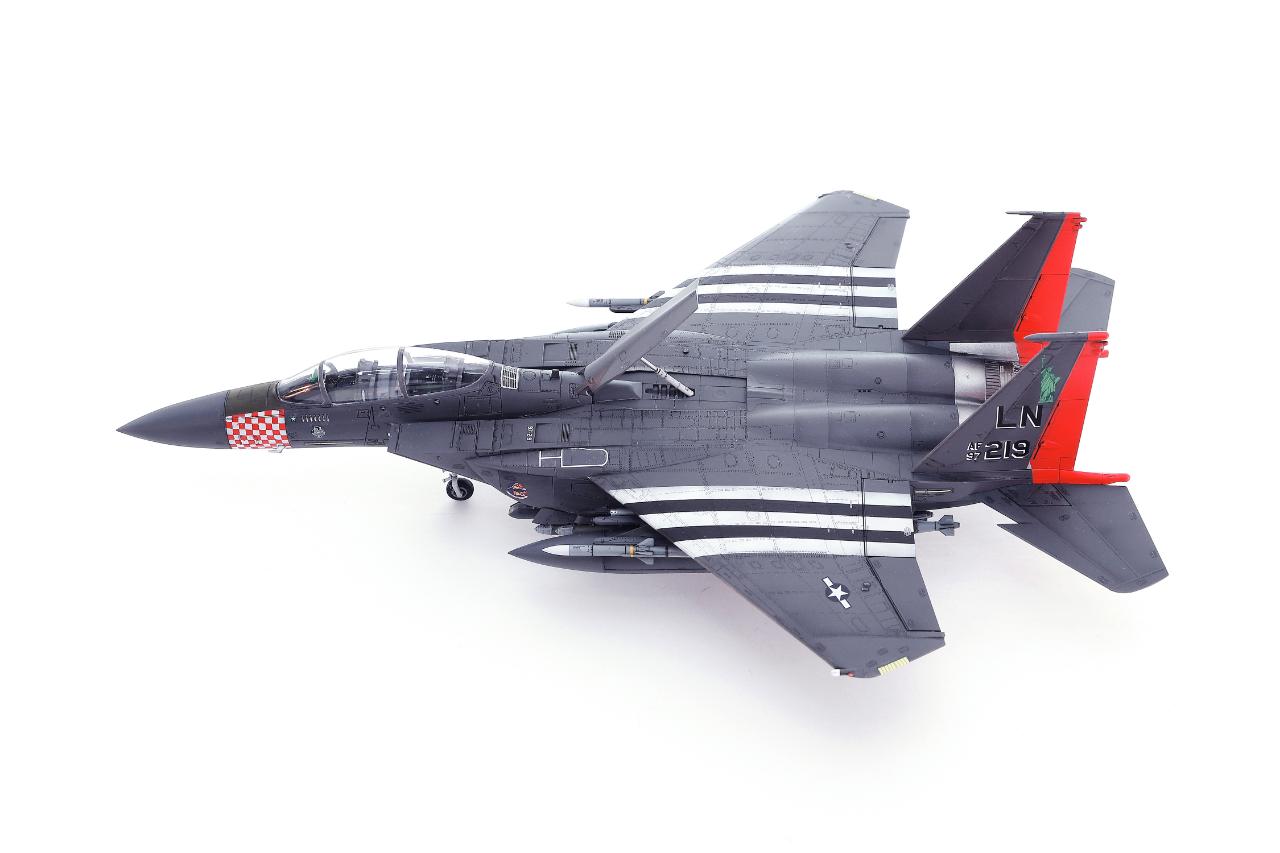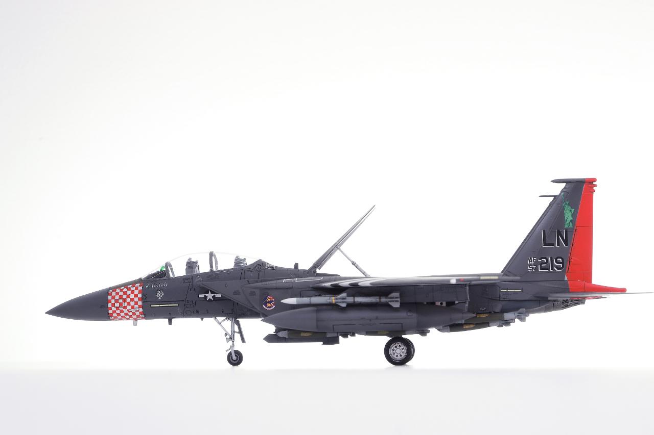 마킹이 화려한 아카데미 F-15E입니다. 1/72 스케일에 조립성과 디테일이 훌륭해서 즐겁게 작업했습니다. 주익과 배면 스트라이프와 붉은색 위장무늬는 스텐실로 도장했습니다. 기수의 깨알같은 체크무늬 스텐실은 인내심을 테스트하는 기분으로 마무리했구요.