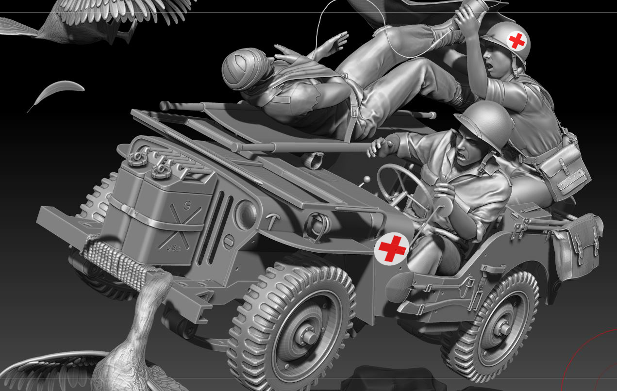긴급한 부상병을 이송하다가 오리떼를 만나 놀라는 병사들을 코믹하게 표현해 보았습니다.