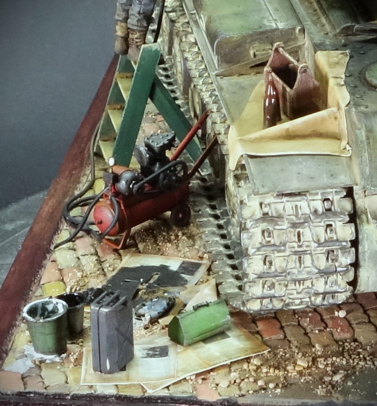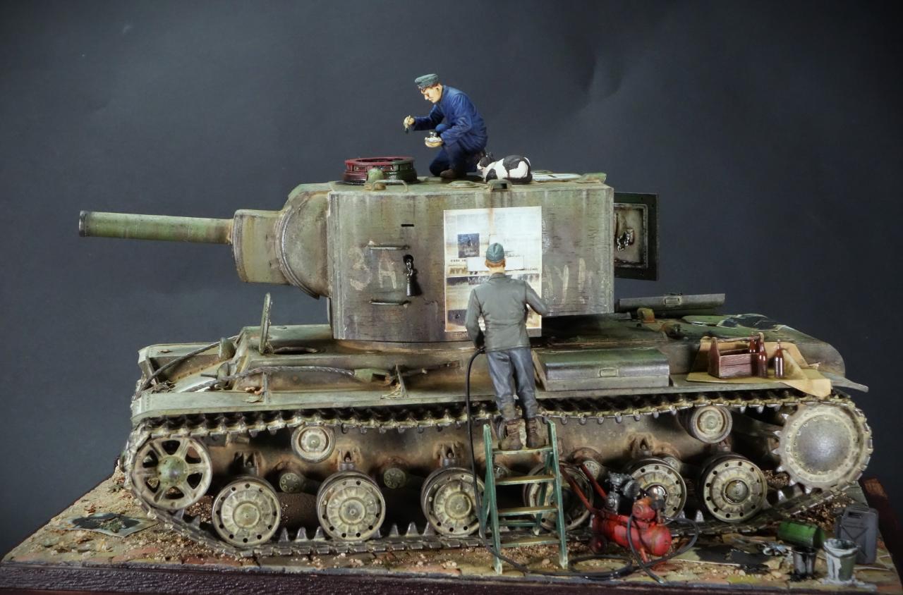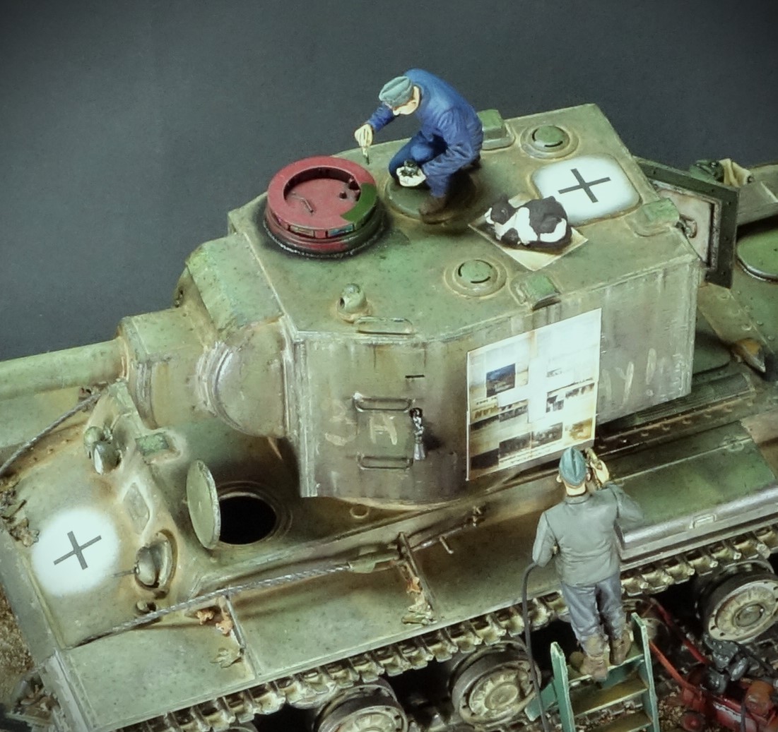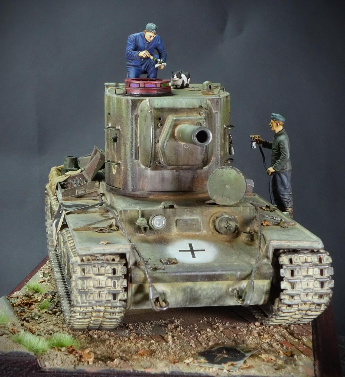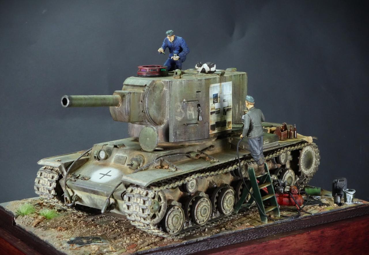 파죽지세로 진격하는 독일군 앞에 나타난 거대한 KV-2 전차를 소련군으로 부터 노획하여 자신들의 장비로 활용하기 위해 국적 마크를 재도장하고 있는 독일군 정비병들의 모습을 표현해 보았습니다. 그동안 친해진 냥이 친구도 거들어 주고 있네요.