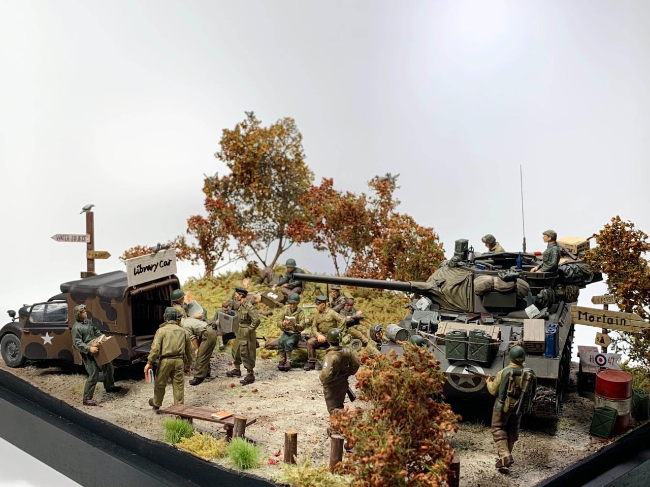 "네덜란드 내 어딘가, 최전선과는 조금 떨어진 재정비구역, 삼거리 교차로에서 움직이는 깜짝 도서관(Library Car)이 등장합니다. 제 각각 휴게하던, 지나가던 병사들은 그간 읽고싶었던 책이나 신문을 꺼내들어 전선에서 받은 스트레스를 잠시 잊습니다. 책을 읽는 동안엔 세계대전임을 잠시 잊고 평화롭게 마음을 가다듬습니다."