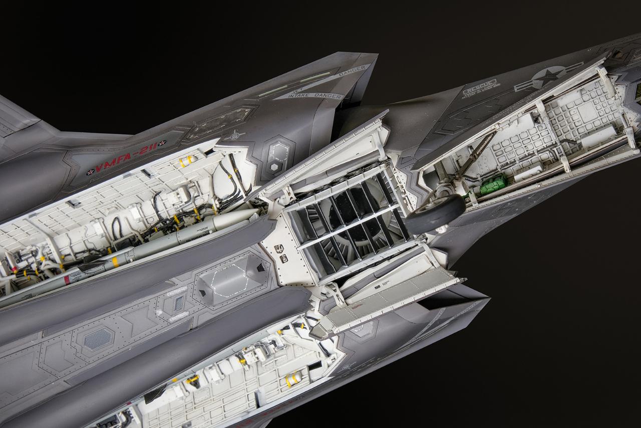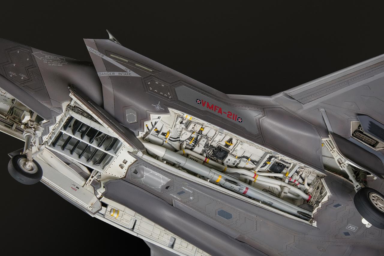 무장은 내부 웨폰베이만 무장하는 스텔스모드, 날개 끝에 파일런을 달아서 사이드와인더를 추가하는 공대공모드, 날개 안쪽에 파일런 4개를 더 달아서 폭장을 추가할 수 있는 비스트모드 3가지를 선택할 수 있는데 수직이착륙시에는 중량제한이 있어서 외부폭장을 못 한다고 합니다. 그래서 웨폰베이 안쪽에 암람2발과 날개 끝 사이드와인더2발로 마무리 했습니다.