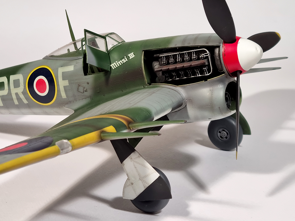 허리케인의 동체 하부에 위치한 라디에이터가 기수 하방으로 이동하여서 전혀 연관성이 없는 다른 기체로 보입니다만, 라디에이터를 제외한 랜딩기어나 날개의 모습은 아버지인 허리케인을 쏙빼닮았습니다.