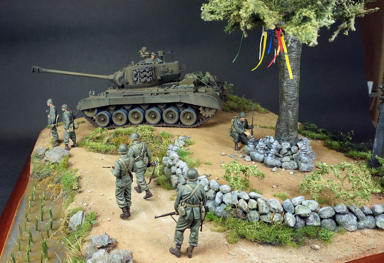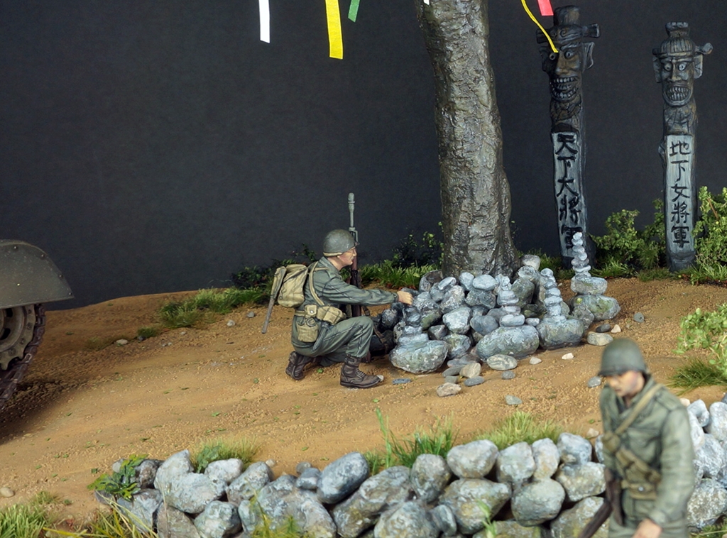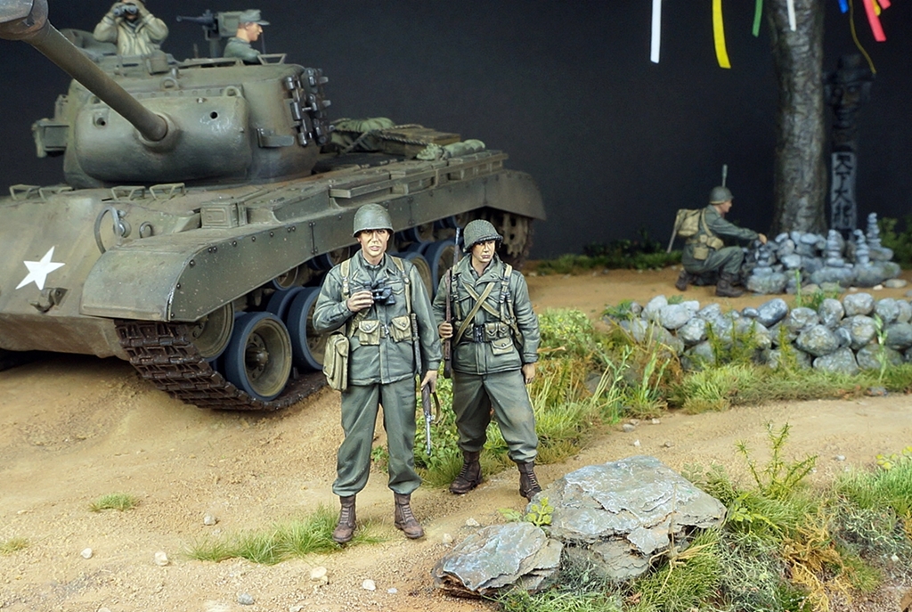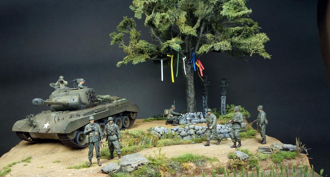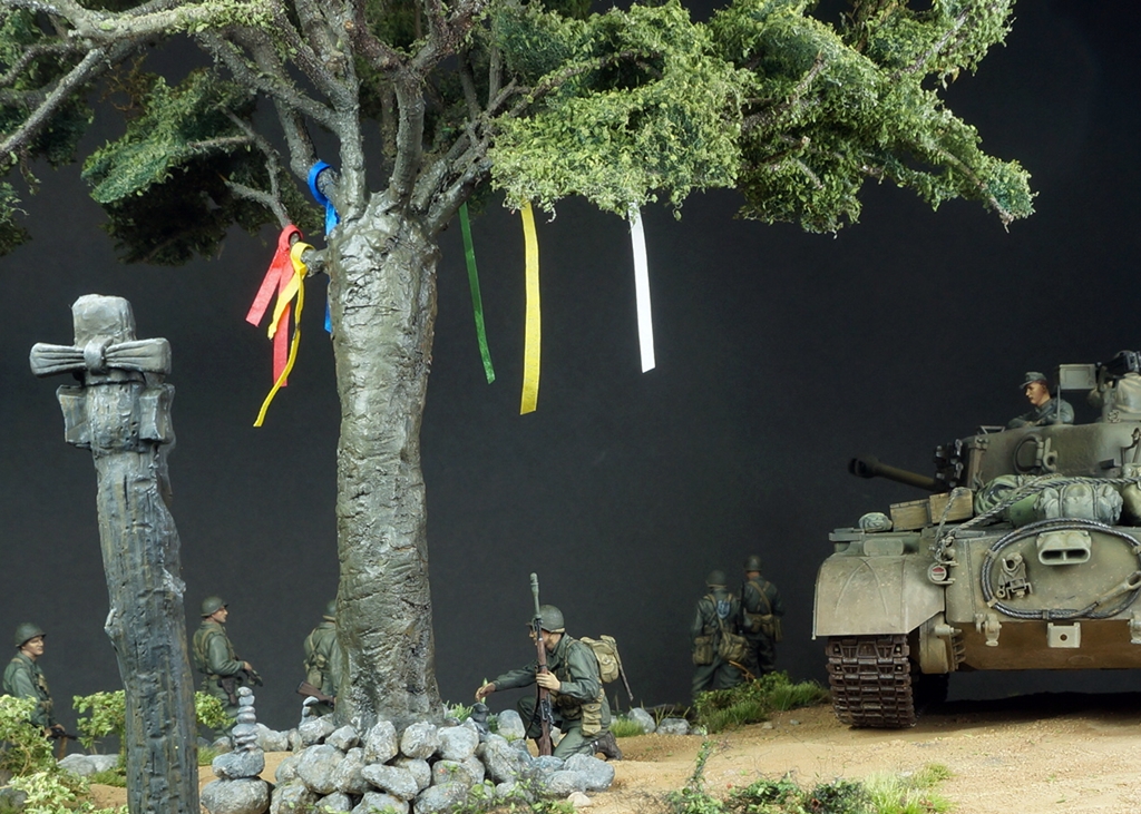 한국전쟁 디오라마입니다. 배경은 인천상륙작전 이후 경기도 어딘가 북진을 하는 미군의 모습입니다. "바라보다"의 사전적의미는 시각적으로 어딘가를 바라보다와 흔히 우리가 바램이라고 하는 그 바라봄의 두가지 의미를 같이 갖고 있습니다. 전통무속신앙인 성황당(서낭당)나무 아래 전쟁이 끝나고 집에 무사히 돌아가길 '바라'며 돌을 쌓는 한 병사와 그를 '바라'보는 병사들, 그리고 나아가야할 목표를 '바라'보는 전차장과 장교들... 여러가지 의미에서 바라봄을 담고자 했습니다. 개인적으로 우리의 역사이기도 하고 우리가 가장 잘 표현할수 있는 전쟁인 한국전쟁이 모델러들 사이에 많이 작품화 되길 '바라'는 마음도 있습니다.
