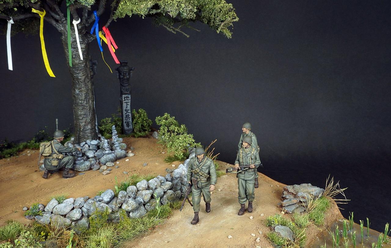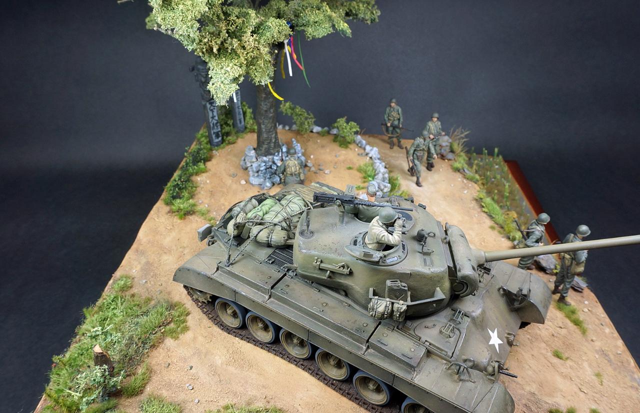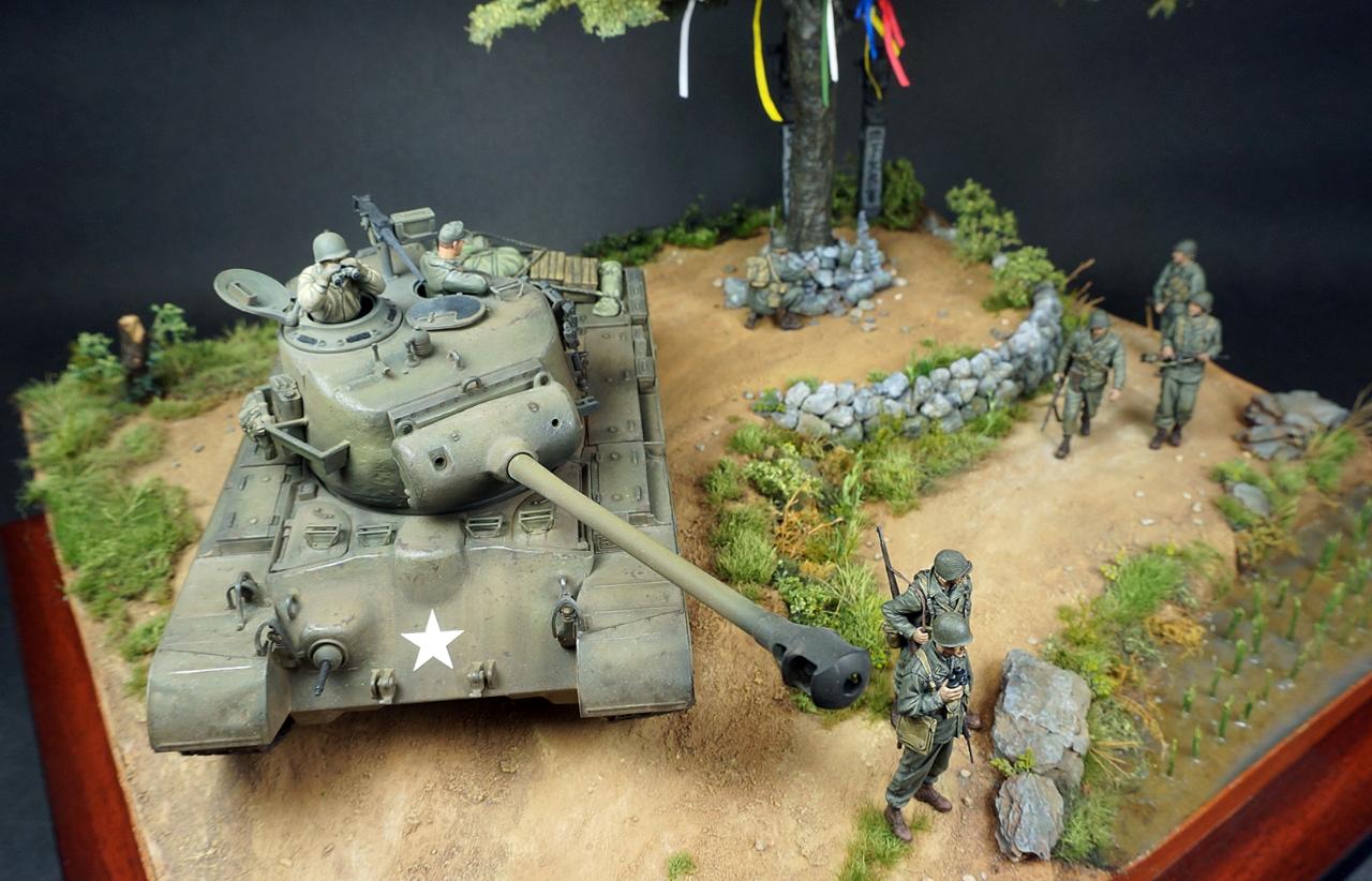 한국전쟁 디오라마입니다. 배경은 인천상륙작전 이후 경기도 어딘가 북진을 하는 미군의 모습입니다. "바라보다"의 사전적의미는 시각적으로 어딘가를 바라보다와 흔히 우리가 바램이라고 하는 그 바라봄의 두가지 의미를 같이 갖고 있습니다. 전통무속신앙인 성황당(서낭당)나무 아래 전쟁이 끝나고 집에 무사히 돌아가길 '바라'며 돌을 쌓는 한 병사와 그를 '바라'보는 병사들, 그리고 나아가야할 목표를 '바라'보는 전차장과 장교들... 여러가지 의미에서 바라봄을 담고자 했습니다. 개인적으로 우리의 역사이기도 하고 우리가 가장 잘 표현할수 있는 전쟁인 한국전쟁이 모델러들 사이에 많이 작품화 되길 '바라'는 마음도 있습니다.