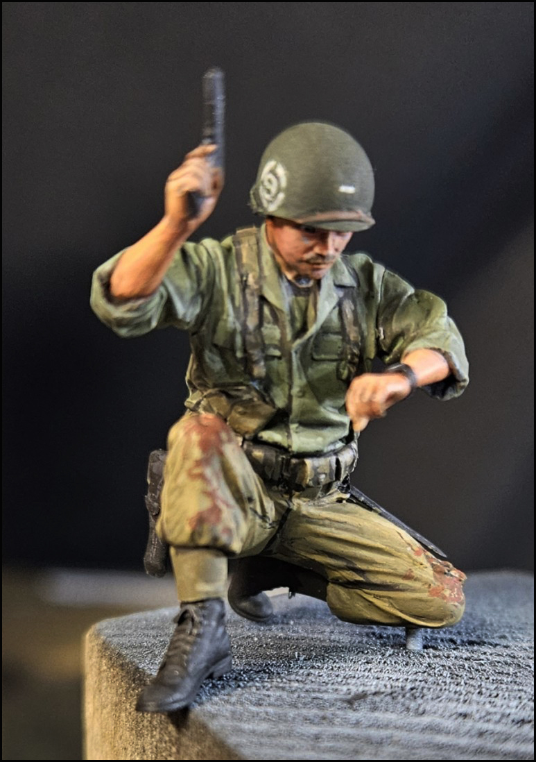 제품을 수정해서 이미 전투를 치뤘던 병사들은 부상흔적을 표현했습니다. 붕대를 감은 각도를 크게 만들어, 후방에서 치료한 게 아니고, 전투 중에 마구잡이로 막 묶어버린 느낌을 살리려고 했습니다.