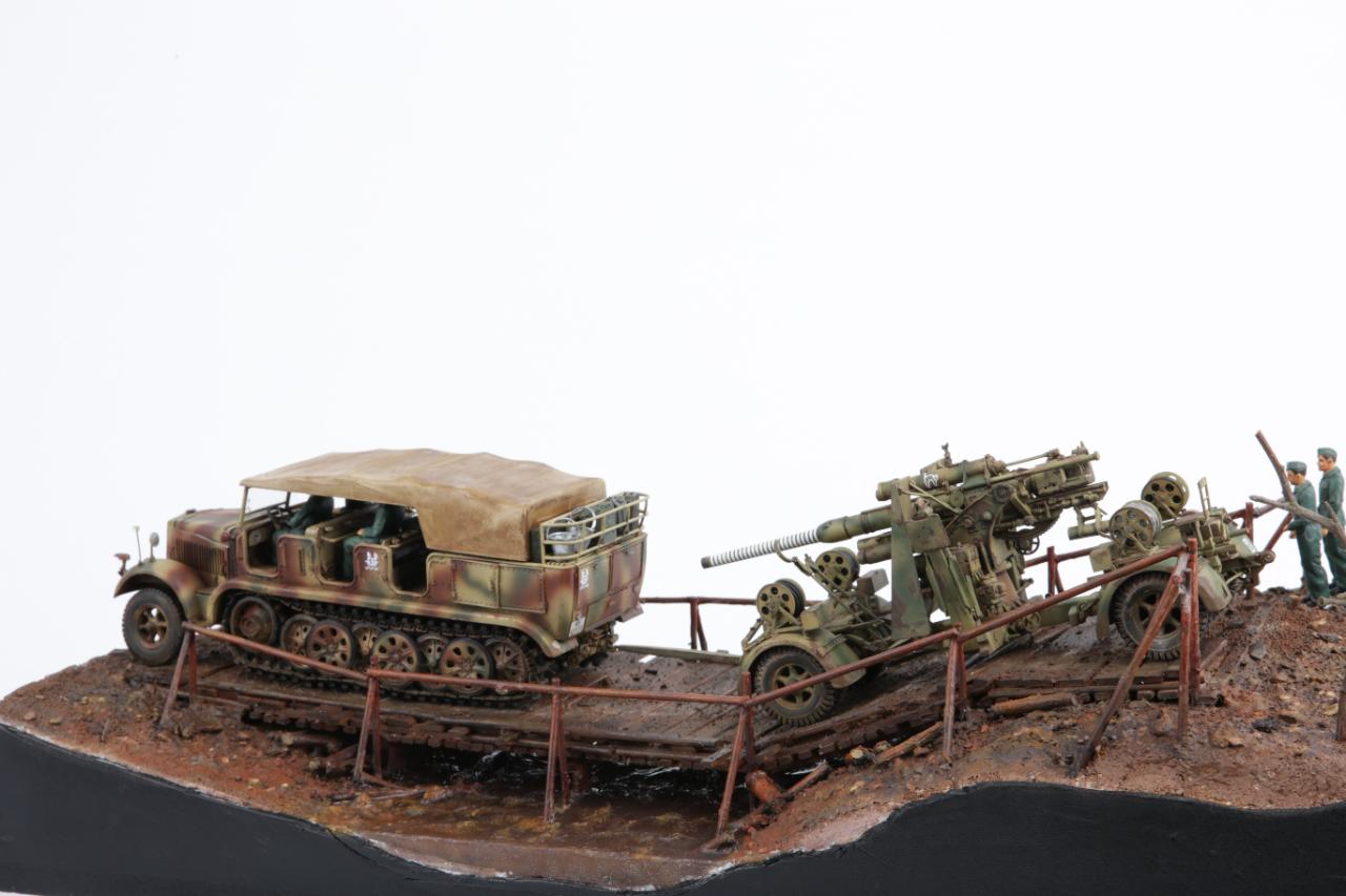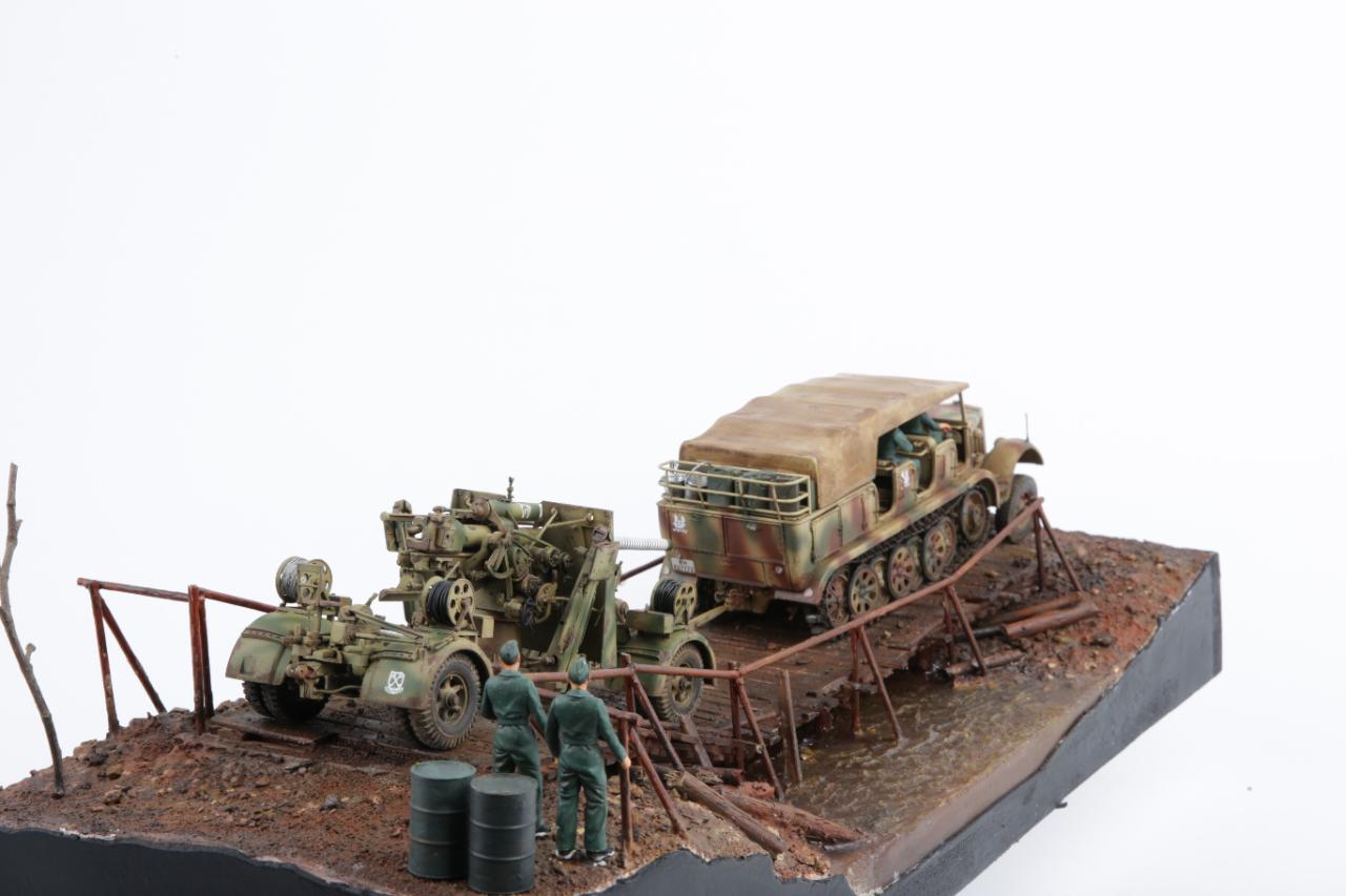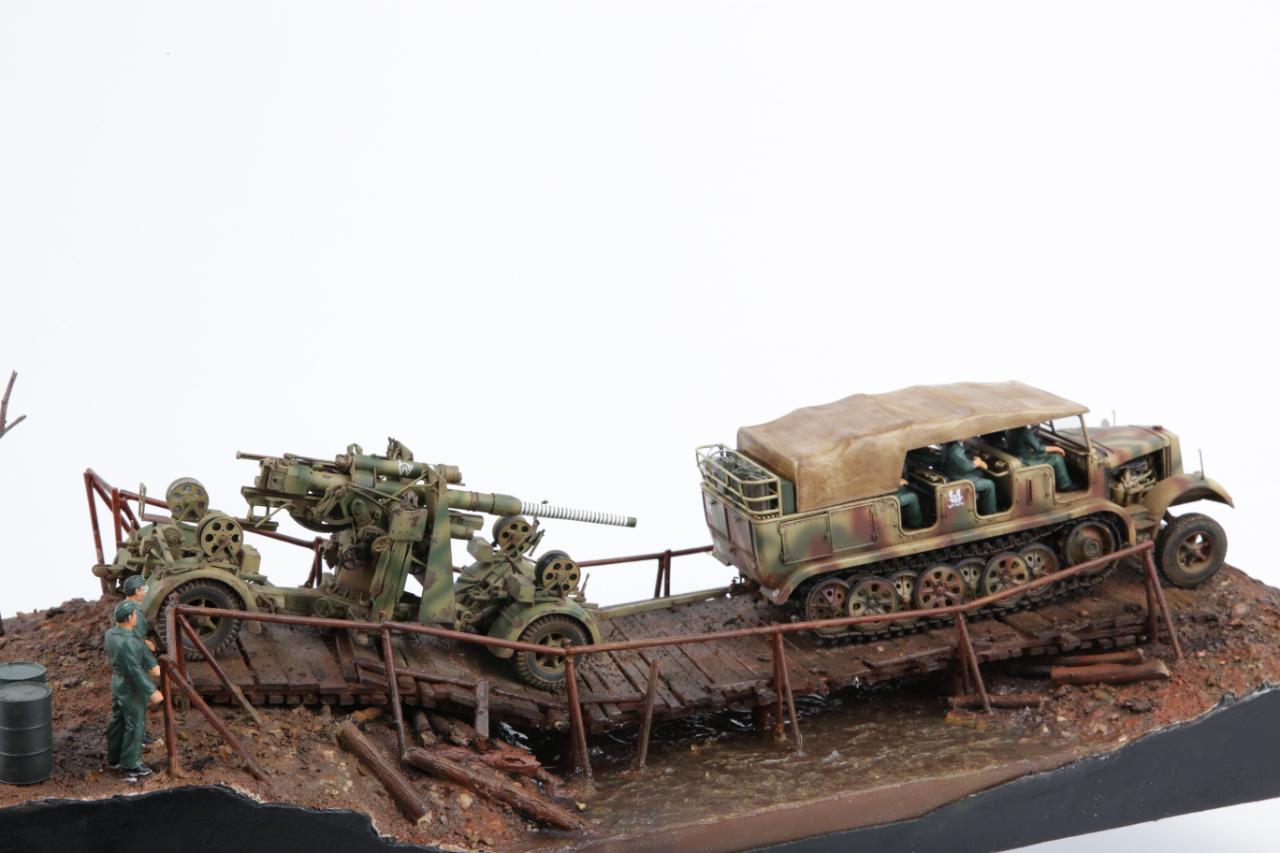 The flak 88mm of the Wehrmacht를 견인하여 임시 부교를 건너 전장으로 향하는Sd.kfz.7 Mittlere Zugkaftwagen 8t을 표현했습니다. 작품을 기획하기전 우연히 유튜브에서 독일군의 영상을 발견하고 제작하게 되었습니다. 처음에는 정보가 부족하여 견인 차량을 Sd Kfz 9, 'FAMO'로 연출하려다가 Sd.kfz.7로 수정하여 제작하게 되었습니다.