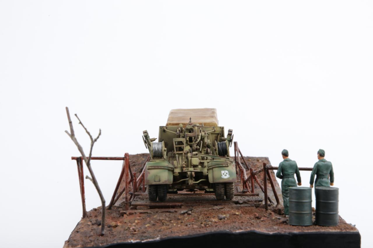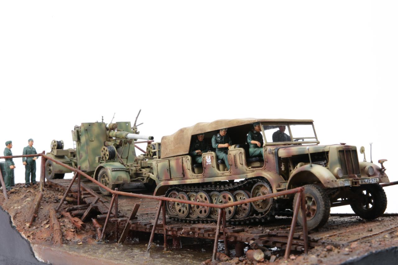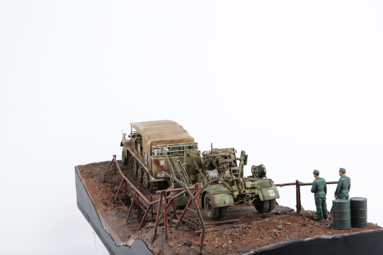 The flak 88mm of the Wehrmacht를 견인하여 임시 부교를 건너 전장으로 향하는Sd.kfz.7 Mittlere Zugkaftwagen 8t을 표현했습니다. 작품을 기획하기전 우연히 유튜브에서 독일군의 영상을 발견하고 제작하게 되었습니다. 처음에는 정보가 부족하여 견인 차량을 Sd Kfz 9, 'FAMO'로 연출하려다가 Sd.kfz.7로 수정하여 제작하게 되었습니다.