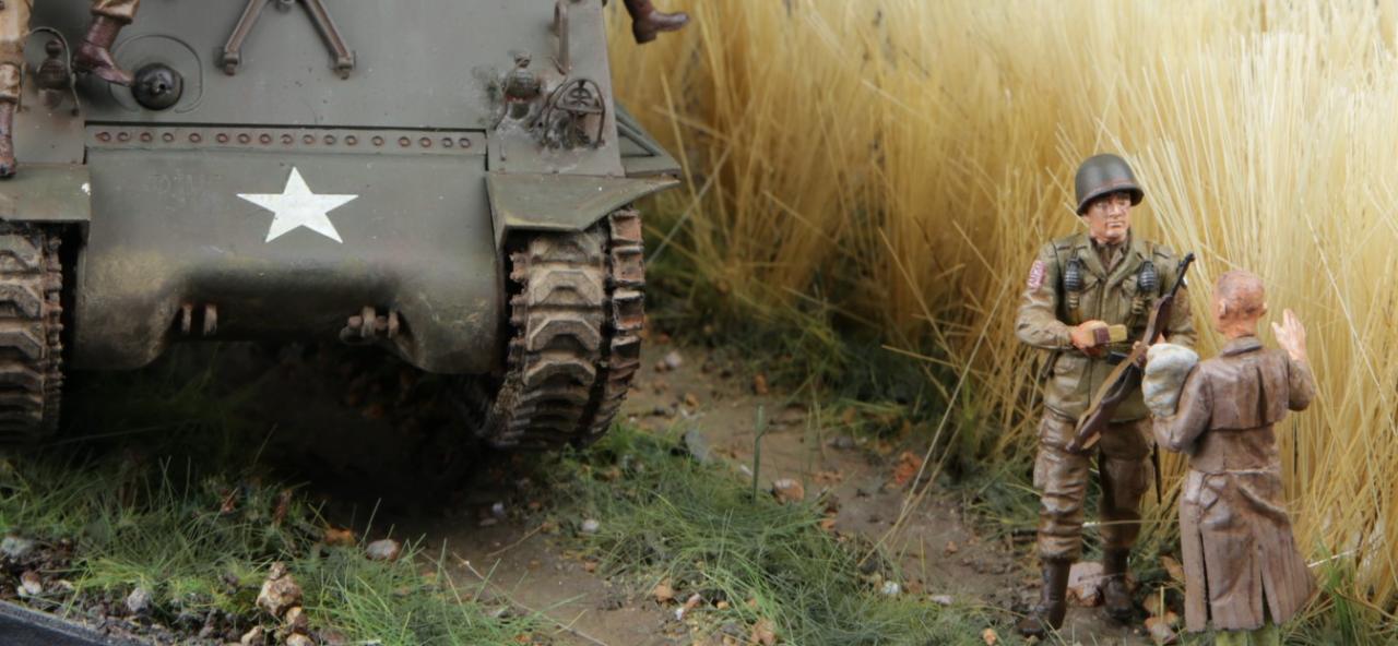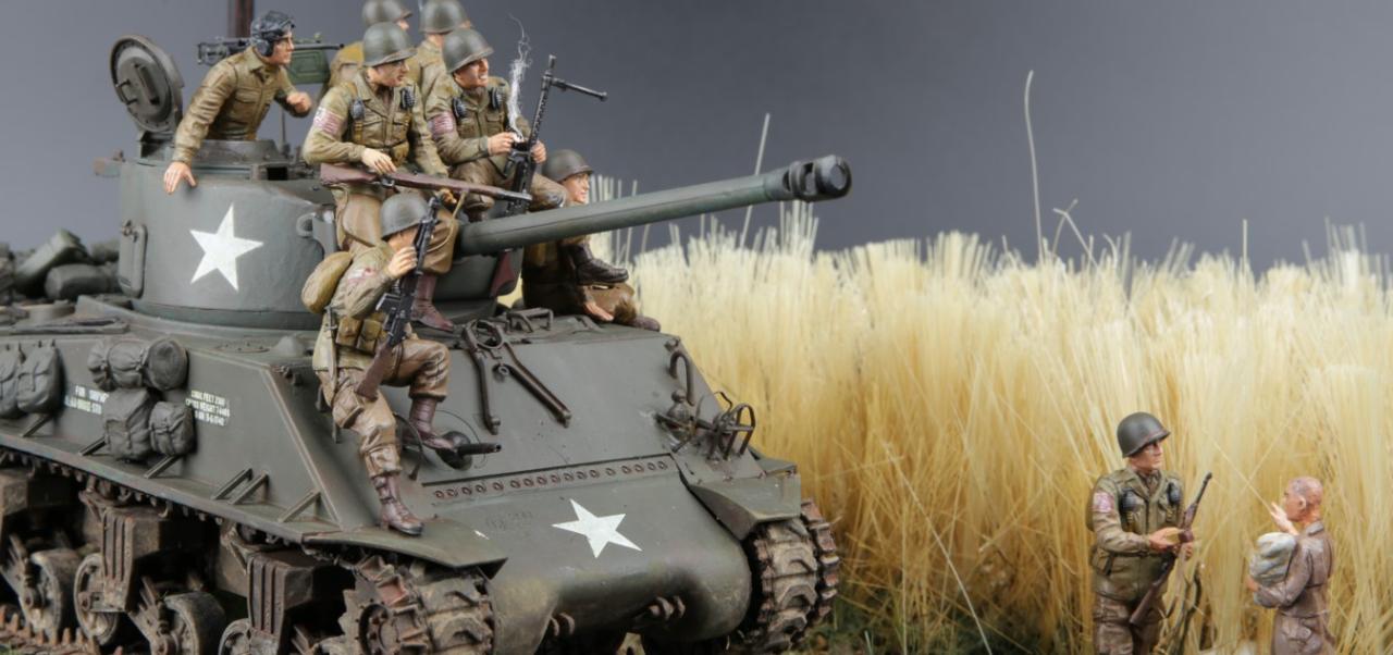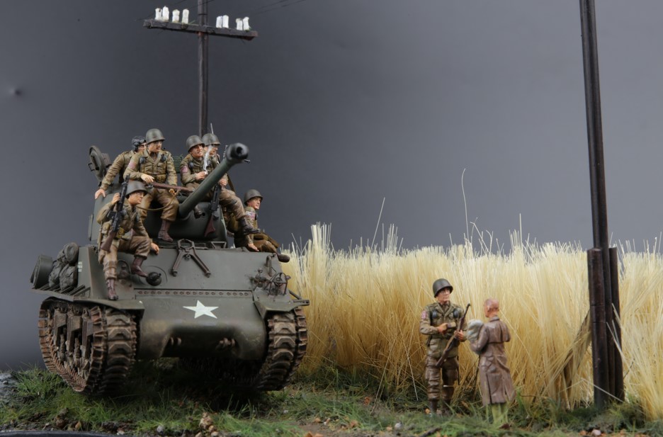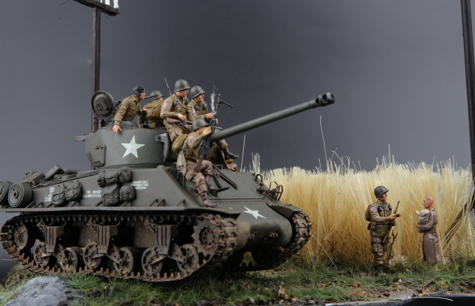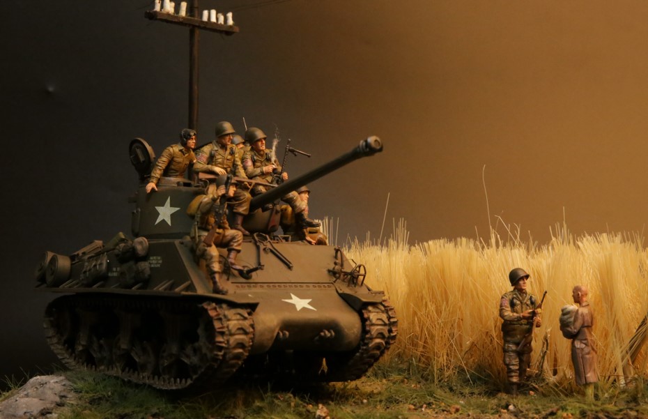 이번 디오라마는 Band of Brothers 4편 마켓가든의 한 장면을 표현하였습니다. 독일군과 잠자리를 한 여성이 네덜란드 시민들에 의해 머리카락이 잘리고 마을에서 쫓겨나 걷고 있는데 탱크를 타고 이동하는 이지 중대원들과 만나게 되어 초코릿을 건네 받는 장면입니다. 우연히 마스터박스의 제품을 발견하고 제작하게 되었습니다. 드라마에서 셔먼 전차는 영국 기갑부대 소속인데 여기에서는 미군 탱크로 표현하였습니다. 마스터박스의 군인 피규어는 디테일 뛰어난 것 같아 작업하기에 좋았습니다. 군복 도색은 Vallejo 아크릴 물감으로 작업했는데 미군 군복 표현을 하기에는 적합했습니다.