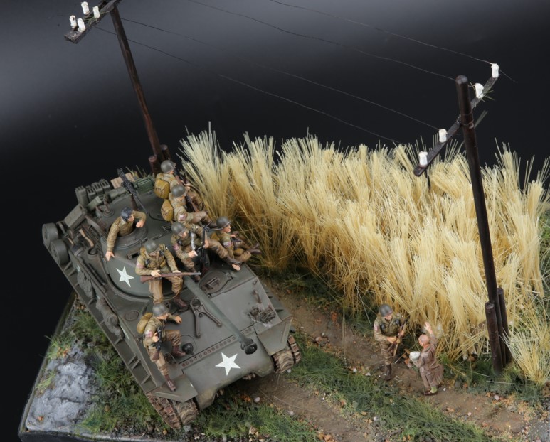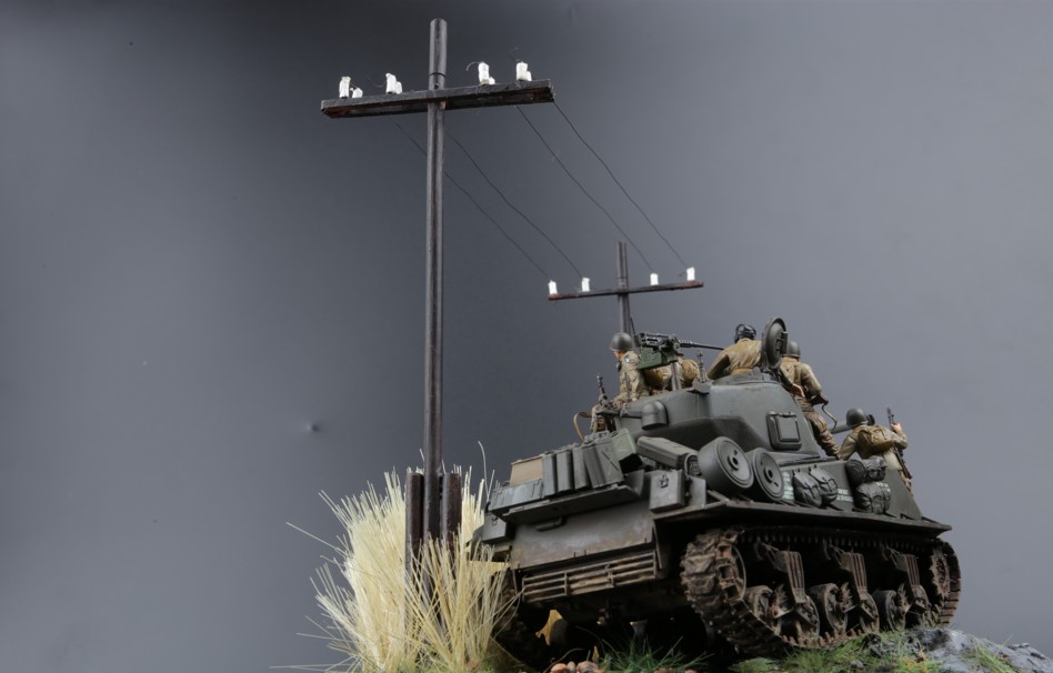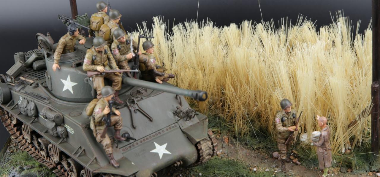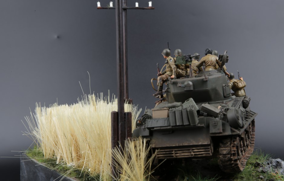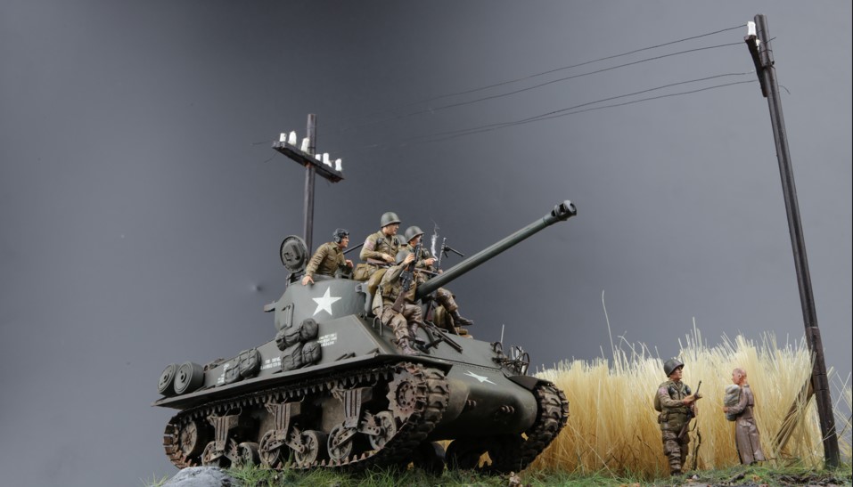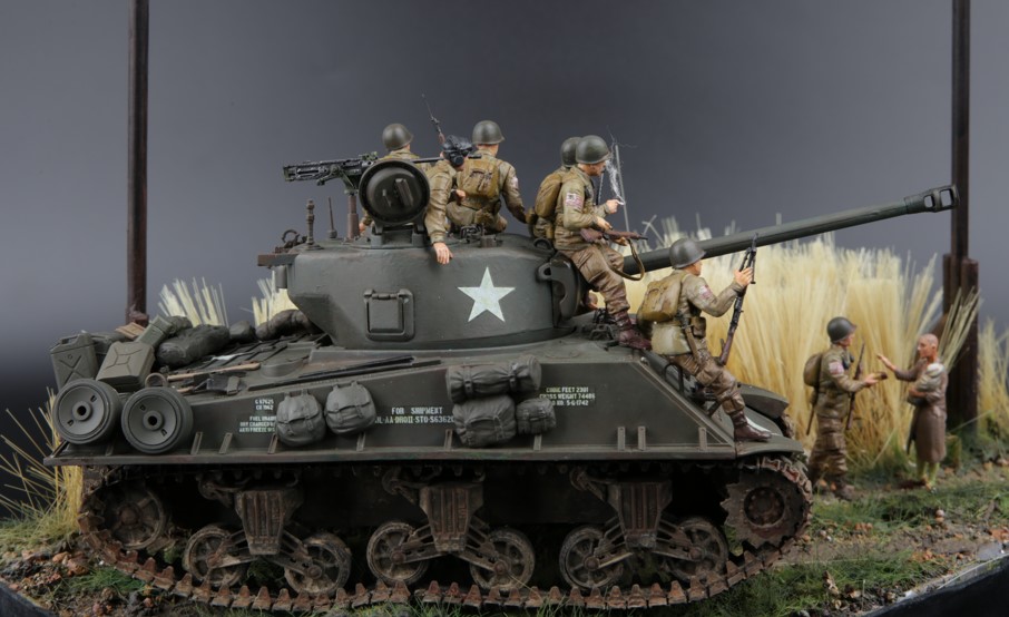 이번 디오라마는 Band of Brothers 4편 마켓가든의 한 장면을 표현하였습니다. 독일군과 잠자리를 한 여성이 네덜란드 시민들에 의해 머리카락이 잘리고 마을에서 쫓겨나 걷고 있는데 탱크를 타고 이동하는 이지 중대원들과 만나게 되어 초코릿을 건네 받는 장면입니다. 우연히 마스터박스의 제품을 발견하고 제작하게 되었습니다. 드라마에서 셔먼 전차는 영국 기갑부대 소속인데 여기에서는 미군 탱크로 표현하였습니다. 마스터박스의 군인 피규어는 디테일 뛰어난 것 같아 작업하기에 좋았습니다. 군복 도색은 Vallejo 아크릴 물감으로 작업했는데 미군 군복 표현을 하기에는 적합했습니다.