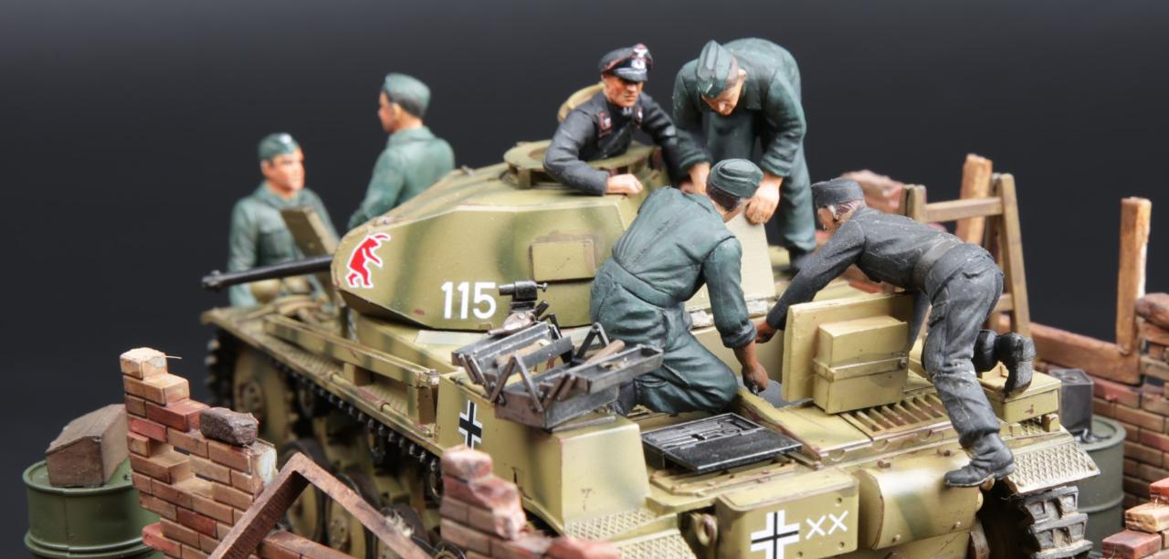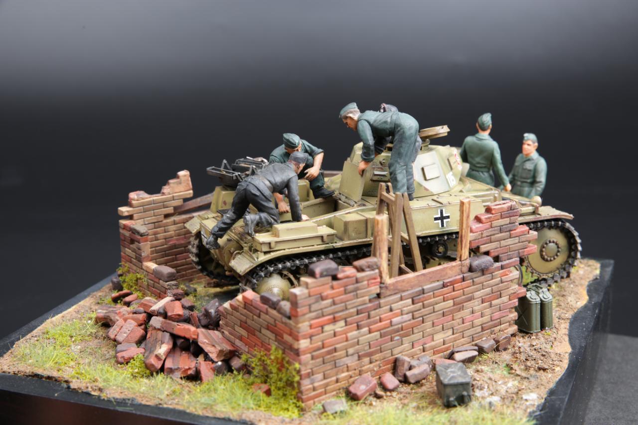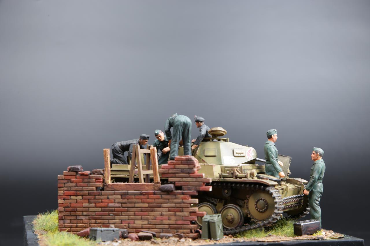 타미야 German Tank Engine Maintenance Crew Set와 Panzer Kampfwagen II Ausf.F/G, FAMO와 아카데미 'Hetzer'에 있는 피규어를 사용하였습니다. 벽돌은 이타렐리 제품을 사용하였고 종이 찰흙과 석고등으로 벽돌을 표현했습니다.
